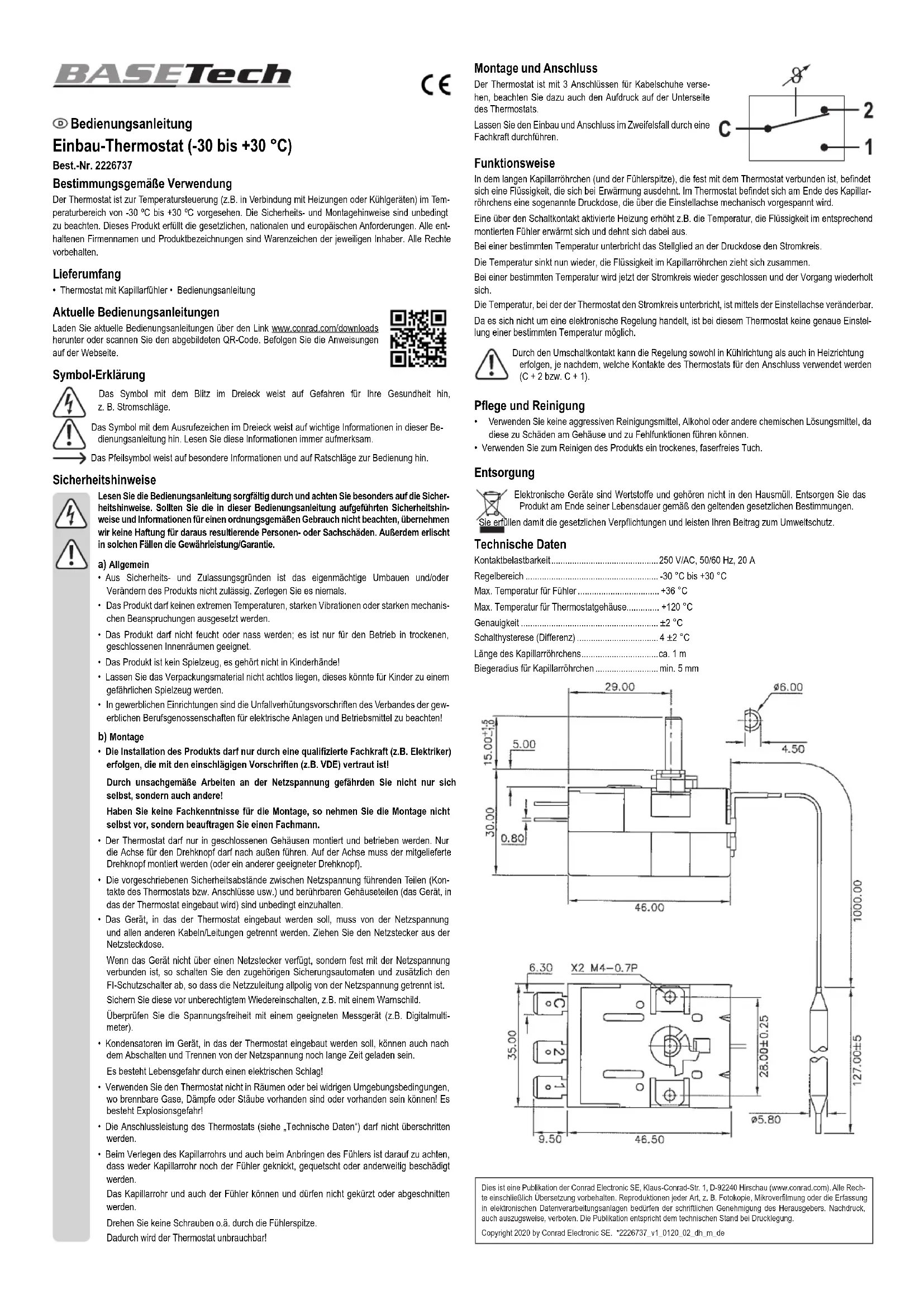 - When routing the capillary tube and also when attaching the sensor, make sure that neither the capillary tube nor the sensor is kinked, pinched or otherwise damaged. Do not shorten or cut off the capillary tube or the sensor. Do not screw any screws or anything similar through the sensor tip. Doing so renders the thermostat unusable! This is a publication by Conrad Electronic SE, Klaus-Conrad-Str. 1, D-92240 Hirschau (www.conrad.com). All rights in- cluding translation reserved. Reproduction by any method, e.g. photocopy, microlming, or the capture in electronic data processing systems require the prior written approval by the editor. Reprinting, also in part, is prohibited. This publication represent the technical status at the time of printing.Copyright 2020 by Conrad Electronic SE. *2226737_v1_0120_02_dh_m_enMontage et raccordement Le thermostat est doté de 3 connexions pour les cosses de câbles ; tenez compte ici de l’inscription au bas du thermostat. En cas de doute, conez le montage et le raccordement à un spécialiste. Fonctionnement Dans le long tube capillaire (et la pointe de la sonde), qui est relié de manière xe au thermostat, se trouve un liquide qui se dilate lorsqu’il est chauffé. À l’extrémité du tube capillaire dans le thermostat se trouve une sorte de capsule anéroïde qui se détend mécaniquement via l’axe de réglage. Un radiateur activé à l’aide du contact de commutation augmente par exemple la température, puis le liquide dans la sonde installée est chauffé et se dilate ensuite. À une certaine température, l’actionneur de la capsule anéroïde coupe le circuit électrique. La température baisse alors et le liquide dans le tube capillaire se rétracte. À une certaine température, le circuit électrique est de nouveau fermé et le processus se répète. La température à laquelle le thermostat coupe le circuit électrique est réglable avec l’axe de réglage. Étant donné qu’il ne s’agit pas d’une régulation de type électronique, ce thermostat ne permet pas le réglage exact d’une température précise. Le contact à deux directions permet une régulation autant pour la réfrigération que pour le chauffage, selon les contacts du thermostat utilisés lors du raccordement (C + 2 ou C + 1). Entretien et nettoyage