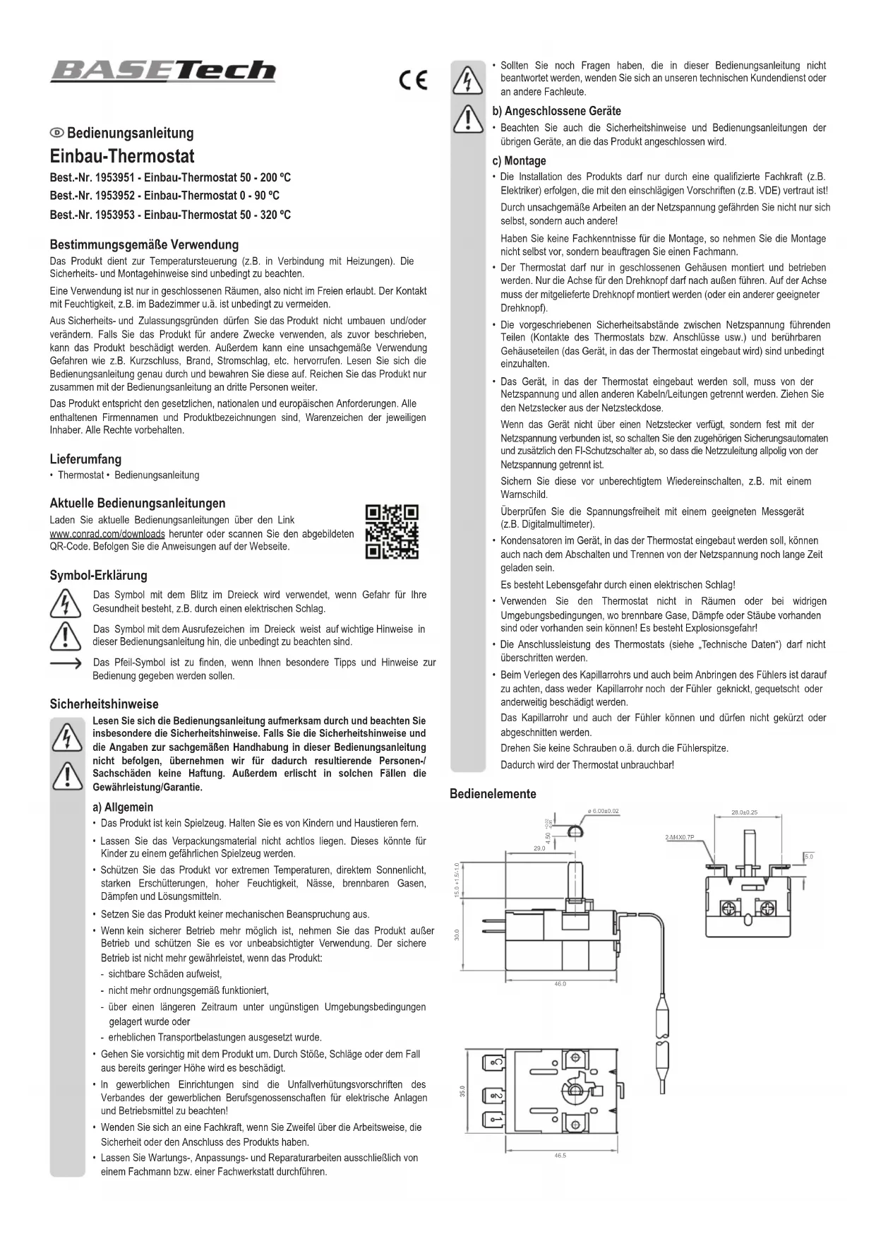 28.0±0.2515.0 +1.5/-1.0 Mode d’emploi Thermostat intégré Nº de commande 1953951 - Thermostat intégré de 50 - 200 ºC Nº de commande 1953952 - Thermostat intégré de 0 - 90 ºC Nº de commande 1953953 - Thermostat intégré de 50 - 320 ºC Utilisation prévue Le produit est utilisé pour la régulation de la température (par ex. pour les appareils de chauffage). Il faut impérativement tenir compte des consignes de sécurité et de montage de l’appareil. L’utilisation est uniquement autorisée en intérieur, dans des locaux fermés ; l’utilisation en plein air est interdite. Évitez impérativement tout contact avec l’humidité, par ex. dans la salle de bains, etc. Pour des raisons de sécurité et d’homologation, toute transformation et/ou modication du produit est interdite. Si vous utilisez le produit à des ns autres que celles décrites précédemment, vous risquez de l’endommager. Par ailleurs, une utilisation incorrecte peut être source de dangers tels que les courts-circuits, les incendies, l’électrocution. Lisez attentivement le mode d’emploi et conservez- le. Ne transmettez le produit à un tiers qu’accompagné de son mode d’emploi. Le produit est conforme aux exigences des directives européennes et nationales en vigueur. Tous les noms d’entreprises et toutes les appellations de produits indiqués sont des marques déposées de leurs propriétaires respectifs. Tous droits réservés. Contenu