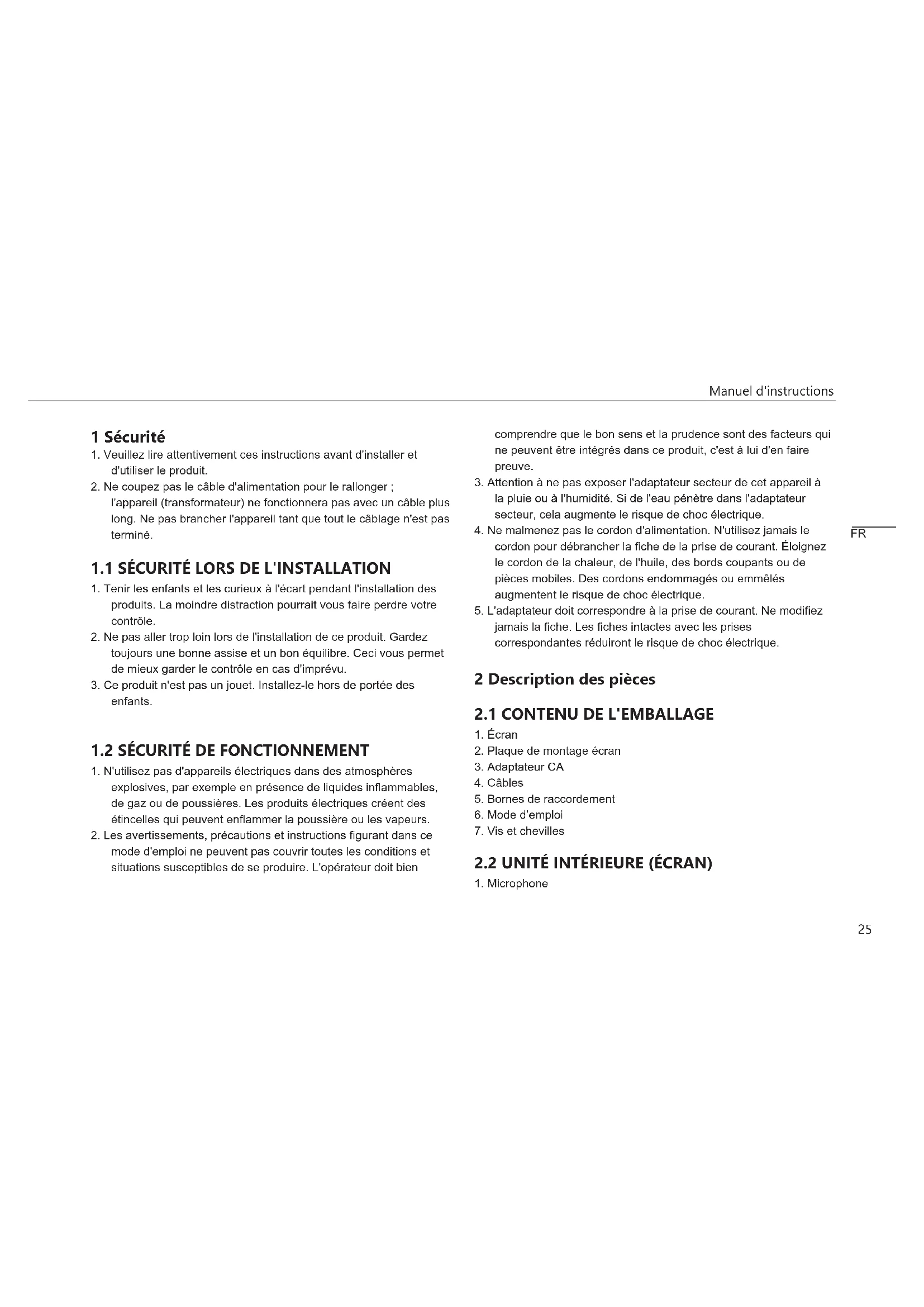 - Le microphone peut être obstrué ou endommagé. Nettoyer soigneusement avec un chiffon doux et humide. 7 Spécifications Écran Taille d'écran 7"(Diagonale) pouces Configuration de couleur R.G.B.delta Système vidéo PAL/NTSC Pixels effectifs 800X3(RGB)X480 Courant de Consommation 450±200 mA Température de fonctionnement -1 °C ~ +50 °C Humidité de fonctionnement 85%(Max) Tension d'alimentation DC 15 V 1A 8 Environnement Cet appareil ne doit pas être jeté avec les déchets ménagers à la fin de sa durée de vie, il doit être remis à un centre de recyclage pour les appareils électriques et électroniques. Ce symbole sur l'appareil, le manuel d'utilisation et l'emballage attire votre attention sur un point important. Les matériaux utilisés dans cet appareil sont recyclables. En recyclant vos appareils, vous contribuez de manière significative à la protection de notre environnement. Renseignez-vous auprès des autorités locales pour connaître les centres de collecte des déchets. Support Vous trouverez toutes les informations disponibles et les pièces de rechange sur www.chbyron.eu Veuillez lire le manuel avant usage et le ranger soigneusement pour son usage ultérieur et la maintenance.Manuel d'instructions