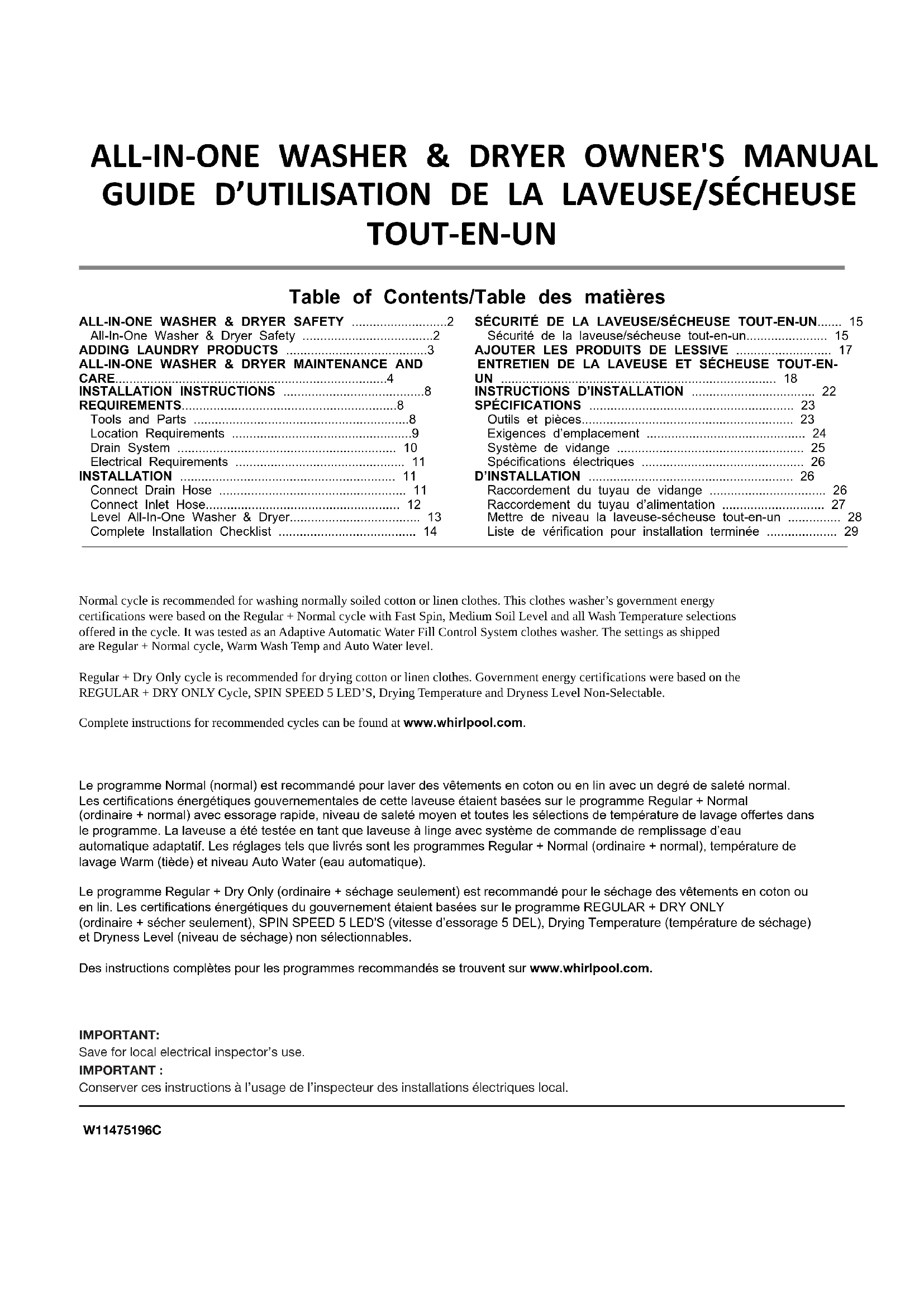 - Liste de vérification pour installation terminée Normal cycle is recommended for washing normally soiled cotton or linen clothes. This clothes washer’s government energy certifications were based on the Regular + Normal cycle with Fast Spin, Medium Soil Level and all Wash Temperature selections offered in the cycle. It was tested as an Adaptive Automatic Water Fill Control System clothes washer. The settings as shipped are Regular + Normal cycle, Warm Wash Temp and Auto Water level. Regular + Dry Only cycle is recommended for drying cotton or linen clothes. Government energy certifications were based on the REGULAR + DRY ONLY Cycle, SPIN SPEED 5 LED’S, Drying Temperature and Dryness Level Non-Selectable. Complete instructions for recommended cycles can be found at www.whirlpool.com. W11475196C IMPORTANT: Save for local electrical inspector’s use. IMPORTANT : Conserver ces instructions à l’usage de l’inspecteur des installations électriques local. Le programme Normal (normal) est recommandé pour laver des vêtements en coton ou en lin avec un degré de saleté normal. Les certifications énergétiques gouvernementales de cette laveuse étaient basées sur le programme Regular + Normal (ordinaire + normal) avec essorage rapide, niveau de saleté moyen et toutes les sélections de température de lavage offertes dans le programme. La laveuse a été testée en tant que laveuse à linge avec système de commande de remplissage d’eau automatique adaptatif. Les réglages tels que livrés sont les programmes Regular + Normal (ordinaire + normal), température de lavage Warm (tiède) et niveau Auto Water (eau automatique). Le programme Regular + Dry Only (ordinaire + séchage seulement) est recommandé pour le séchage des vêtements en coton ou en lin. Les certifications énergétiques du gouvernement étaient basées sur le programme REGULAR + DRY ONLY (ordinaire + sécher seulement), SPIN SPEED 5 LED'S (vitesse d’essorage 5 DEL), Drying Temperature (température de séchage) et Dryness Level (niveau de séchage) non sélectionnables. Des instructions complètes pour les programmes recommandés se trouvent sur www.whirlpool.com.2 p. 29