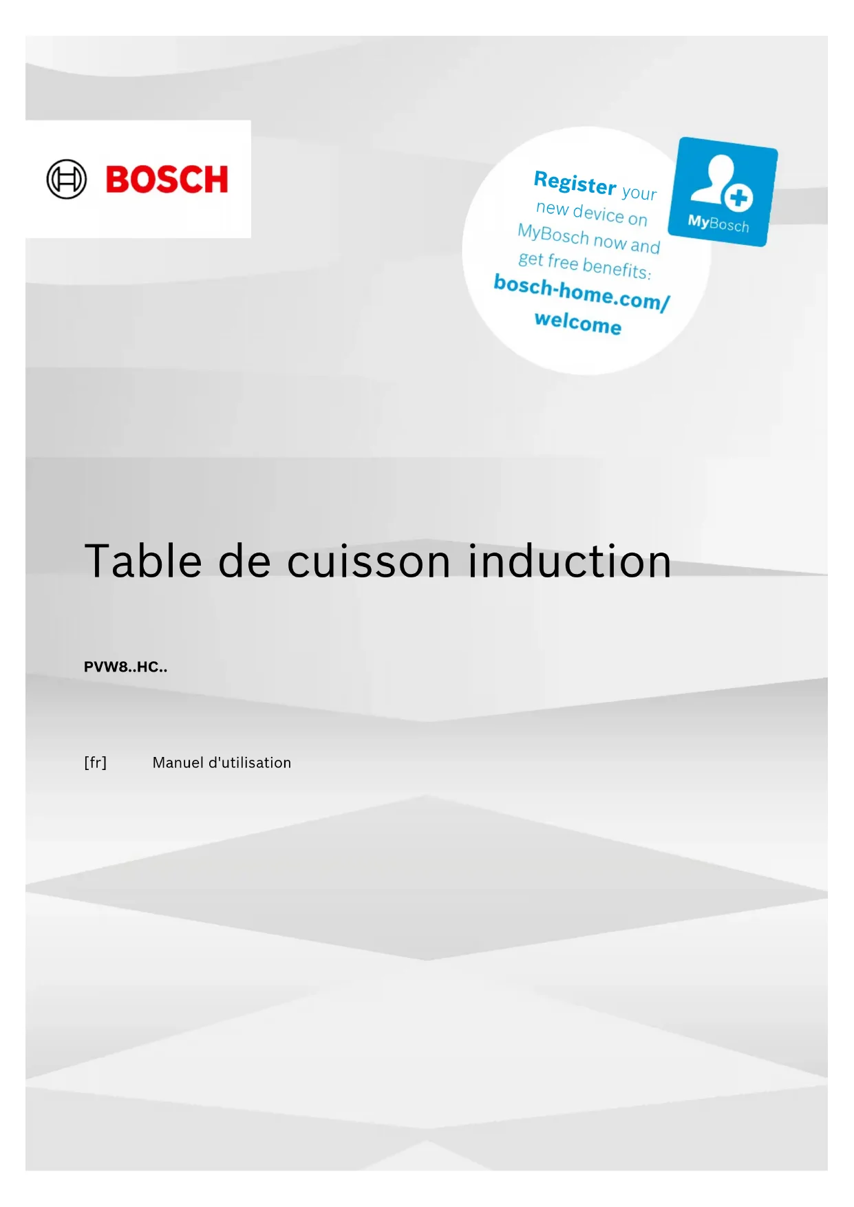 niveau de puissance recommandé et laisser frémir environ 50min. à un niveau de puissance réduit. ¡ Casserole de 16cm de Ø sans couvercle, ingré- dients: 190g de riz rond, 90g de sucre, 750ml de lait à 3,5% de matière grasse et 1g de sel – Chauffer: durée d'environ 5 min. 30sec., niveau de puissance 8.5 – Mijoter: niveau de puissance 3 ¡ Casserole de 20cm de Ø sans couvercle, ingré- dients: 250g de riz rond, 120g de sucre, 1l de lait à 3,5% de matière grasse et 1,5g de sel – Chauffer: durée d'environ 5 min. 30sec., niveau de puissance 8.5 – Mijoter: niveau de puissance 2.5 29.7 Cuire du riz Recette selon DIN 44550 Température de l’eau: 20°C ¡ Casserole de 16cm de Ø avec couvercle, ingré- dients: 125g de riz rond, 300g d'eau et une pin- cée de sel – Chauffer: durée d'environ 2min. 30sec., niveau de puissance 9 – Mijoter: niveau de puissance 2 ¡ Casserole de 20cm de Ø avec couvercle, ingré- dients: 250 g de riz rond, 600g d'eau et une pin- cée de sel – Chauffer: durée d'environ 2min. 30sec., niveau de puissance 9 – Mijoter: niveau de puissance 2.5 29.8 Faire rôtir du filet de porc Température initiale du filet de porc: 7°C ¡ Poêle de 24cm de Ø sans couvercle, ingrédients: 3filets de porc, poids total d'environ 300g, 1cm d'épaisseur et 15g d'huile de tournesol – Chauffer: durée d'environ 1min. 30sec., niveau de puissance 9 – Mijoter: niveau de puissance 7 29.9 Préparer des crêpes Recette selon DIN EN 60350-2 ¡ Poêle de 24cm de Ø sans couvercle, ingrédients: 55 ml de pâte par crêpe – Chauffer: durée 1min. 30sec., niveau de puis- sance 9 – Mijoter: niveau de puissance 7 29.10 Frire des frites surgelées ¡ Casserole Ø 20cm sans couvercle: ingrédients: 2 l d'huile de tournesol. Pour chaque friture de conti- nuité: 200 g de frites surgelées, 1 cm d'épaisseur. – Chauffer: niveau de puissance 9, jusqu'à ce que l'huile atteigne une température de 180°C. – Mijoter: niveau de puissance 9Thank you for buying a Bosch Home Appliance! Register your new device on MyBosch now and profit directly from: