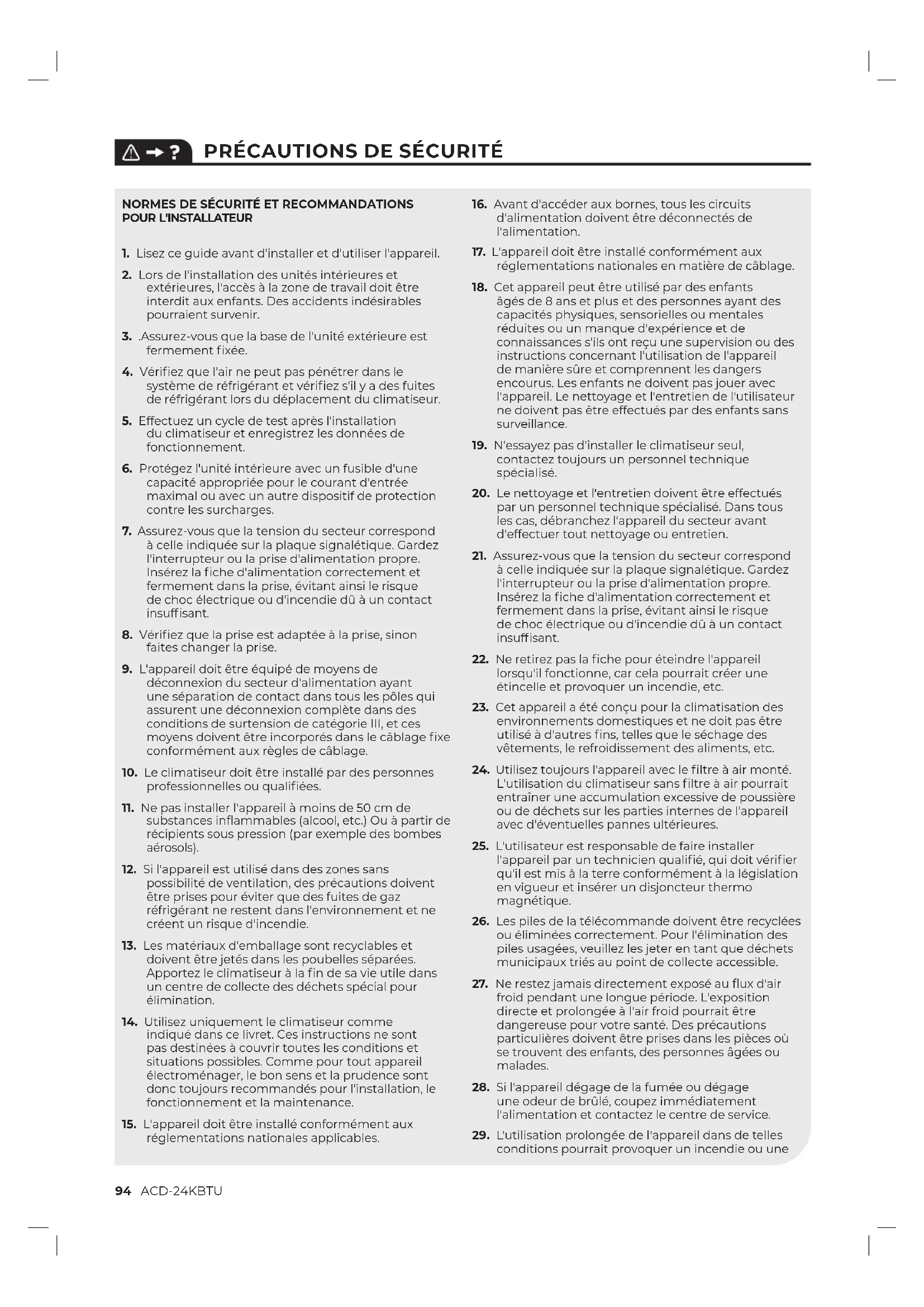 - La forme et la position des boutons et indicateurs peuvent varier selon le modèle, mais leur fonction est la même.94 ACD-24KBTU
