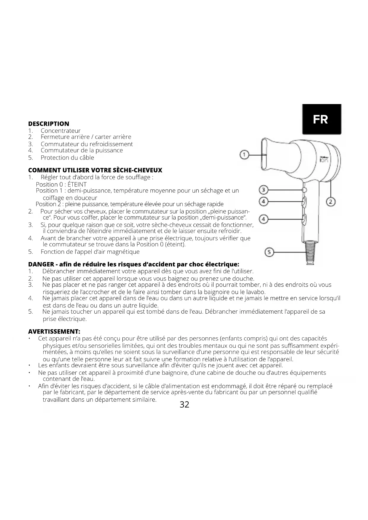 Position0:ÉTEINT Position1:demi-puissance,températuremoyennepourunséchageetun coiageendouceur Position2:pleinepuissance,températureélevéepourunséchagerapide