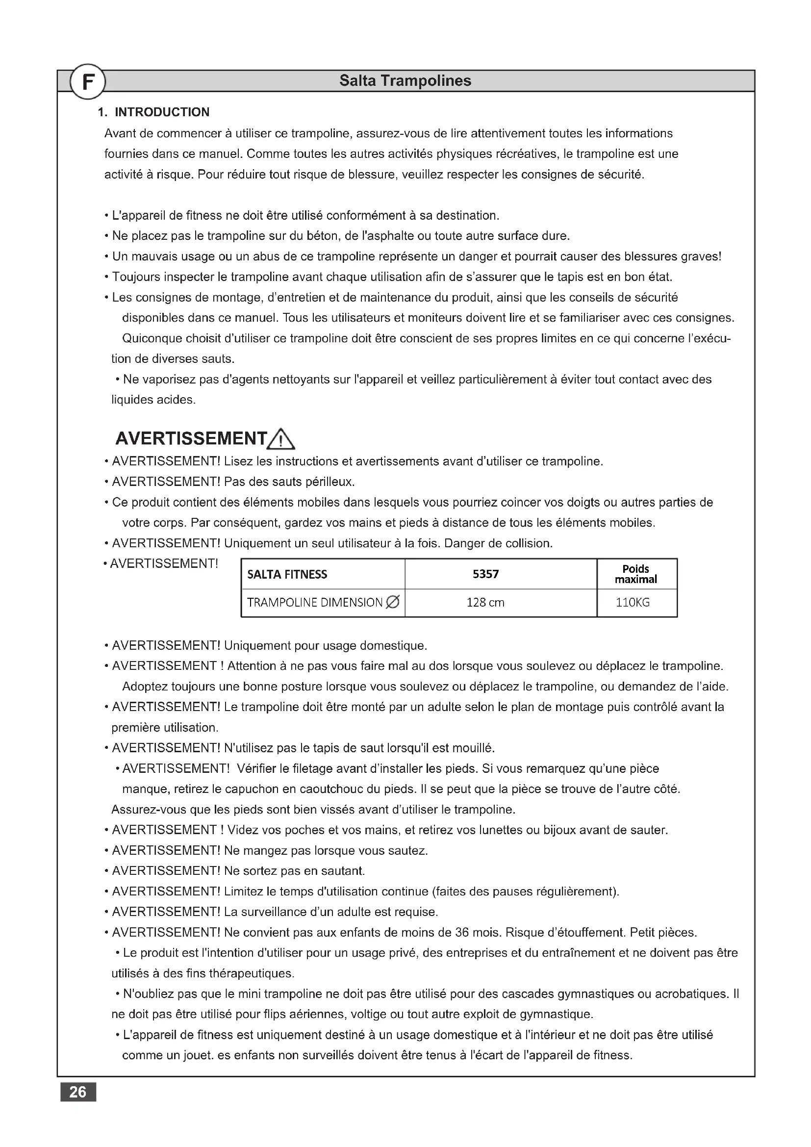 Les mouvements réalisés pendant un entraînement avec un trampoline peuvent être inhabituels pour votre corps au début. Par conséquent, veuillez faire attention si vous utilisez le trampoline pour la première fois. Veuillez consulter un médecin si vous ressentez une douleur pendant votre entraîne- ment. Un entraînement excessif ou mal effectué peut s’avérer dangereux pour votre santé. Salta Trampolines ne se tiendra aucunement responsable des blessures ou dommages consécutifs pouvant résulter des exercices. Sauteurs