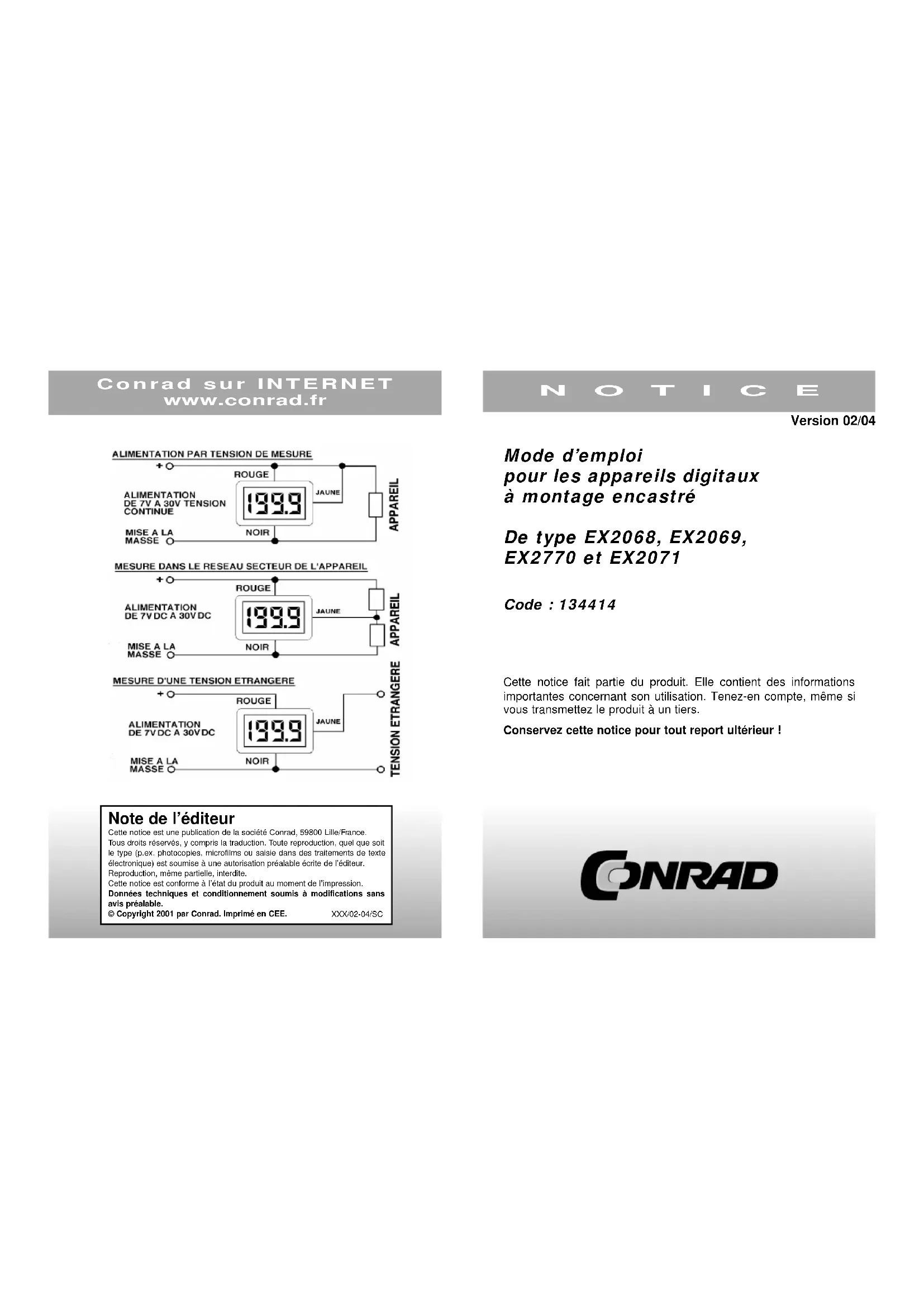 Mode d’emploi pour les appareils digitaux à montage encastré De type EX2068, EX2069, EX2770 et EX2071 Code : 134414 Cette notice fait partie du produit. Elle contient des informationsimportantes concernant son utilisation. Tenez-en compte, même sivous transmettez le produit à un tiers.Conservez cette notice pour tout report ultérieur ! NOTICE Conrad sur INTERNET www.conrad.fr Note de l’éditeur Cette notice est une publication de la société Conrad, 59800 Lille/France. Tous droits réservés, y compris la traduction. Toute reproduction, quel que soit le type (p.ex. photocopies, microfilms ou saisie dans des traitements de texte électronique) est soumise à une autorisation préalable écrite de l’éditeur. Reproduction, même partielle, interdite. Cette notice est conforme à l’état du produit au moment de l’impression. Données techniques et conditionnement soumis à modifications sans avis préalable. © Copyright 2001 par Conrad. Imprimé en CEE.