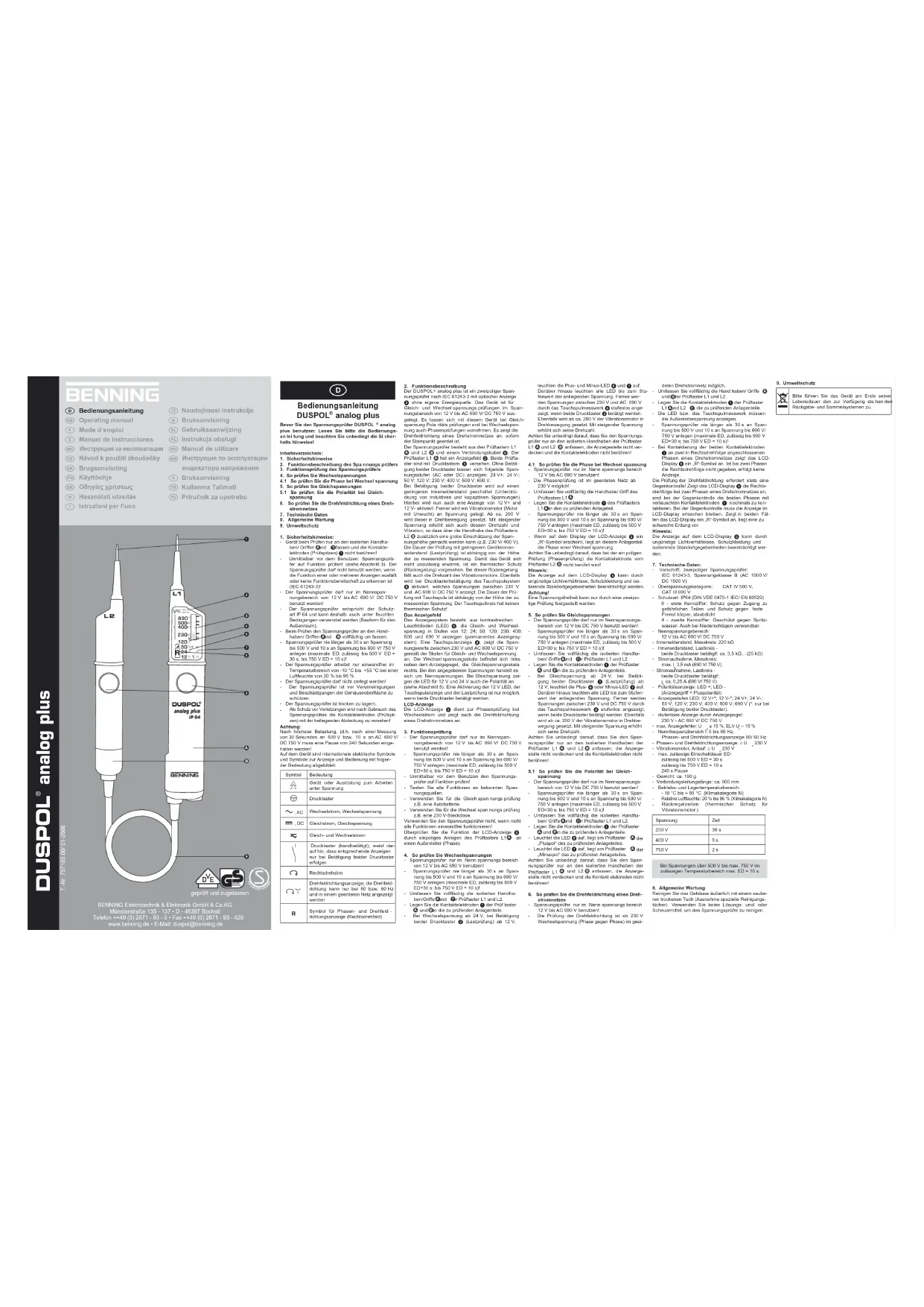 Retrouvez gratuitement la notice de l'appareil Duspol Analog Plus BENNING au format PDF.