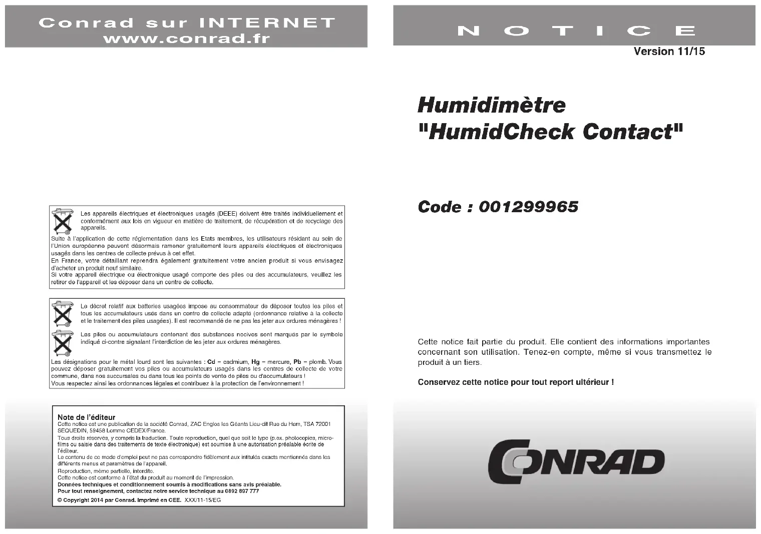 Humidimètre "HumidCheck Contact" Code : 001299965 Cette notice fait partie du produit. Elle contient des informations importantes concernant son utilisation. Tenez-en compte, même si vous transmettez le produit à un tiers. Conservez cette notice pour tout report ultérieur ! NOTICE Conrad sur INTERNET www.conrad.fr Version 11/15 Les appareils électriques et électroniques usagés (DEEE) doivent être traités individuellement et conformément aux lois en vigueur en matière de traitement, de récupération et de recyclage des appareils.Suite à l’application de cette réglementation dans les Etats membres, les utilisateurs résidant au sein de l’Union européenne peuvent désormais ramener gratuitement leurs appareils électriques et électroniques usagés dans les centres de collecte prévus à cet effet.En France, votre détaillant reprendra également gratuitement votre ancien produit si vous envisagez d’acheter un produit neuf similaire.Si votre appareil électrique ou électronique usagé comporte des piles ou des accumulateurs, veuillez les retirer de l’appareil et les déposer dans un centre de collecte.Le décret relatif aux batteries usagées impose au consommateur de déposer toutes les piles et tous les accumulateurs usés dans un centre de collecte adapté (ordonnance relative à la collecte et le traitement des piles usagées). Il est recommandé de ne pas les jeter aux ordures ménagères !Les piles ou accumulateurs contenant des substances nocives sont marqués par le symbole indiqué ci-contre signalant l’interdiction de les jeter aux ordures ménagères. Les désignations pour le métal lourd sont les suivantes : Cd = cadmium, Hg = mercure, Pb = plomb. Vous pouvez déposer gratuitement vos piles ou accumulateurs usagés dans les centres de collecte de votre commune, dans nos succursales ou dans tous les points de vente de piles ou d'accumulateurs !Vous respectez ainsi les ordonnances légales et contribuez à la protection de l’environnement !Note de l’éditeurCette notice est une publication de la société Conrad, ZAC Englos les Géants Lieu-dit Rue du Hem, TSA 72001 SEQUEDIN, 59458 Lomme CEDEX/France.Tous droits réservés, y compris la traduction. Toute reproduction, quel que soit le type (p.ex. photocopies, micro-films ou saisie dans des traitements de texte électronique) est soumise à une autorisation préalable écrite de l’éditeur.Le contenu de ce mode d'emploi peut ne pas correspondre fidèlement aux intitulés exacts mentionnés dans les différents menus et paramètres de l'appareil.Reproduction, même partielle, interdite.Cette notice est conforme à l’état du produit au moment de l’impression.Données techniques et conditionnement soumis à modifications sans avis préalable.Pour tout renseignement, contactez notre service technique au 0892 897 777 © Copyright 2014 par Conrad. Imprimé en CEE. XXX/11-15/EG2 3 Le processus de mesure capacitif permet de mesurer l’humidité dans le béton, le bois, la chape de ciment et bien d’autres matériaux sans le moindre dommage. Spécificités - Affichage rapide de la teneur en humidité des matériaux - Profondeur de pénétration : 20 à 40 mm environ - Affichage du déchargement de la pile - Désactivation automatique - Fonction MAX/MIN - Fonction mesure et Hold - Ecran LCD avec rétroéclairage blanc Caractéristiques techniques Type de capteur : ... Sphéroïde métallique Plage de mesure : ............. 0 à 100 Résolution max. : ................... 1 Pile : ........................ Pile 9 V Dimensions : .........180 x 45 x 35 mm Poids : ........................180 g Aperçu de la façade avant