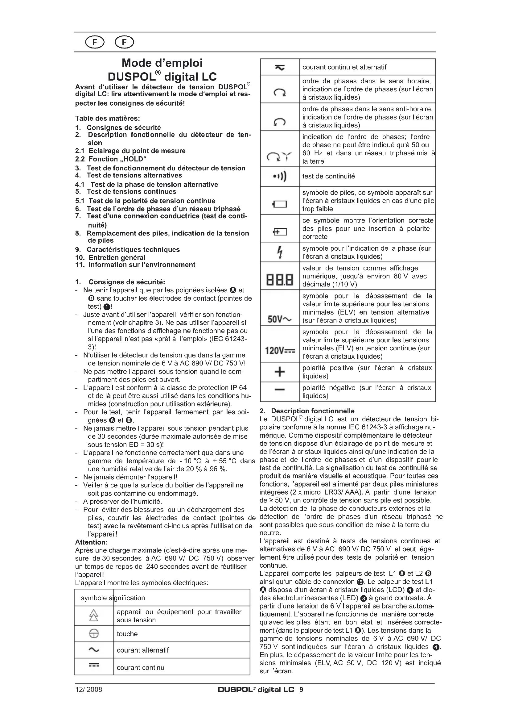 digital LC est un détecteur de tension bi- polaire conforme à la norme IEC 61243-3 à affichage nu- mérique. Comme dispositif complémentaire le détecteur de tension dispose d‘un éclairage de point de mesure et de l‘écran à cristaux liquides ainsi qu‘une indication de la phase et de l‘ordre de phases et d’un dispositif pour le test de continuité. La signalisation du test de continuité se produit de manière visuelle et acoustique. Pour toutes ces fonctions, l’appareil est alimenté par deux piles miniatures intégrées (2 x micro LR03/ AAA). A partir d’une tension de ≥ 50 V, un contrôle de tension sans pile est possible. La détection de la phase de conducteurs externes et la détection de l’ordre de phases d’un réseau triphasé ne sont possibles que sous condition de mise à la terre du neutre. L‘appareil est destiné à tests de tensions continues et alternatives de 6 V à AC 690 V/ DC 750 V et peut éga- lement être utilisé pour des tests de polarité en tension continue. L‘appareil comporte les palpeurs de test L1 A et L2 B ainsi qu‘un câble de connexion . Le palpeur de test L1 A dispose d‘un écran à cristaux liquides (LCD) 4 et dio- des électroluminescentes (LED) 3 à grand contraste. À partir d’une tension de 6 V l’appareil se branche automa- tiquement. L’appareil ne fonctionne de manière correcte qu’avec les piles étant en bon état et insérées correcte- ment (dans le palpeur de test L1 A). Les tensions dans la gamme de tensions nominales de 6 V à AC 690 V/ DC 750 V sont indiquées sur l’écran à cristaux liquides 4. En plus, le dépassement de la valeur limite pour les ten- sions minimales (ELV, AC 50 V, DC 120 V) est indiqué sur l’écran.12/ 2008 DUSPOL