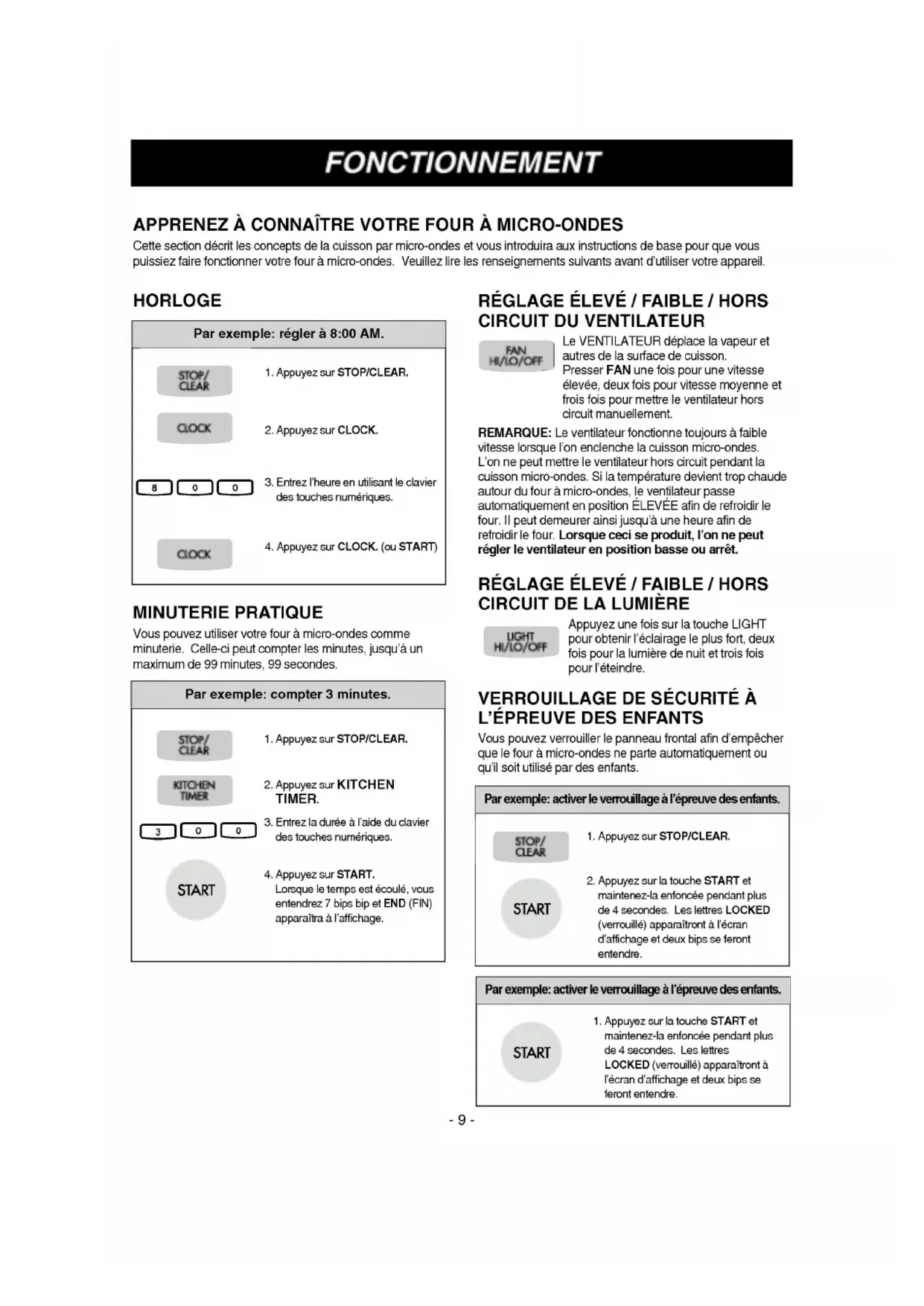 MICRO-ONDES Cettesectiondecritlesconceptsdelacuissonparmicro-ondeset vous introduira aux instructionsdebasepourque vous puissiez fairefonctionnervotrefouramicro-ondes.Veuillezlireles renseignements suivantsavantd'utiliservotre appareil. HORLOGE MINUTERIE PRATIQUE Vouspouvezutiliservotrefouramicro-ondes comme minuterie.Celle-cipeutcompterlesminutes, jusqu'a