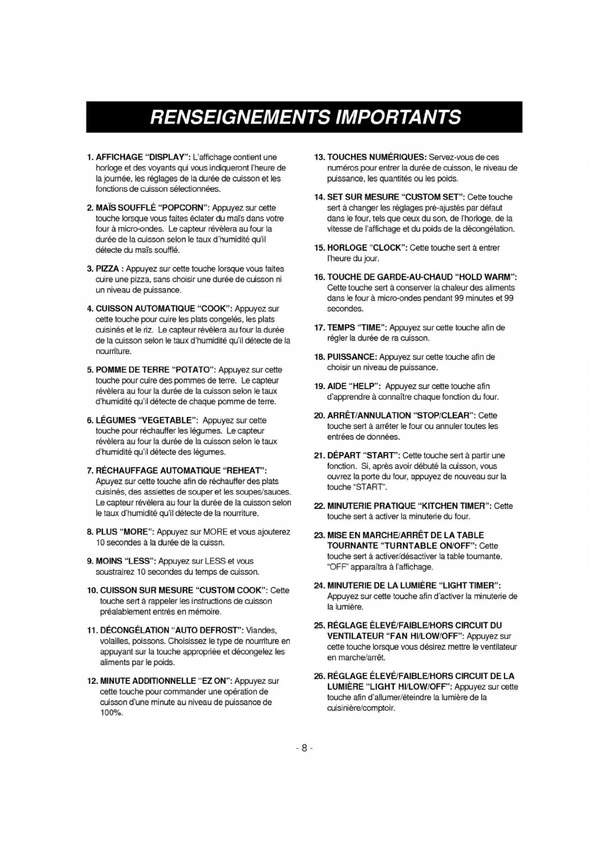 8-8- 1.AFFICHAGE"DISPLAY": L'affichage contientune horloge etdes voyants qui vous indiqueront l'heuredela journee, les reglages deladureedecuissonetlesfonctionsdecuissonselectionnees.2. MAIS SOUFFLE "POPCORN": Appuyez surcettetouche lorsque vousfaiteseclaterdumaisdansvotrefouramicro-ondes.Le capteur reveleraaufourladureedelacuissonselonletauxd'humidite qu'il detectedumaissouffle.3.PIZZA: Appuyez surcettetouche lorsque vousfaitescuireune pizza, sanschoisirunedureedecuissonniunniveaude puissance. 4.CUISSON AUTOMATIQUE "COOK": Appuyez surcettetouche pour cuireles plats congeles, les plats cuisinesetleriz.Le capteur reveleraaufourladureedelacuissonselonletauxd'humidite qu'il detectedelanourriture.5.POMMEDETERRE"POTATO": Appuyez surcettetouche pour cuiredes pommes deterre.Le capteur reveleraaufourladureedelacuissonselonletauxd'humidite qu'il detectede chaque pomme deterre.6. LEGUMES "VEGETABLE": Appuyez surcettetouche pour rechaufferles legumes. capteur reveleraaufourladureedelacuissonselonletauxd'humidite qu'il detectedes legumes. RECHAUFFAGE AUTOMATIQUE "REHEAT": Apuyez surcettetoucheafinderechaufferdes plats cuisines, desassiettesde souper etles soupes/sauces. capteur reveleraaufourladureedelacuissonselonletauxd'humidite qu'il detectedelanourriture.8.PLUS"MORE": Appuyez surMOREetvous ajouterez 10secondesaladureedelacuissn.9.MOINS"LESS": Appuyez surLESSetvoussoustrairez10secondesdu temps decuisson.10.CUISSONSURMESURE"CUSTOMCOOK":Cettetoucheserta rappeler lesinstructionsdecuisson prealablement entresenmemoire.11. DECONGELATION "AUTODEFROST": Viandes, volailles, poissons. Choisissezle type denourritureen appuyant surlatouche appropriee decongelez lesaliments par poids. 12.MINUTEADDITIONNELLE"EZON": Appuyez surcettetouche pour commanderune operation decuissond'uneminuteauniveaude puissance de100%.13.TOUCHES NUMERIQUES: Servez-vousdecesnumeros pour entrerladureede cuisson, leniveaude puissance, les quantites oules poids. 14.SETSURMESURE"CUSTOMSET":Cettetoucheserta changer les reglages pre-ajustes par defautdansle four, tels que ceuxduson,de l'horloge, delavitessede l'affichage etdu poids dela decongelation. 15.HORLOGE"CLOCK":Cettetouchesertaentrerl'heuredu jour. 16.TOUCHEDEGARDE-AU-CHAUD"HOLDWARM":Cettetouchesertaconserverlachaleurdesalimentsdanslefouramicro-ondes pendant 99minuteset99secondes.17.TEMPS"TIME": Appuyez surcettetoucheafinde regler ladureederacuisson.18.PUISSANCE: Appuyez surcettetoucheafindechoisirunniveaude puissance. 19.AIDE"HELP": Appuyez surcettetoucheafin d'apprendre aconnaitre chaque fonctiondufour.20. ARRET/ANNULATION "STOP/CLEAR":Cettetouchesertaarreterlefourouannulertouteslesentreesdedonnees.21. DEPART "START":Cettetoucheserta partir unefonction. Si, apres avoirdebutela cuisson, vousouvrezla porte four, appuyez denouveausurlatouche"START".22.MINUTERIE PRATIQUE "KITCHENTIMER":Cettetouchesertaactiverlaminuteriedufour.23.MISEEN MARCHE/ARRET DELATABLETOURNANTE "TURNTABLE ON/OFF":Cettetouchesertaactiver/desactiverlatabletournante."OFF" apparaitra l'affichage. 24.MINUTERIEDELA LUMIERE "LIGHTTIMER": Appuyez surcettetoucheafind'activerlaminuteriedelalumiere.25. REGLAGE