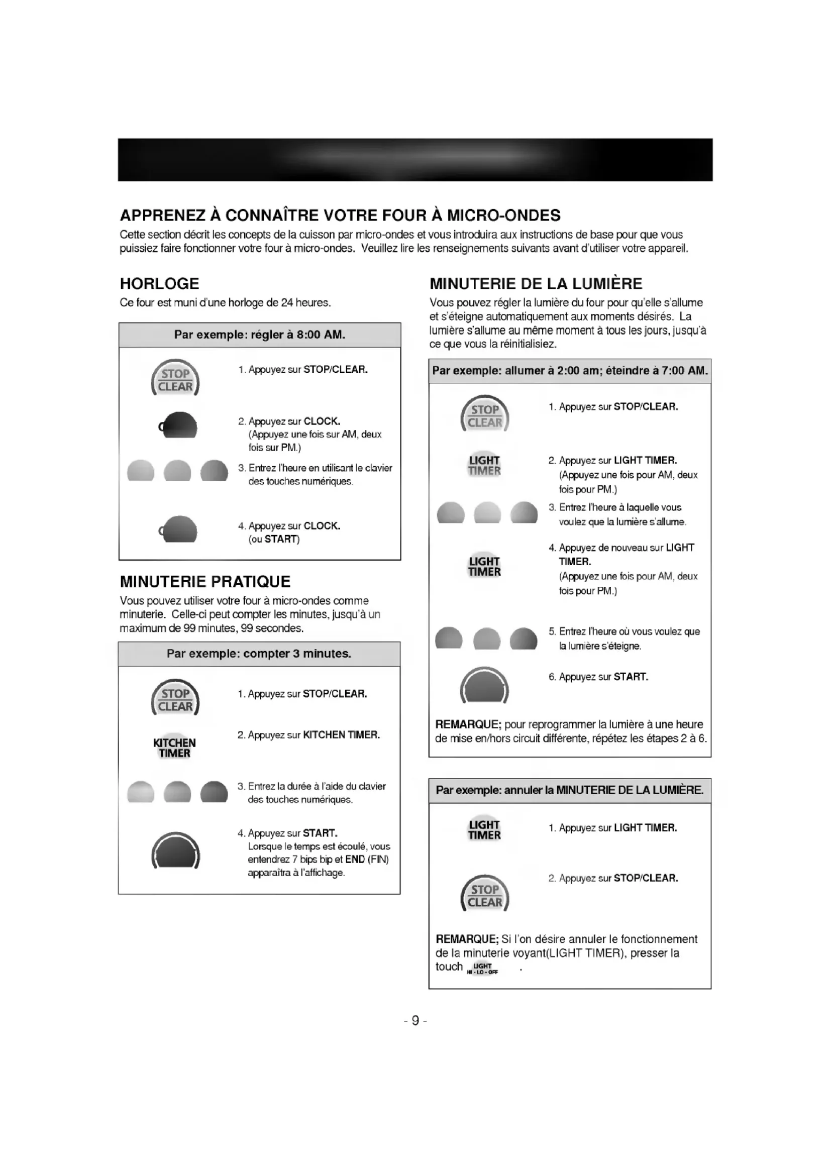 MICRO-ONDES Cettesectiondecrit lesconceptsdelacuissonparmicro-ondeset vous introduira aux instructionsdebasepourque vous puissiez fairefonctionnervotrefouramicro-ondes.Veuillezlireles renseignements suivantsavantd'utiliservotre appareil. HORLOGE Cefourestmunid'une horloge