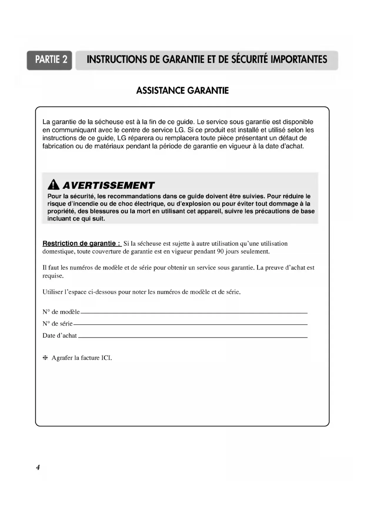 Merci d'avoir achete une secheuse LG. Lire attentivement guide caril fournit des instructions pour une installation securitaire, l'utilisation l'entretien. Noter les numeros
