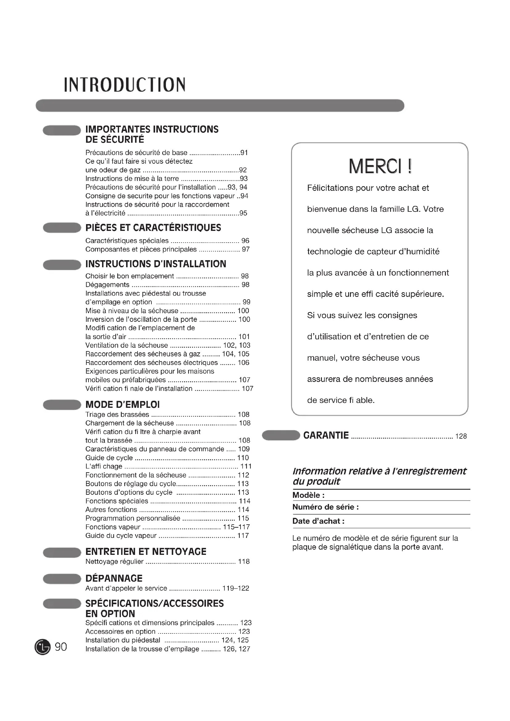 Caractéristiques spéciales ................................... 96Composantes et pièces principales ..................... 97 Information relative à l’enregistrement du produit Modèle :Numéro de série :Date d’achat :Le numéro de modèle et de série figurent sur la plaque de signalétique dans la porte avant. 90wAVERTISSEMENT Pour votre sécurité, vous devez suivre l’information contenue dans ce manuel afin de réduire les risques d’incendie et d’explosion, de choc électrique, ainsi que pour éviter les dommages matériels, les blessures corporelles, ou un décès. Votre sécurité et la sécurité des autres sont très importantes. Ce manuel contient de nombreux messages relatifs à la sécurité et à votre appareil.Lisez toujours et suivez toujours toutes les instructions relatives à votre sécurité. C’est le symbole d’alerte à la sécurité. Ce symbole vous alerte de dangers potentiels qui peuvent vous tuer ou vous blesser ou tuer ou blesser d’autres personnes. Tous les messages relatifs à la sécurité suivent le symbole d’alerte à la sécurité et le mot DANGER ou AVERTISSEMENT.Ces mots signifient : wDANGER : Vous pouvez être tué ou gravement blessé si vous ne suivez pas immédiatement les instructions. wAVERTISSEMENT : Vous pouvez être tué ou gravement blessé si vous ne suivez pas les instructions.Tous les messages relatifs à la sécurité vous diront la nature du danger potentiel, comment réduire le risque de blessure et ce qui peut se produire si vous ne suivez pas les instructions. PRÉCAUTIONS DE SÉCURITÉ DE BASE wAVERTISSEMENT : Afin de réduire les risques d’incendie, de choc électrique, ou les blessures corporelles lorsque vous utilisez des électroménagers, vous devez toujours suivre les précautions de base, y compris ce qui suit :• Lisez toutes les instructions avant d’utiliser votre sécheuse.• Avant de l’utiliser, la sécheuse doit être installée correctement conformément aux directives données dans ce manuel.• Ne séchez aucun article qui aurait précédemment été nettoyé, lavé, ou trempé dans de l’essence, des solvants pour nettoyage à sec, ou toute autre substance inflammable ou explosive non plus que tout article qui présenterait des taches de ces substances car les vapeurs qui s’en dégagent pourraient s’enflammer ou exploser.• Ne placez pas d’articles exposés à des huiles, y compris de l’huile de cuisson, dans votre sécheuse. Des vêtements contaminés aux huiles peuvent entraîner une réaction chimique qui pourrait faire enflammer une brassée.• Ne mettez jamais votre main dans la sécheuse si le tambour ou les autres pièces sont en mouvement.• Ne réparez jamais ou ne remplacez jamais une pièce de la sécheuse ou n’essayez jamais de réparer votre sécheuse, à moins que cet entretien soit spécifiquement recommandé dans ce Guide d’utilisation et d’entretien ou dans des instructions de réparations par l’utilisateur publiées que vous comprenez et que vous êtes capable d’entreprendre.• Ne modifiez pas les commandes.• Ne laissez pas les enfants jouer dans la sécheuse ou sur celle-ci. Vous devez les superviser de près lorsque vous utilisez la sécheuse à proximité.• Avant d’inutiliser ou de mettre la sécheuse au rebut, retirez-en la porte.• Utilisez les assouplisseurs ou produits pour éliminer la statique uniquement tel que recommandé par le fabricant.• N’utilisez pas de cycle avec chaleur pour sécher des articles qui comportent du caoutchouc mousse ou tout autre matière similaire à du caoutchouc.• Conservez l’espace entourant l’ouverture de sortie et les espaces adjacents libre de toute accumulation de charpie, de poussière, et de saleté.• Vous devez faire nettoyer périodiquement l’intérieur de la sécheuse et du conduit de sortie par du personnel de service qualifié.• N’installez jamais ou ne rangez jamais votre sécheuse dans un endroit exposé aux intempéries.• Vérifiez toujours l’intérieur de la sécheuse pour y repérer tout corps étranger.• Nettoyez le filtre à charpie avant ou après chaque brassée.