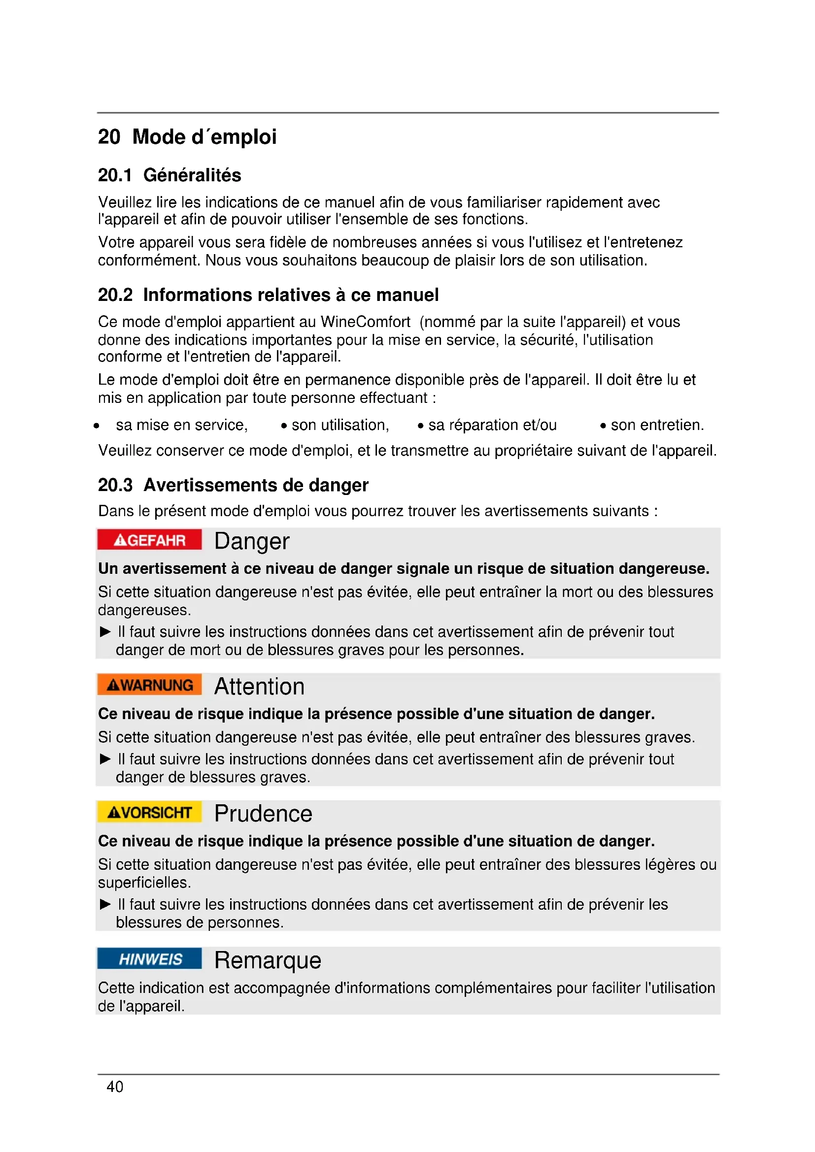Ce mode d'emploi appartient au WineComfort (nommé par la suite l'appareil) et vous donne des indications importantes pour la mise en service, la sécurité, l'utilisation conforme et l'entretien de l'appareil. Le mode d'emploi doit être en permanence disponible près de l'appareil. Il doit être lu et mis en application par toute personne effectuant :