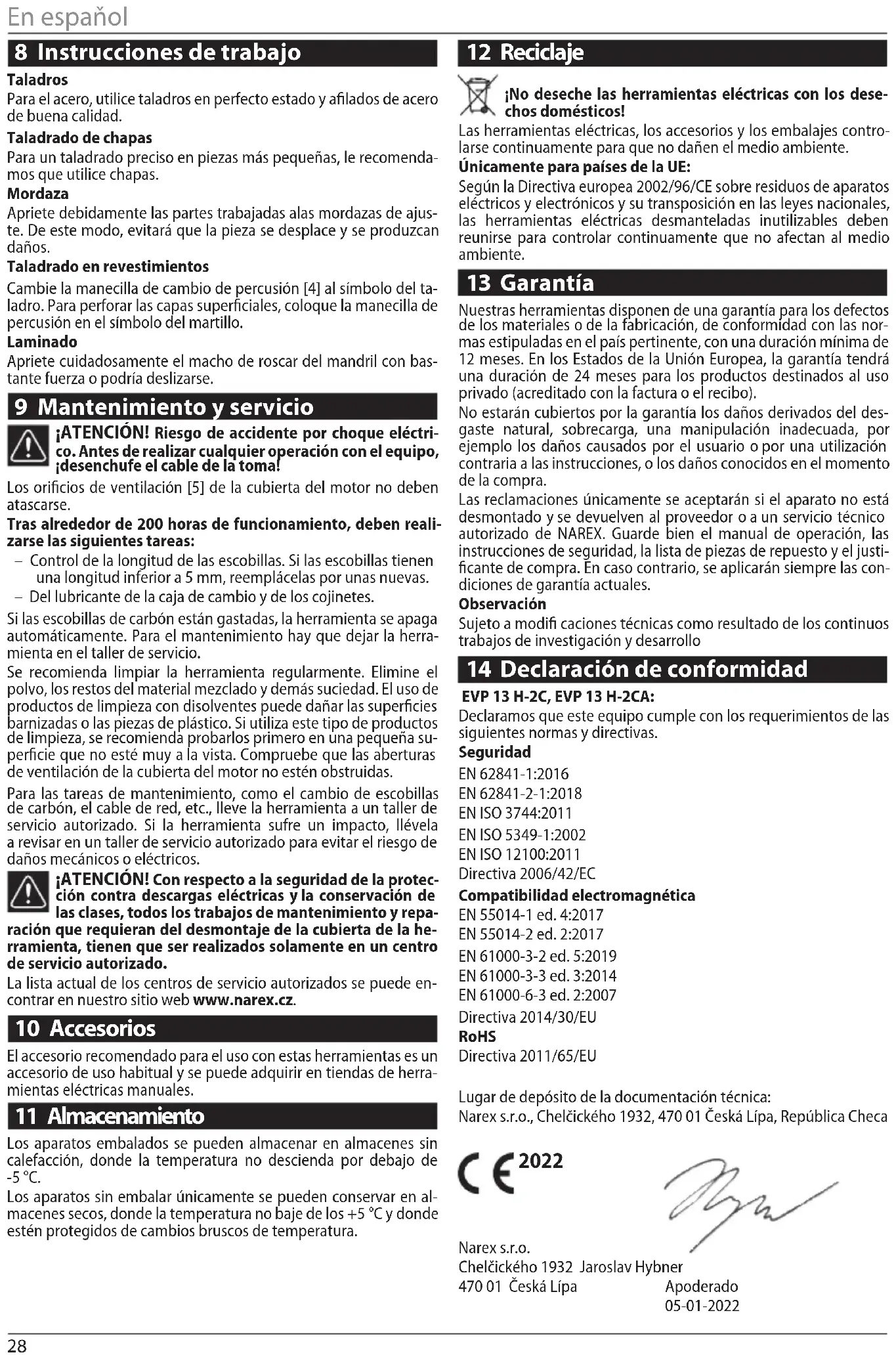 8 Instructions d’utilisation Forets Pour percer dans le métal, n’utilisez que des forets en parfait état et bien aiguisés en acier super rapide. Support de perçage Pour un perçage précis de petites pièces, nous recommandons d’utili‑ ser un support de perçage. Étau Fixez fermement les pièces usinées dans l’étau à vis. Vous éviterez ainsi la rotation des pièces et des blessures éventuelles. Perçage dans des carreaux de faïence Positionnez le commutateur de perçage/perçage à percussion sur le symbole « Perçage ». Une fois le carreau de faïence percé, positionnez le commutateur sur le symbole « Perçage à percussion ». Vissage et filetage Fixez solidement la mèche dans le mandrin pour éviter qu’elle ne se détache. 9 Nettoyage et entretien AVERTISSEMENT ! Risque d’électrocution. Avant tout réglage de l’outil, retirez la fiche de la prise de courant! Les orifices d’aération [5] du moteur ne doivent pas être bouchés. Après environ 200 heures de travail, il convient d’effectuer les tâches d’entretien suivantes : – Contrôle de la longueur de la brosse. Si la brosse mesure moins de 5 mm, il convient de la remplacer. – Remplacement de la graisse de la boîte de transfert et des paliers. Lorsque les charbons sont usés, l’outil s’éteint automatiquement. Il est nécessaire d’amener l’outil dans un centre de réparation pour son entretien. Nous recommandons de nettoyer régulièrement l’outil. Nettoyez la poussière, les restes de matériau malaxé et toutes les autres impure‑ tés. Si vous utilisez un produit de nettoyage contenant un dissolvant, les surfaces vernies ou les pièces en plastique peuvent être endom‑ magées. Si vous utilisez un produit de nettoyage de ce type, nous recommandons de l’essayer sur une petite surface à un endroit non visible. Les orifices d’aération du cache du moteur ne doivent pas être bouchés ! Pour le changement des charbons, du câble d’alimentation etc., faites appel à un centre de réparation homologué. Après une panne, il est nécessaire de faire contrôler l’outil dans un centre de réparation homo‑ logué pour écarter tout danger mécanique ou électrique. AVERTISSEMENT ! Pour éviter tout risque d’électrocu- tion, toutes les manipulations de nettoyage et d’entre- tien qui exigent un démontage du capot de l’outil doivent être effectuées dans un centre de service agréé! Vous trouverez une liste mise àjour de nos centres de service agréés sur notre site Internet www.narex.cz. 10 Accessoires Les accessoires que vous nous recommandons d’utiliser avec cet outil sont couramment disponibles dans les magasins d’outillages électroportatifs. 11 Stockage L’outil emballé peut être stocké dans un espace sec sans chauffage si la température ne descend pas en dessous de ‑5°C. Sans emballage, vous pouvez stocker votre outil dans un espace sec où la température ne descend pas en dessous de +5°C et où il ne sera pas exposé àde brusques changements de température. 12 Recyclage Ne jetez pas les outils électroportatifs avec les ordures ménagères ! Les outils électroportatifs ainsi que leurs accessoires et emballages doivent faire l’objet d’un recyclage ne nuisant pas àl’environnement. Seulement pour les pays de l’Union européenne : Conformément àla directive européenne 2002/96/ES relative aux dé‑ chets d’équipements électriques et électroniques et sa transposition dans les législations nationales, les outils électroportatifs dont on ne peut plus se servir doivent être regroupés et suivre une voie de recy‑ clage appropriée ne nuisant pas àl’environnement. 13 Garantie Nous offrons une garantie contre les défauts de matériau ou de fa‑ brication de nos outils qui répond aux dispositions légales de chaque pays mais reste dans tous les cas d’une durée minimale de 12 mois. Dans les pays de l’Union européenne, une garantie de 24 mois ne peut être contractée qu’en cas d’usage privé (àjustifier par une facture ou un reçu). Les dommages causés par l’usure naturelle, une utilisation trop inten‑ sive, une utilisation inadaptée, c’est‑à‑dire les dommages causés par l’utilisateur ou par une utilisation non respectueuse des instructions d’utilisation ou les dommages qui étaient connus au moment de l’achat sont exclus de la garantie. Une réclamation ne sera acceptée que si l’outil est renvoyé au four‑ nisseur ou àun centre de service NAREX sans être démonté. Veillez àconserver la notice d’utilisation, les instructions de sécurité, la liste des pièces de rechange et la preuve d’achat. Le cas échéant, les der‑ nières conditions de garantie en date sont toujours valables. Remarque Des travaux de recherche et développement étant en cours, les indica‑ tions techniques contenues dans cette notice peuvent changer. 14 Déclaration de conformité EVP13H-2C, EVP13H-2CA: Liste des normes harmonisées appliquées lors de l’établissement de la déclaration de conformité: Sécurité EN62841‑1:2016 EN62841‑2‑1:2018 ENISO 3744:2011 ENISO 5349‑1:2002 ENISO 12100:2011 Directive 2006/42/EC Compatibilité électromagnétique EN55014‑1 ed. 4:2017 EN55014‑2 ed. 2:2017 EN61000‑3‑2 ed. 5:2019 EN61000‑3‑3 ed. 3:2014 EN61000‑6‑3 ed. 2:2007 Directive 2014/30/EU RoHS Directive 2011/65/EU Documents techniques auprès de: Narex s.r.o., Chelčického 1932, 47001 Česká Lípa, République tchèque