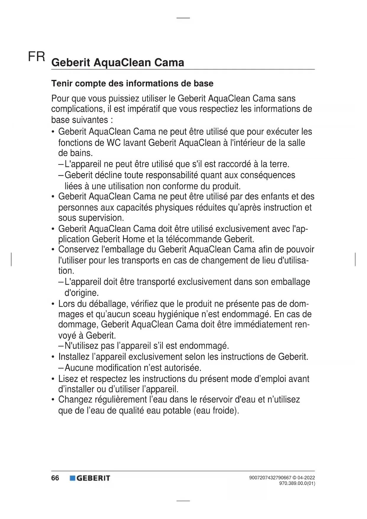 9007207432790667 © 04-2022970.389.00.0(01) Geberit AquaClean Cama Tenir compte des informations de base Pour que vous puissiez utiliser le Geberit AquaClean Cama sans complications, il est impératif que vous respectiez les informations de base suivantes: