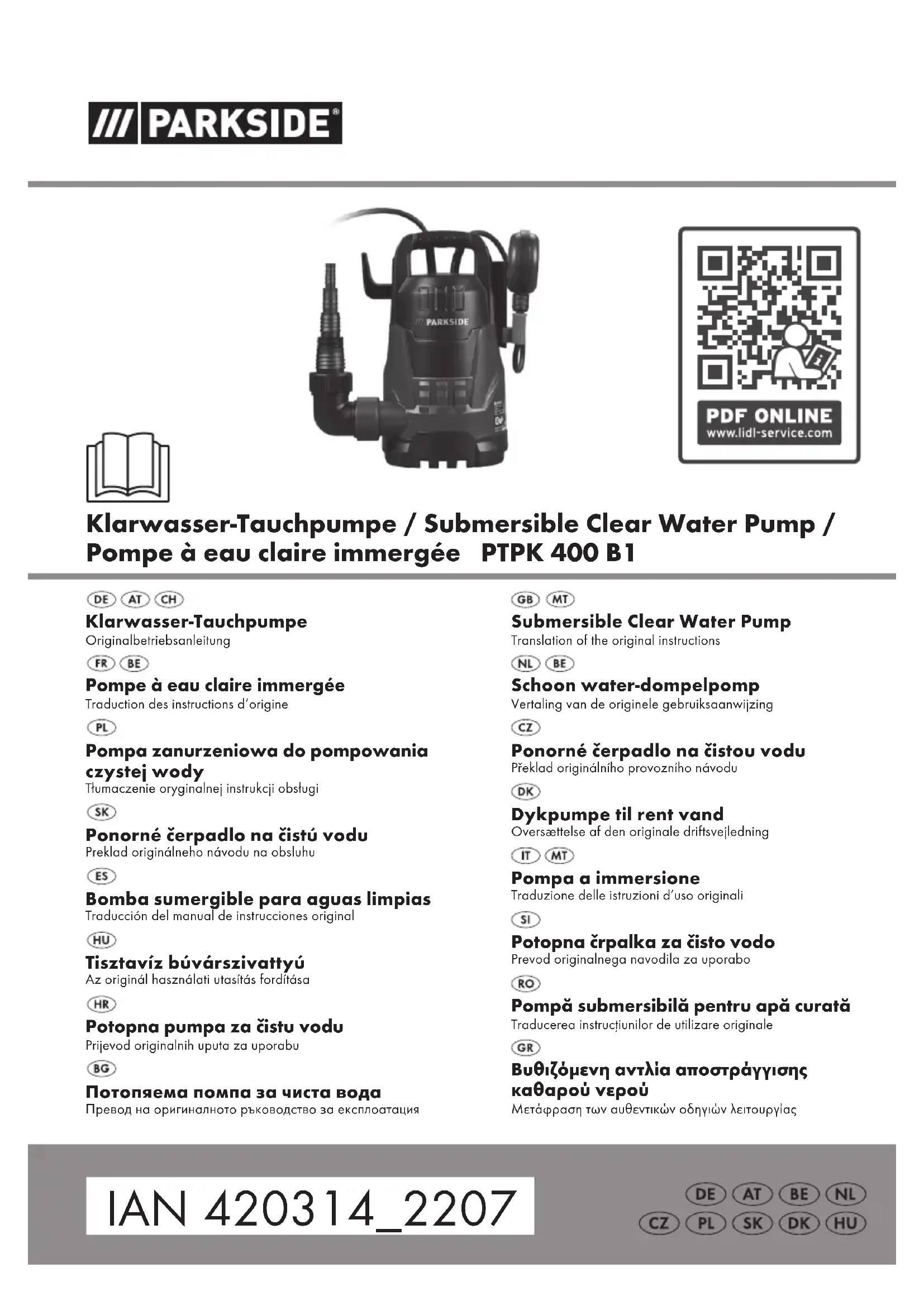 - Service Malta Tel.: 800 622 30 E-Mail: grizzly@lidl.com.mt IAN 420314_2207 Importer Please note that the following address is not a service address. Please initially con- tact the service centre specifi ed above. Grizzly Tools GmbH & Co. KG Stockstädter Straße 20 DE-63762 Großostheim, GERMANY www.grizzlytools.de29 GB MT Troubleshooting Faults Causes Remedies Pump does not start Mains voltage is not applied Check plug socket, cable, line and plug, where appropriate, have re- paired through electrical specialist Float switch (5) does not switch Bring fl oat switch into higher position Pumps has no discharge Pump pedestal inlet grating blocked Use a water jet to clean the pump pedestal inlet grating (see “General cleaning instructions”) Reduces pump performance, through severely contaminated water and additions in the water which produce a grinding effect Clean pump Backfl ow stop (10) is incorrectly fi tted or faulty Check the backfl ow stop’s connec- tion. Change it if necessary (see “Maintenance and Cleaning”) Pump does not switch off Float switch cannot drop Set up pumps correctly on the pit base Flow rate insuffi cient Pump pedestal inlet grating blocked Use a water jet to clean the pump pedestal inlet grating (see “General cleaning instructions”) Reduces pump performance, through severely contaminated water and additions in the water which produce a grinding effect Clean pump Backfl ow stop (10) is incorrectly fi tted or faulty Check the backfl ow stop’s connec- tion. Change it if necessary (see “Maintenance and Cleaning”) Backfl ow stop (10) reduces pump performance Remove the backfl ow stop from the angle adaptor (11) (see “Start-up”) Pump switch- es off after a short period Motor contactor disconnects the pumps because of water pollution that is too severe Pull out power plug and clean the pump as well as shaft Water temperature too high, motor contactor breaks Note maximum water temperature of 35°C!30 FR BE Introduction Toutes nos félicitations pour l’achat de votre nouvel appareil. Vous avez ainsi choisi un produit de qualité supérieure. La qualité de l’appareil a été vérifi ée pendant la produc- tion et il a été soumis à un contrôle fi nal. Le fonctionnement de votre appareil est donc ainsi garanti. Il n’est pas à exclure que dans certains cas isolés, il demeure dans l’appareil, ou dans les tuyauteries fl exibles, des quantités résiduelles d’eau. Ceci n’est pas un défaut ou un vice et on ne doit pas s’inquiéter à ce sujet. La notice d’utilisation fait partie de ce produit. Elle contient des instruc- tions importantes pour la sécurité, l’utilisa- tion et l’élimination des déchets. Avant d’utiliser ce produit, lisez attentivement les consignes d’emploi et de sécurité. N’utili- sez le produit que tel que décrit et unique- ment pour les domaines d’emploi indiqués. Conservez cette notice et remettez-la avec tous les documents si vous cédez le produit à un tiers. Fins d’utilisation La pompe à eau claire immergée est conçue pour pomper de l‘eau jusqu‘à une température maximale de 35°C. Elle est adaptée, par exemple, pour pom- per et transvaser depuis un bassin vers des conteneurs et de l‘eau d‘une cave inondée. Cet appareil n’est pas adapté à une utilisa- tion industrielle. Toute utilisation industrielle met fi n à la garantie. L‘opérateur ou l‘utilisateur est responsable des accidents ou des dégâts sur les per- sonnes et sur les biens. Le fabricant n‘est pas responsable des dégâts qui ont été cau- sés par un usage contraire aux prescriptions ou par une utilisation non conforme. Sommaire Introduction p. 30