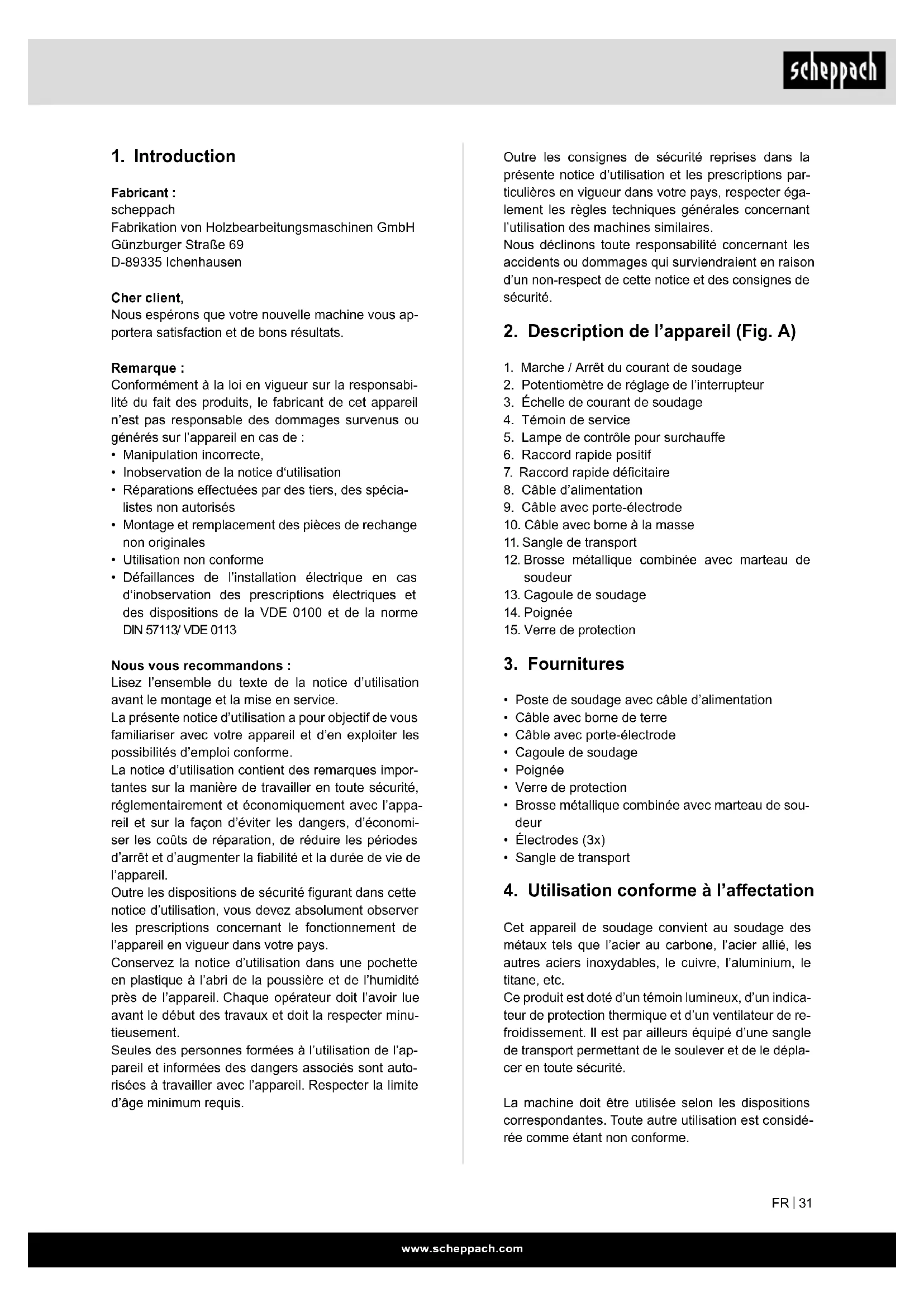 - Il faut assurer une amenée dʼair frais suffisante pendant le soudage, en particulier lorsquʼil est fait dans de petites pièces étant donné que de la fumée et des gaz nocifs sont générés.www.scheppach.com
