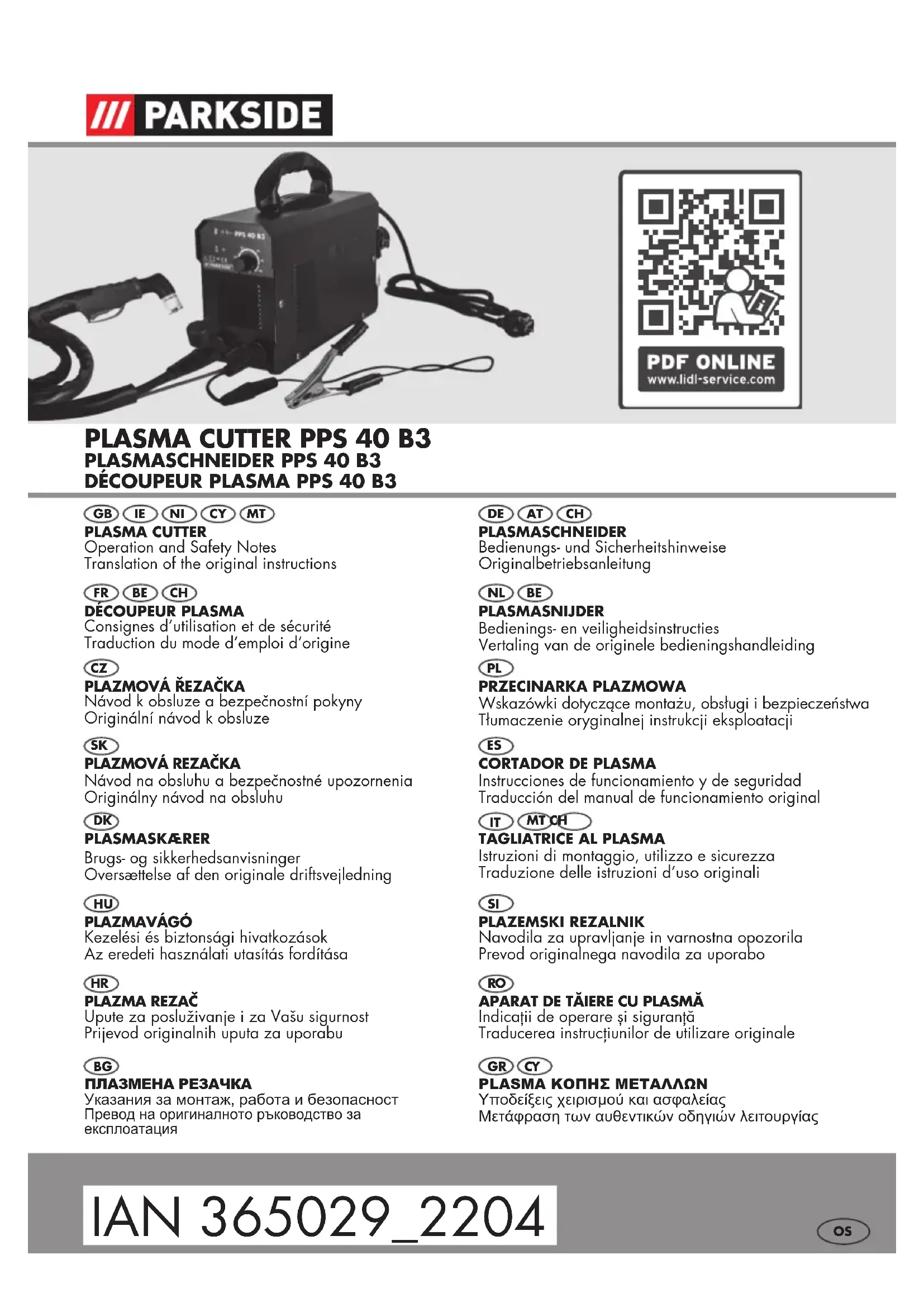 - Faire valoir sa garantie Pour garantir la rapidité d‘exécution de la procédure de garantie, veuillez respecter les66 FR/BE/CH indications suivantes: Veuillez conserver le ticket de caisse et le numéro de référence de l’article (par ex. IAN) au titre de preuves d’achat pour toute demande. Le numéro de référence de l’ar- ticle est indiqué sur la plaque signalétique, sur une gravure, sur la couverture de votre manuel (en bas à gauche) ou sur un autocol- lant placé sur la face arrière ou inférieure de l’appareil. En cas de dysfonctionnement de l’appareil ou de tout autre défaut, contactez en premier lieu le service après-vente par téléphone ou par e-mail aux coordonnées indiquées ci-dessous. Tout produit considéré comme défectueux peut alors être envoyé sans frais de port sup- plémentaires au service après-vente indiqué, accompagné de la preuve d’achat et d’une description écrite du défaut mentionnant également sa date d’apparition. Remarque: Le site www.lidl-service.com vous permet de télécharger le présent mode d’emploi, ainsi que d’autres manuels, des vidéos sur les produits et des logiciels. Ce code QR vous permet d’accéder direc- tement à la page du service après-vente de Lidl (www.lidl-service.com). Saisissez la référence de l’article (IAN) 365029 pour ouvrir le mode d’emploi correspondant. Comment nous contacter: FR, BE, CH Nom : Ecos Office Forbach Site web : www.cmc-creative.de E-mail : service.fr@cmc-creative.de Téléphone : 0033 (0) 3 87 84 72 34 Siège : Allemagne IAN 365029_2204 Veuillez noter que les coordonnées fournies ci-après ne sont pas les coordonnées du service après-vente. Contactez d’abord le service après-vente mentionné ci-dessus. C.M.C. GmbH Katharina-Loth-Str. 15 DE-66386 St. Ingbert ALLEMAGNE Commande de pièces de rechange www.ersatzteile.cmc-creative.de67NL/BE Tabel van de gebruikte pictogrammen..................................................Pagina 68 Inleiding ................................................................................................................Pagina 69 Beoogd gebruik.........................................................................................................Pagina 69 Leveringsomvang .......................................................................................................Pagina 70 Beschrijving van de onderdelen ...................................................................................Pagina 70 Technische gegevens ..................................................................................................Pagina 71 Veiligheidsinstructies ......................................................................................Pagina 71 Algemene plasma- verklaringen ...............................................................Pagina 78 Voor de ingebruikname ................................................................................Pagina 79 Opstellingsomgeving..................................................................................................Pagina 79 Aansluiting van de perslucht .......................................................................................Pagina 79 Aansluiting van de snijbrander ....................................................................................Pagina 79 Aardingskabel aansluiten ...........................................................................................Pagina 79 Inbedrijfstelling .................................................................................................. Pagina 80 Bediening .................................................................................................................Pagina 80 Probleemoplossing ..........................................................................................Pagina 80 Onderhoud en verzorging ...........................................................................Pagina 83 Onderhoud van de brander ........................................................................................Pagina 83 Onderhoud ...............................................................................................................Pagina 83 Opslag .....................................................................................................................Pagina 84 Milieu-informatie en afvalverwijderingsrichtlijnen ..........................Pagina 84 EU-conformiteitsverklaring ..........................................................................Pagina 85 Aanwijzingen over garantie en afhandelen van de service .......Pagina 85 Garantievoorwaarden ................................................................................................ Pagina 85 Garantieperiode en wettelijke garantieclaims ................................................................Pagina 86 Omvang van de garantie ...........................................................................................Pagina 86 Afwikkeling in geval van garantie ................................................................................Pagina 8668 NL/BE
