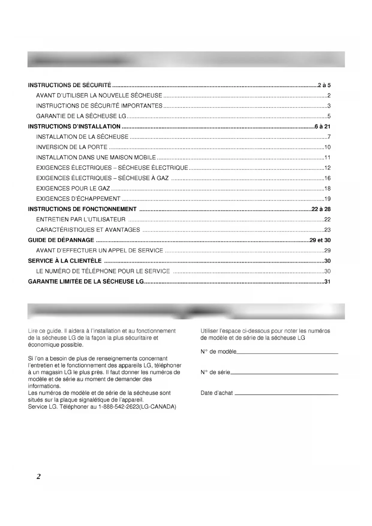 (0cm)7 Instructions de securite Instructions d'installation Instructions de fonctionnement Conseils de depannage Service a la clientele INSTALLATION