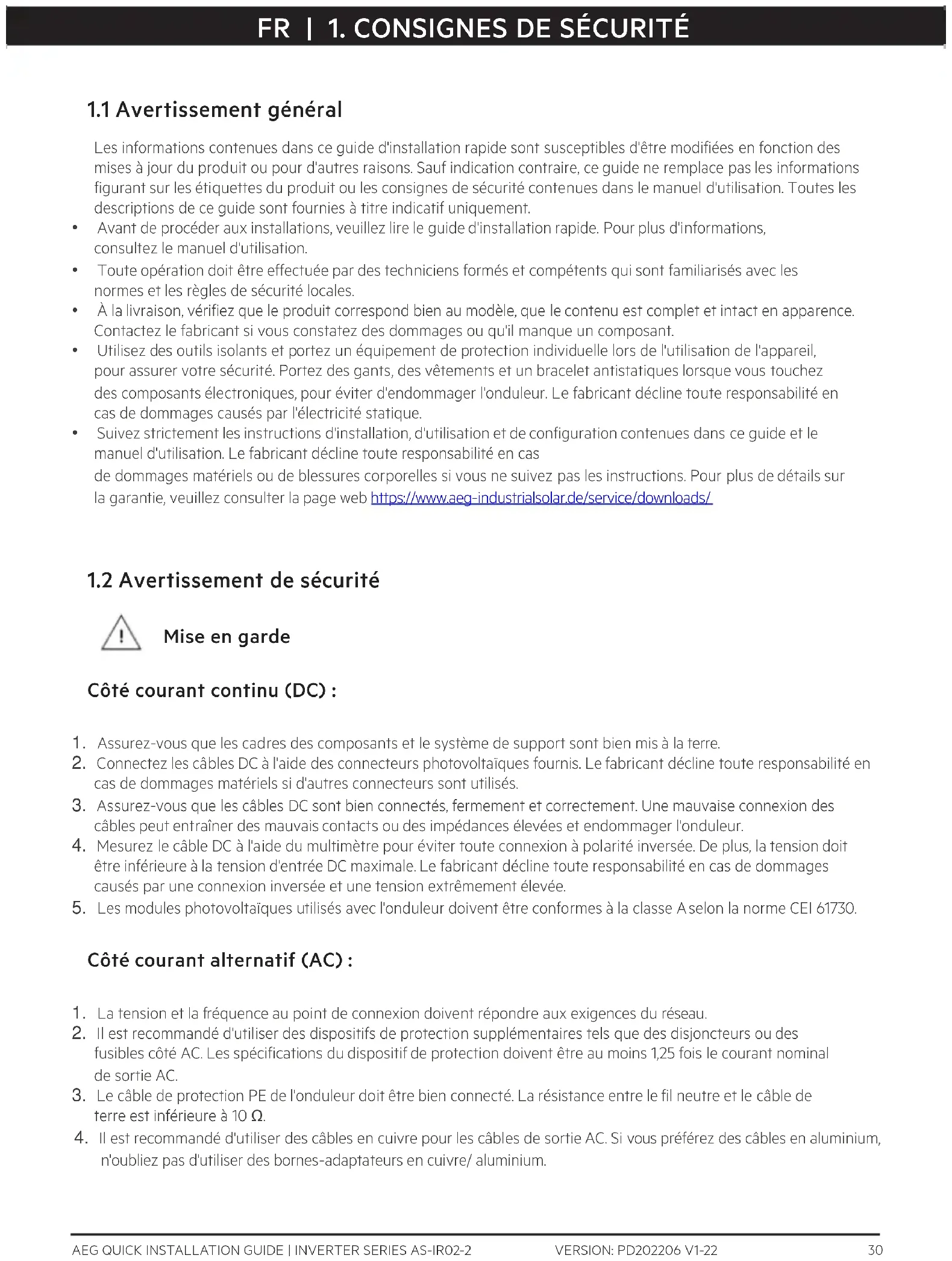 - Suivez strictement les instructions d'installation, d'utilisation et de configuration contenues dans ce guide et le manuel d'utilisation. Le fabricant décline toute responsabilité en cas de dommages matériels ou de blessures corporelles si vous ne suivez pas les instructions. Pour plus de détails sur la garantie, veuillez consulter la page web https://www.aeg-industrialsolar.de/service/downloads/