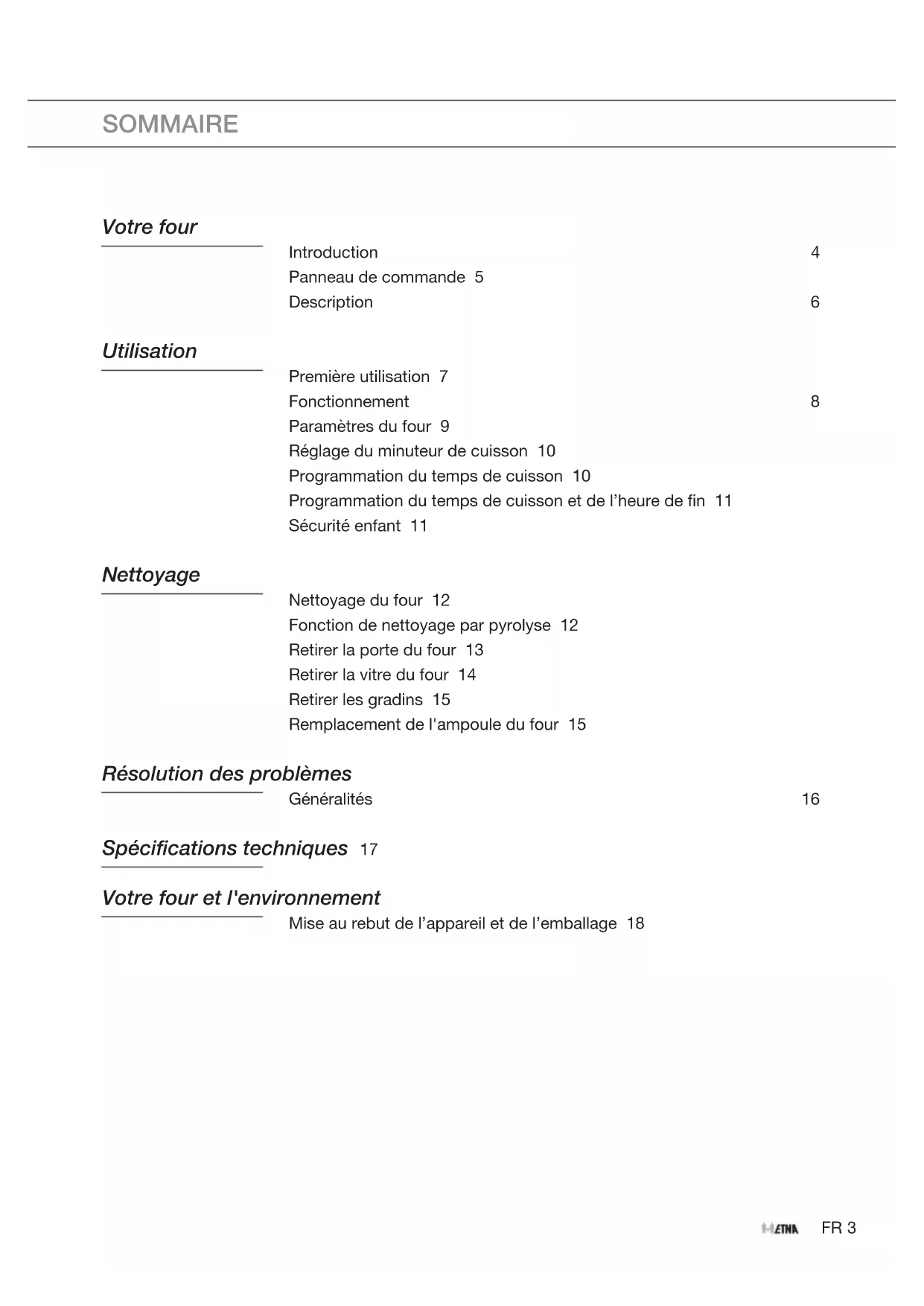 SOMMAIRE Votre four Introduction 4 Panneau de commande 5 Description 6 Utilisation Première utilisation 7 Fonctionnement 8 Paramètres du four 9 Réglage du minuteur de cuisson 10 Programmation du temps de cuisson 10 Programmation du temps de cuisson et de l’heure de fin 11 Sécurité enfant 11 Nettoyage Nettoyage du four 12 Fonction de nettoyage par pyrolyse 12 Retirer la porte du four 13 Retirer la vitre du four 14 Retirer les gradins 15 Remplacement de l'ampoule du four 15 Résolution des problèmes Généralités 16 Spécifications techniques 17 Votre four et l'environnement Mise au rebut de l’appareil et de l’emballage 18FR 4 Introduction Félicitations pour l'achat de ce four Etna. Ce produit a été conçu pour vous offrir un confort d'utilisation optimal. Ses réglages très divers vous permettent toujours de choisir le mode de préparation approprié. Cette notice d'utilisation décrit comment utiliser ce four de manière optimale. En plus des informations relatives au fonctionnement du four, vous y trouverez des renseignements de base susceptibles de faciliter l’utilisation de l'appareil. Veuillez lire attentivement les instructions de sécurité fournies séparément avant toute utilisation de l'appareil! Lisez attentivement cette notice d'utilisation avant d'utiliser l'appareil et rangez-la en lieu sûr pour la consulter ultérieurement. Les instructions d’installation sont fournies séparément. Vous pouvez trouver la version la plus récente de le mode d’emploi sur notre site Web. VOTRE FOURFR 5 VOTRE FOUR Panneau de commande