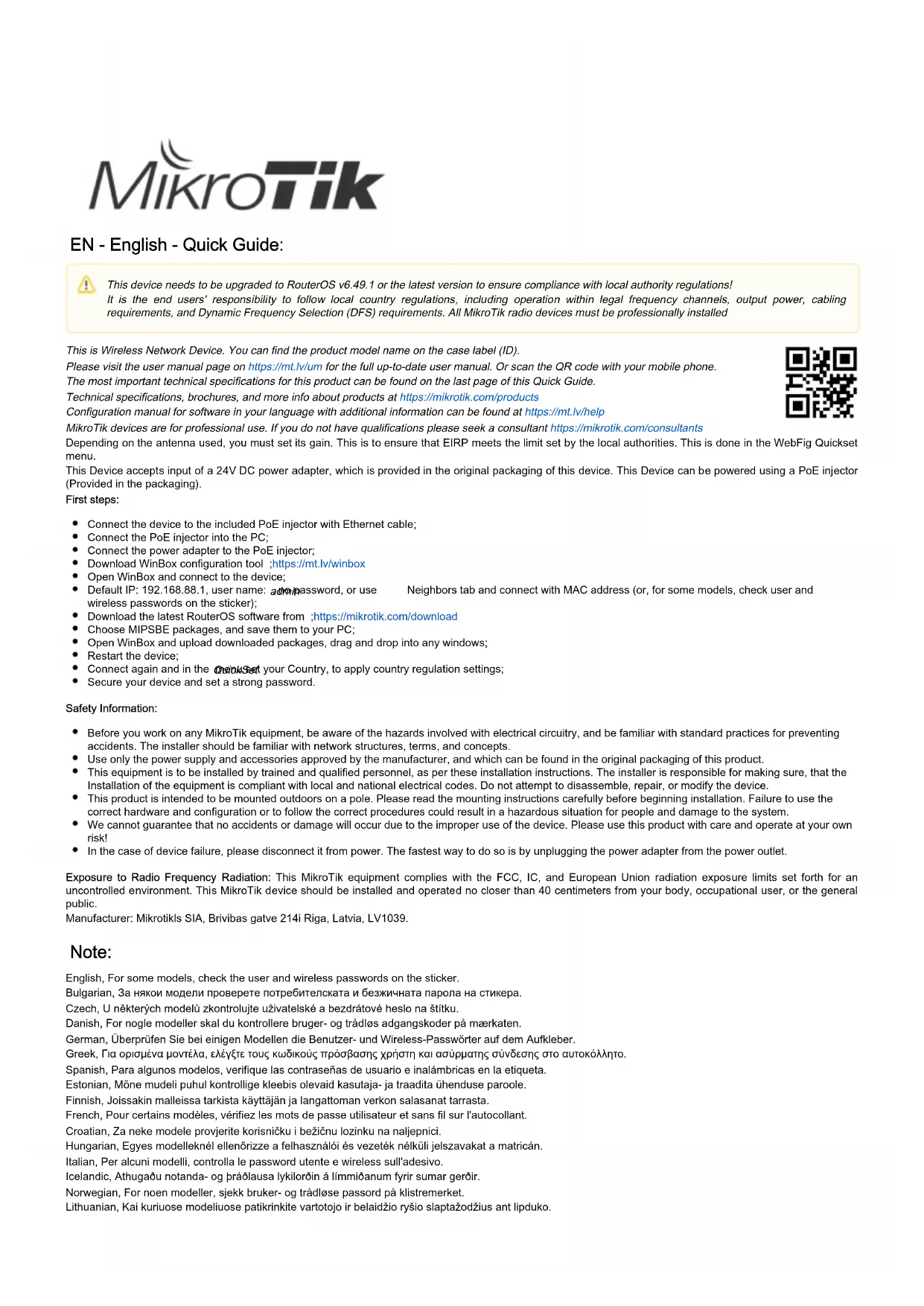 Il s'agit d'un périphérique réseau sans fil. Vous pouvez trouver le nom du modèle du produit sur l'étiquette du boîtier (ID). Veuillez visiter la page du manuel d'utilisation sur pour le manuel d'utilisation complet et à jour.https://mt.lv/um-fr Ou scannez le code QR avec votre téléphone portable. Les spécifications techniques les plus importantes de ce produit se trouvent sur la dernière page de ce guide rapide. Spécifications techniques, brochures et plus d'informations sur les produits surhttps://mikrotik.com/products Tämä laite on päivitettävä RouterOS v6.49.1 -versioon tai uusimpaan versioon, jotta varmistetaan paikallisviranomaisten määräysten noudattaminen. Loppukäyttäjien vastuulla on noudattaa paikallisia maalakeja, mukaan lukien toiminta laillisilla taajuuskanavilla, lähtöteho, kaapelointivaatimukset ja