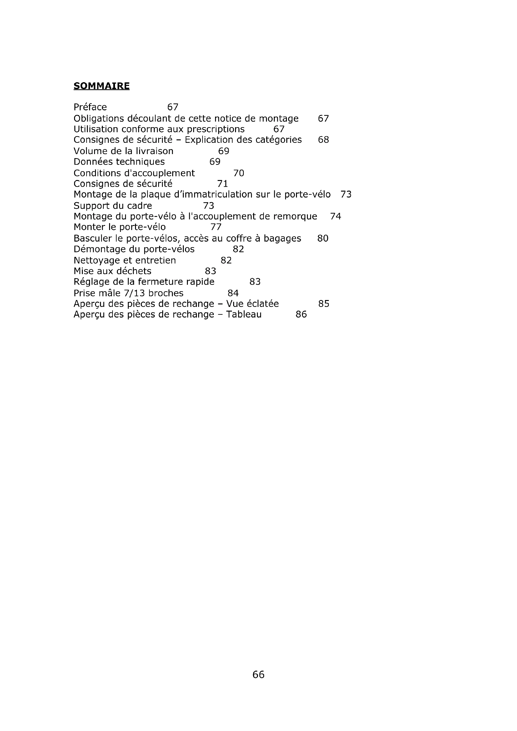 M666 SOMMAIRE Préface 67 Obligations découlant de cette notice de montage 67 Utilisation conforme aux prescriptions 67 Consignes de sécurité – Explication des catégories 68 Volume de la livraison 69 Données techniques 69 Conditions d'accouplement 70 Consignes de sécurité 71 Montage de la plaque d’immatriculation sur le porte-vélo 73 Support du cadre 73 Montage du porte-vélo à l'accouplement de remorque 74 Monter le porte-vélo 77 Basculer le porte-vélos, accès au coffre à bagages 80 Démontage du porte-vélos 82 Nettoyage et entretien 82 Mise aux déchets 83 Réglage de la fermeture rapide 83 Prise mâle 7/13 broches 84 Aperçu des pièces de rechange – Vue éclatée 85 Aperçu des pièces de rechange – Tableau 8667 PREFACE Le porte-vélo Pro-User Diamant FG série fait partie de la gamme de porte-vélos fabriqués par Tradekar Benelux BV. Cette notice de montage vous aide à exécuter le montage du porte-vélo Pro-User Diamant FG de manière conforme et en sécurité.