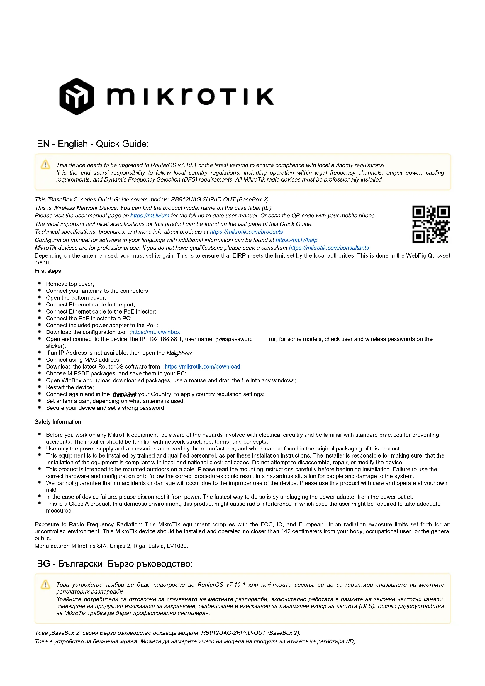 Il s'agit d'un périphérique réseau sans fil. Vous pouvez trouver le nom du modèle du produit sur l'étiquette du boîtier (ID). Veuillez visiter la page du manuel d'utilisation sur pour le manuel d'utilisation complet et à jour.https://mt.lv/um-fr Ou scannez le code QR avec votre téléphone portable. Les spécifications techniques les plus importantes de ce produit se trouvent sur la dernière page de ce guide rapide. Spécifications techniques, brochures et plus d'informations sur les produits surhttps://mikrotik.com/products Vous trouverez le manuel de configuration du logiciel dans votre langue avec des informations supplémentaires sur https://mt.lv/help-fr Les appareils MikroTik sont destinés à un usage professionnel. Si vous n'avez pas de qualifications, veuillez consulter un consultant https://mikrotik.com/consultants Selon l'antenne utilisée, vous devez régler son gain. Il s'agit de garantir que l'EIRP respecte la limite fixée par les autorités locales. Cela se fait dans le menu Webfig Quickset. Premiers pas: Retirez le capot supérieur; Connectez votre antenne aux connecteurs; Ouvrez le capot inférieur; Connectez le câble Ethernet au port; Connectez le câble Ethernet à l'injecteur PoE; Connectez l'injecteur PoE à un PC; Connectez l'adaptateur d'alimentation inclus au PoE; Téléchargez l'outil de configuration ;https://mt.lv/winbox Ouvrez et connectez-vous à l'appareil, l' IP: 192.168.88.1, nom d'utilisateur: , pas de mot de passe admin (ou, pour certains modèles, vérifiez les mots de passe utilisateur et sans fil sur l'autocollant); Si une adresse IP n'est pas disponible, ouvrez l'onglet ; Neighbors Connectez-vous en utilisant l'adresse MAC; Téléchargez le dernier logiciel RouterOS sur ;https://mikrotik.com/download Choisissez les packages MIPSBE et enregistrez-les sur votre PC; Ouvrez WinBox et téléchargez les packages téléchargés, utilisez une souris et faites glisser le fichier dans toutes les fenêtres; Redémarrez l'appareil; Connectez-vous à nouveau et définissez votre pays dans le menu pour appliquer les paramètres de réglementation du pays; QuickSet Réglez le gain d'antenne, en fonction de l'antenne utilisée; Sécurisez votre appareil et définissez un mot de passe fort. Information sur la sécurité: Avant de travailler sur un équipement MikroTik, soyez conscient des dangers liés aux circuits électriques et familiarisez-vous avec les pratiques standard de prévention des accidents. Le programme d'installation doit être familiarisé avec les structures, les termes et les concepts du réseau. Utilisez uniquementl'alimentation et accessoires approuvés par le fabricant, etquipeuvent être a trouvé dansl'emballage d'origine de ce produit. Cet équipement doit être installé par du personnel formé et qualifié, conformément à ces instructions d'installation. L'installateur est responsable de s'assurer que l'installation de l'équipement est conforme aux codes électriques locaux et nationaux. N'essayez pas de démonter, réparer ou modifier l'appareil. Ce produit est destiné à être monté à l'extérieur sur un poteau. Veuillez lire attentivement les instructions de montage avant de commencer l'installation. Le fait de ne pas utiliser lematériel et la configuration corrects ou de ne pas suivre les procédures correctes peut entraîner une situation dangereuse pour les .personnes et endommager le système Nous ne pouvons garantir qu'aucun accident ou dommage ne se produira en raison d'une mauvaise utilisation de l'appareil. Veuillez utiliser ce produit avec soin et l'utiliser à vos propres risques! En cas de panne de l'appareil, veuillez le déconnecter de l'alimentation. La façon la plus rapide de le faire est de débrancher l'adaptateur secteur de la prise de courant. Ceci est un produit de classe A. Dans un environnement domestique, ce produit peut provoquer des interférences radio, auquel cas l'utilisateur peut être amené à prendre des mesures adéquates. cet équipement MikroTik est conforme aux limites d'exposition aux rayonnements FCC, IC et Union européenneExposition aux rayonnements radiofréquences: établies pour un environnement non contrôlé. Cet appareil MikroTik doit être installé et utilisé à au moins 142 centimètres de votre corps, de l'utilisateur professionnel ou du grand public. Fabricant: Mikrotikls SIA, Unijas 2, Riga, Lettonie, LV1039. HR - Hrvatski. Brzi vodič: Cet appareil doit être mis à niveau vers RouterOS v7.10.1 ou la dernière version pour garantir la conformité aux réglementations des autorités locales. Il est de la responsabilité des utilisateurs finaux de suivre les réglementations locales du pays, y compris le fonctionnement dans les canaux de fréquence légaux, la sortie