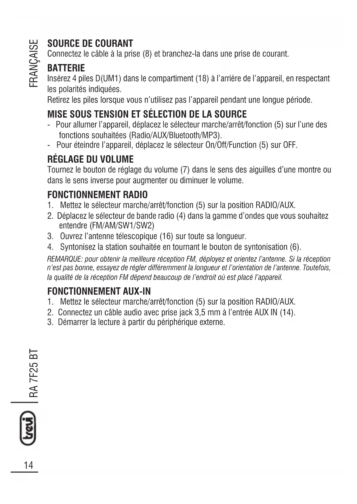 Pour le nettoyage, il est conseillé d’utiliser un chiffon doux légèrement humide. Évitez l’emploi de solvants ou de substances abrasives. IMPORTANT Cet appareil est conçu pour un usage domestique (usage non professionnel). La bonne fabrication de cet appareil garantit un fonctionnement parfait pour une longue période. Si toutefois quelques inconvénients devaient se présenter, adressez-vous au Centre d’Assistance agréé TREVI le plus proche. TREVI observe une politique de recherche et de développement continus. C’est pourquoi ses produits peuvent présenter des caractéristiques différentes par rapport à celles qui sont décrites.RA 7F25 BT