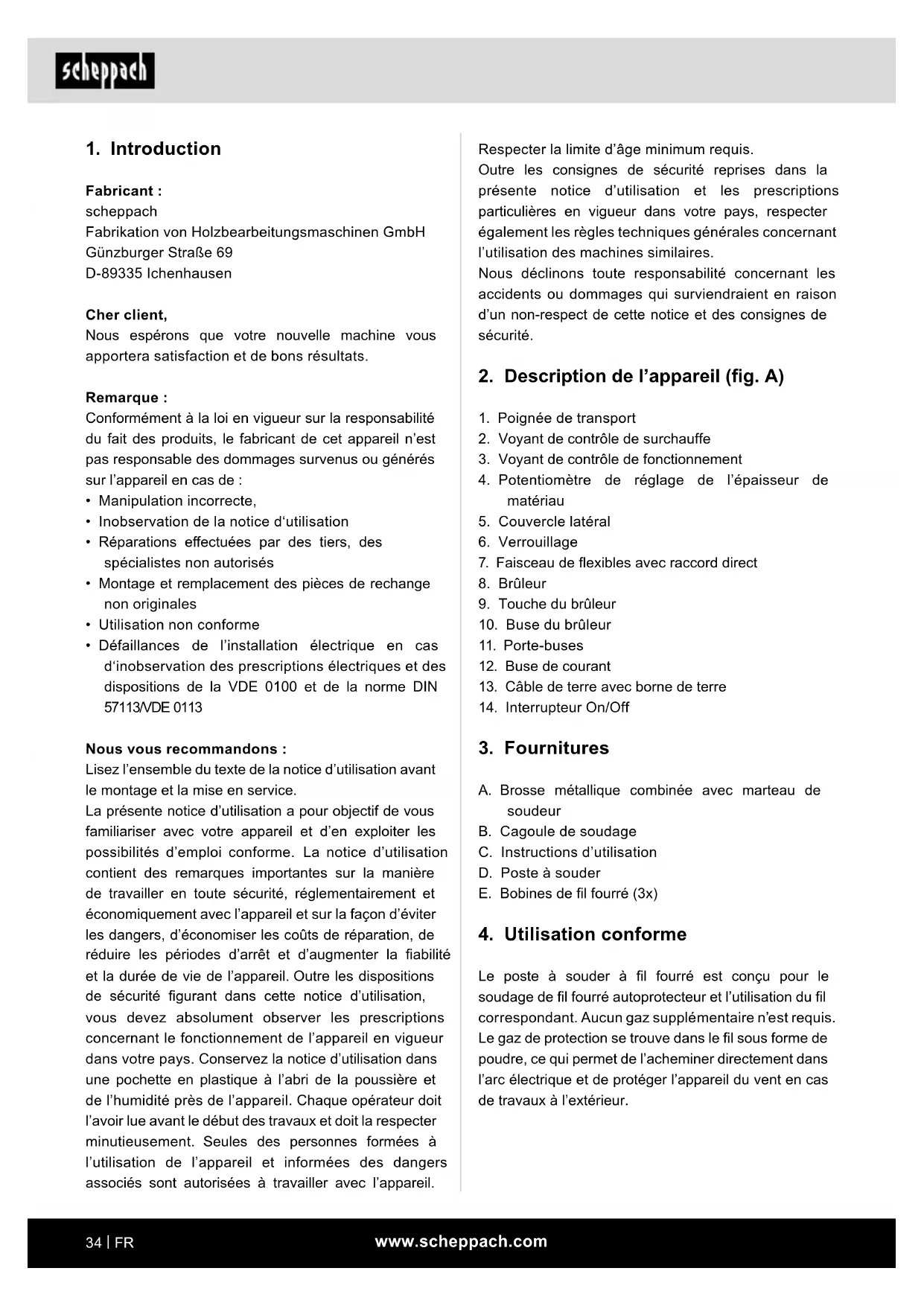 Fabricant : scheppach Fabrikation von Holzbearbeitungsmaschinen GmbH Günzburger Straße 69 D-89335 Ichenhausen Cher client, Nous espérons que votre nouvelle machine vous apportera satisfaction et de bons résultats. Remarque : Conformément à la loi en vigueur sur la responsabilité du fait des produits, le fabricant de cet appareil n’est pas responsable des dommages survenus ou générés sur l’appareil en cas de :