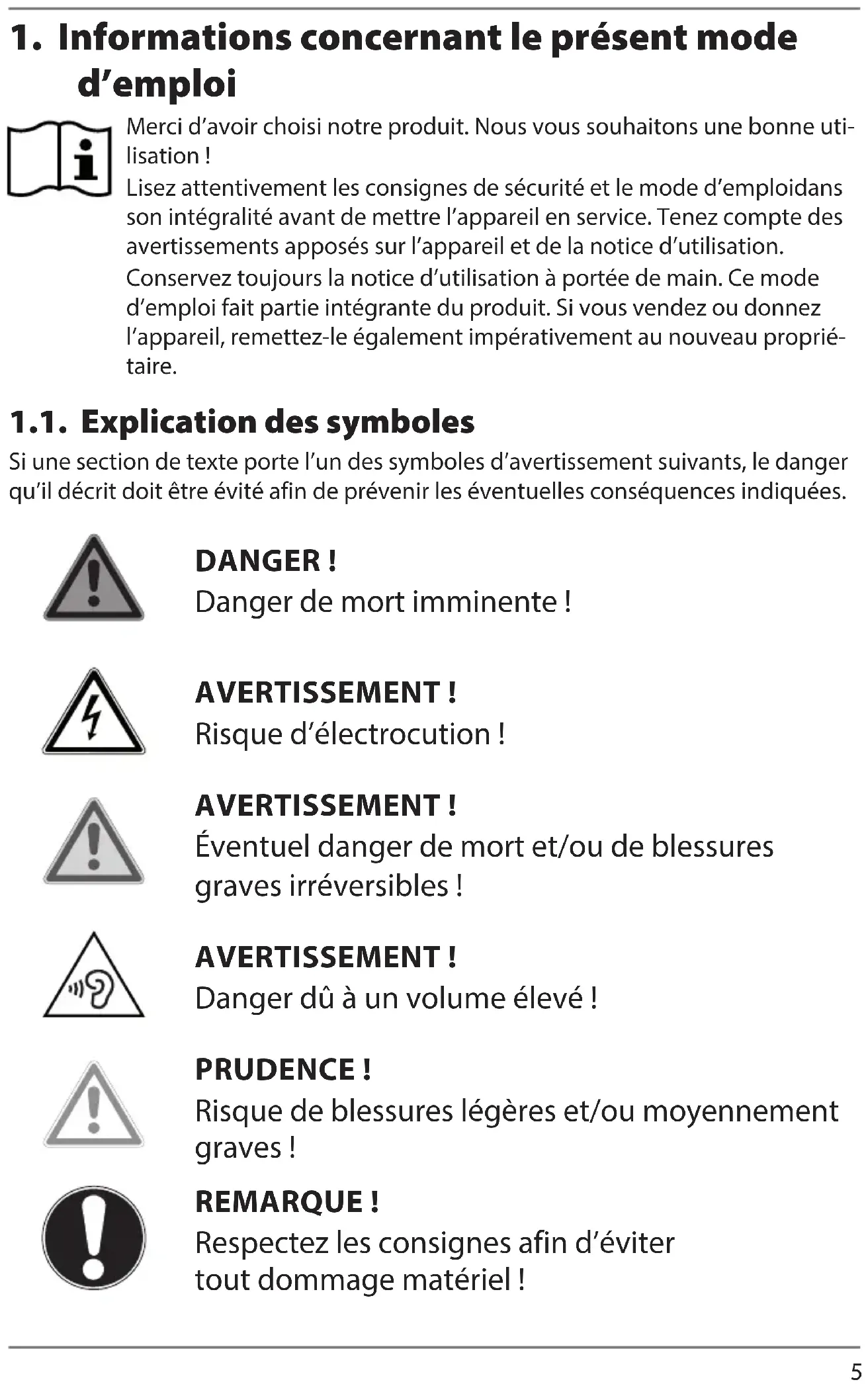 d’emploi Merci d’avoir choisi notre produit. Nous vous souhaitons une bonne uti- lisation! Lisez attentivement les consignes de sécurité et le mode d’emploidans son intégralité avant de mettre l’appareil en service. Tenez compte des avertissements apposés sur l’appareil et de la notice d’utilisation. Conservez toujours la notice d’utilisation à portée de main. Ce mode d’emploi fait partie intégrante du produit. Si vous vendez ou donnez l’appareil, remettez-le également impérativement au nouveau proprié- taire. 1.1. Explication des symboles Si une section de texte porte l’un des symboles d’avertissement suivants, le danger qu’il décrit doit être évité afin de prévenir les éventuelles conséquences indiquées. DANGER! Danger de mort imminente! AVERTISSEMENT! Risque d’électrocution! AVERTISSEMENT! Éventuel danger de mort et/ou de blessures graves irréversibles! AVERTISSEMENT! Danger dû à un volume élevé! PRUDENCE! Risque de blessures légères et/ou moyennement graves! REMARQUE! Respectez les consignes afin d’éviter tout dommage matériel!6 Informations complémentaires concernant l’utilisation de l’ap- pareil! Tenez compte des remarques contenues dans le mode d’em- ploi !