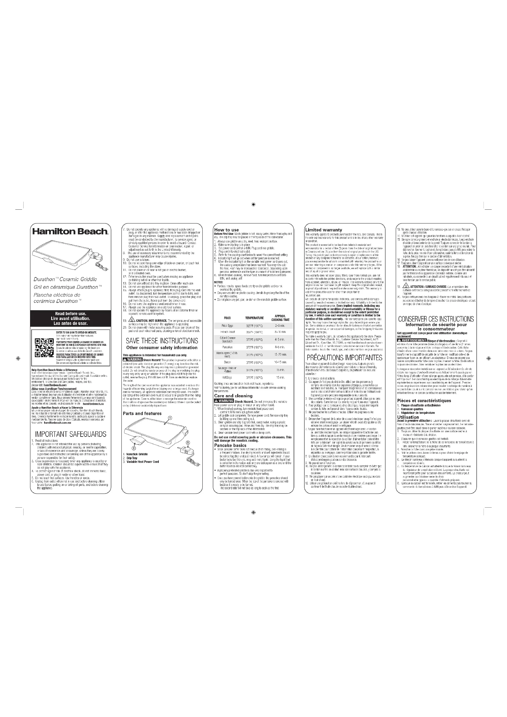 - Una vez que haya vaciado la mezcla sobre la parrilla, los hotcakes sólo deben voltearse una vez. Cuando la parte superior del hotcake está cubierto con burbujas está listo para ser volteado. El segundo lado no tomará tanto en cocinar como el primero. Básicos sobre los hotcakes Garantie limitée Cette garantie s’applique aux produits achetés aux É.-U. et au Canada. C’est la seule garantie expresse pour ce produit et est en lieu et place de tout autre garantie ou condition. Ce produit est garanti contre tout défaut de matériaux et de main-d’oeuvre pour une période de cinq (5) ans à compter de la date d’achat d’origine au Canada et un (1) an à compter de la date d’achat d’origine aux É.-U. Au cours de cette période, votre seul recours est la réparation ou le remplacement de ce produit ou tout composant s’avérant défectueux, à notre gré, mais vous êtes responsable de tous les coûts liés à l’expédition du produit et le retour d’un produit ou d’un composant dans le cadre de cette garantie. Si le produit ou un composant n’est plus offert, nous le remplace- rons par un produit similaire de valeur égale ou supérieure. Cette garantie ne couvre pas le verre, les filtres, l’usure d’un usage normal, l’utilisa- tion non conforme aux directives imprimées, ou des dommages au produit résultant d’un accident, modification, utilisation abusive ou incorrecte. Cette garantie s’ap- plique seulement à l’acheteur original ou à la personne l’ayant reçu en cadeau. La présentation du reçu de vente d’origine comme preuve d’achat est nécessaire pour faire une réclamation au titre de cette garantie. Cette garantie ne s’applique pas si le produit est utilisé à d’autres fins qu’une utilisation domiciliaire familiale. Nous excluons toutes les réclamations au titre de cette garantie pour les dommages spéciaux, consécutifs et indirects causés par la violation de garantie expresse ou implicite. Toute responsabilité est limitée au prix d’achat. Chaque garantie implicite, y compris toute garantie ou condition de qualité marchande ou d’adéquation à un usage particulier, est exonérée, sauf dans la mesure interdite par la loi, auquel cas la garantie ou condition est limitée à la durée de cette garantie écrite. Cette garantie vous donne des droits légaux précis. Vous pouvez avoir d’autres droits qui varient selon l’endroit où vous habitez. Certaines provinces ne permettent pas les limitations sur les garanties implicites ou les dommages spéciaux ou indirects de telle sorte que les limitations ci-dessus ne s’appliquent peut-être pas à votre cas. Ne pas retourner cet appareil au magasin lors d’une réclamation au titre de cette garantie. Veuillez nous écrire à Hamilton Beach Brands, Inc., Customer Service Department, 4421 Waterfront Dr., Glen Allen, VA 23060, ou visiter le site hamilton- beach.com/customer-service aux États-Unis ou hamiltonbeach.ca/customer-service au Canada. Pour obtenir un service plus rapide, veuillez repérer les numéros de modèle, de type et de séries sur votre appareil.ach.ca/customer-service in Canada. Ciudad de MéxicoELECTRODOMÉSTICOSAv. Plutarco Elias Cailes No. 1499 Zacahuitzco, Benito Juárez, Ciudad de México, C.P. 09490Tel: 55 5235 2323CASA GARCÍAAv. Patriotismo No. 875-BMixcoac, Benito Juárez, Ciudad de México, C.P. 03910 Tel: 55 5563 8723 Nuevo LeónFERNANDO SEPÚLVEDA REFACCIONESRuperto Martínez No. 238 Ote. Col. Centro Monterrey, N.L., CP 6400Tel: 81 8343 6700JaliscoSERVICIOS DE MANTENIMIENTO CASTILLOGaribaldi No. 1450 Ladrón de Guevara, Guadalajara, Jalisco, C.P. 44660Tel: 33 3825 3480CENTROS DE SERVICIO AUTORIZADOSGARANTÍA PARA PRODUCTOS COMPRADOS EN MÉXICOPRODUCTO: MARCA: MODELO:Grupo HB PS, S.A. de C.V. cuenta con una Red de Centros de Servicio Autorizada, por favor consulte en la lista anexa el nombre y dirección de los establecimientos en la República Mexicana en donde usted podrá hacer efectiva la garantía, obtener partes, componentes, consumibles y accesorios; así como también obtener servicio para pro-ductos fuera de garantía. Para mayor información llame al: Centro de Atención al consumidor: 800 71 16 100 Grupo HB PS, S.A. de C.V. le otorga a partir de la fecha de compra:GARANTÍA DE 1 AÑO.COBERTURA• Esta garantía ampara, todas las piezas y componentes del producto que resulten con defecto de fabricación incluyendo la mano de obra.• Grupo HB PS, S.A. de C.V. se obliga a reemplazar, reparar o reponer, cualquier pieza o componente defectuoso; proporcionar la mano de obra necesaria para su diagnóstico y reparación, todo lo anterior sin costo adicional para el consumidor.