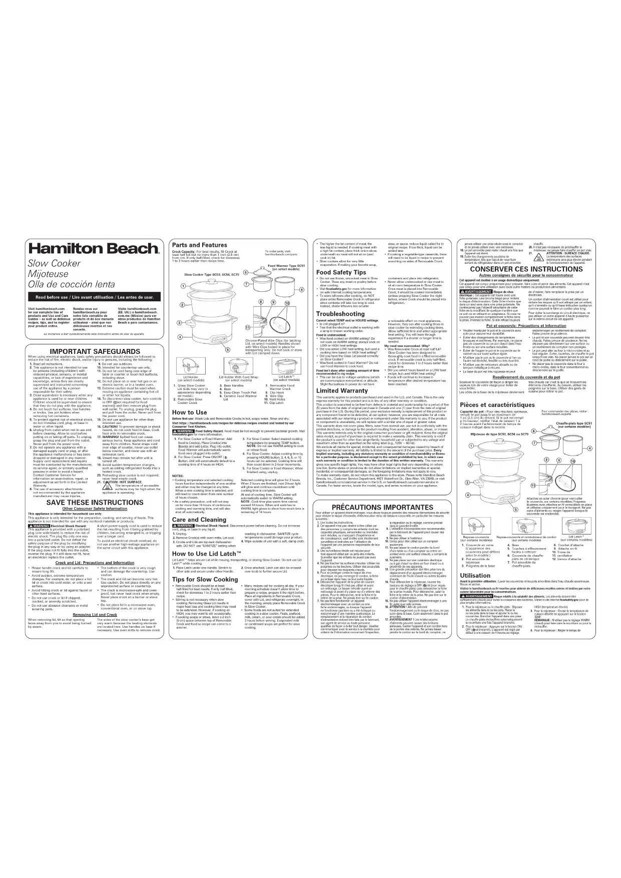 - N’utiliser jamais de viande congelée, non cuite dans la mijoteuse. Dégeler toute viande ou toute volaille avant de la faire mijoter.• Visiter le site foodsafety.gov pour plus d’information au sujet de la température de cuisson interne des aliments.• Pour ranger les restes après la cuisson, ne PAS placer toute le pot amovible au réfrigérateur, car la durée de refroidissement sera trop longue. Séparer les restes en les déposants dans des petits contenants et placer au réfrigérateur.• Ne jamais laisser reposer une viande insuffisamment cuite ou crue dans une mijoteuse à la température ambiante. Une fois la viande déposée dans la cocotte amovible, elle devrait cuire immédiatement (à moins que ce soit pour préparer la mijoteuse la veille, auquel cas le pot devrait être déposée au réfrigérateur). Dépannage Ne peut sélectionner le réglage de TEMP et/ou HOURS.• Est-ce que la fiche de l’appareil est branchée ?• Vérifier que la prise électrique fonctionne bien avec une lampe qui s’allume bien.Les aliments ne sont pas assez cuits.• Est-ce que les aliments ont cuit en réglage WARM (chaud) ? Ne faites pas cuire en réglage WARM (chaud). Faites toujours cuire en réglage LOW (bas) ou HIGH (élevée).• Avez-vous choisi le réglage LOW (bas), tout en utilisant le temps de cuisson adéquat pour un réglage HIGH (élevée) ?• Avez-vous bien placé le couvercle en verre sur la mijoteuse ?• Est-ce que les aliments ont cuits dans le chauffe-plats? Ne pas utiliser le chauffe-plats pour cuire les aliments.Les aliments ne sont pas cuits à la fin du temps de cuisson recommandé dans ma recette.• Ce manque de cuisson est peut-être dû à une variation de voltage (il y en a partout) ou à l’altitude. Les petites fluctuations de courant n’ont pas d’effet notable sur la plupart des appareils électroménagers. Cependant, elles peuvent modifier les temps de cuisson dans la mijoteuse en allongeant ce temps de cuisson. Laisser suffisamment de temps et choisir le bon réglage de température. L’expérience vous apprendra si vous avez besoin de plus ou de moins de temps.Mon repas a trop cuit. Pourquoi ?• Est-ce que le pot amovible était au moins moitié plein ? La mijoteuse est conçue pour bien cuire les aliments dans un pot amovible plein. Si le pot amovible est seulement plein à demi, vérifier la cuisson de vos aliments 1 ou 2 heures avant la fin du temps de recette.• Avez-vous sélectionné une durée de cuisson basée sur une recette à réglage LOW (bas), mais utilisé le réglage de température HIGH (élevée)?• La température des aliments continuera à augmenter après avoir atteint la température désirée. Garantie limitée Cette garantie s’applique aux produits achetés et utilisées aux É.-U. et au Canada. C’est la seule garantie expresse pour ce produit et est en lieu et place de tout autre garantie ou condition. Ce produit est garanti contre tout défaut de matériaux et de main-d’oeuvre pour une période de cinq (5) ans à compter de la date d’achat d’origine au Canada et un (1) an à compter de la date d’achat d’origine aux É.-U. Au cours de cette période, votre recours exclusif se limitera au remplacement de ce produit ou tout autre composant défectueux, à notre discrétion. Cependant, vous êtes responsables des frais associés au retour du produit ou d’un composant en vertu de la présente garantie. Si le produit ou le composant est non disponible, nous le remplacerons avec un article similaire de valeur égale ou supérieure.Cette garantie ne couvre pas le verre, les filtres, l’usure d’un usage normal, l’utilisation non conforme aux directives imprimées, ou des dommages au produit résultant d’un accident, modification, utilisation abusive ou incorrecte. Cette garantie s’applique seulement à l’acheteur original ou à la personne l’ayant reçu en cadeau. La présentation du reçu de vente d’origine comme preuve d’achat est nécessaire pour faire une réclamation au titre de cette garantie. Cette garantie s’annule si le produit est utilisé autrement que par une famille ou si l’appareil est soumis à toute tension ou forme d’onde différente des caractéristiques nominales précisées sur l’étiquette (par ex. : 120 V ~ 60 Hz).Nous excluons toutes les réclamations au titre de cette garantie pour les dommages spéciaux, consécutifs et indirects causés par la violation de garantie expresse ou implicite. Toute responsabilité est limitée au prix d’achat. Chaque garantie implicite, y compris toute garantie ou condition de qualité marchande ou d’adéquation à un usage particulier, est exonérée, sauf dans la mesure interdite par la loi, auquel cas la garantie ou condition est limitée à la durée de cette garantie écrite. Cette garantie vous donne des droits légaux précis. Vous pouvez avoir d’autres droits qui varient selon l’endroit où vous habitez. Certaines provinces ne permettent pas les limitations sur les garanties implicites ou les dommages spéciaux ou indirects de telle sorte que les limitations ci-dessus ne s’appliquent peut-être pas à votre cas.Pour faire une réclamation au titre de la garantie, veuillez ne pas retourner cet appareil au magasin. Veuillez nous écrire à Hamilton Beach Brands, Inc., Customer Service Department, 4421 Waterfront Dr., Glen Allen, VA 23060, ou visiter le site hamiltonbeach.com/customer-service aux États-Unis ou hamiltonbeach.ca/customer-service au Canada. Pour obtenir un service plus rapide, veuillez repérer les numéros de modèle, de type et de séries sur votre appareil. SALVAGUARDIAS IMPORTANTES Cuando utilice aparatos eléctricos, siempre deben seguirse precauciones de seguridad básicas a fin de reducir el riesgo de incendio, descarga eléctrica, y/o lesiones a personas, incluyendo las siguientes:1. Lea todas las instrucciones.2. Este aparato no se destina para utilizarse por personas (incluyendo niños) cuy