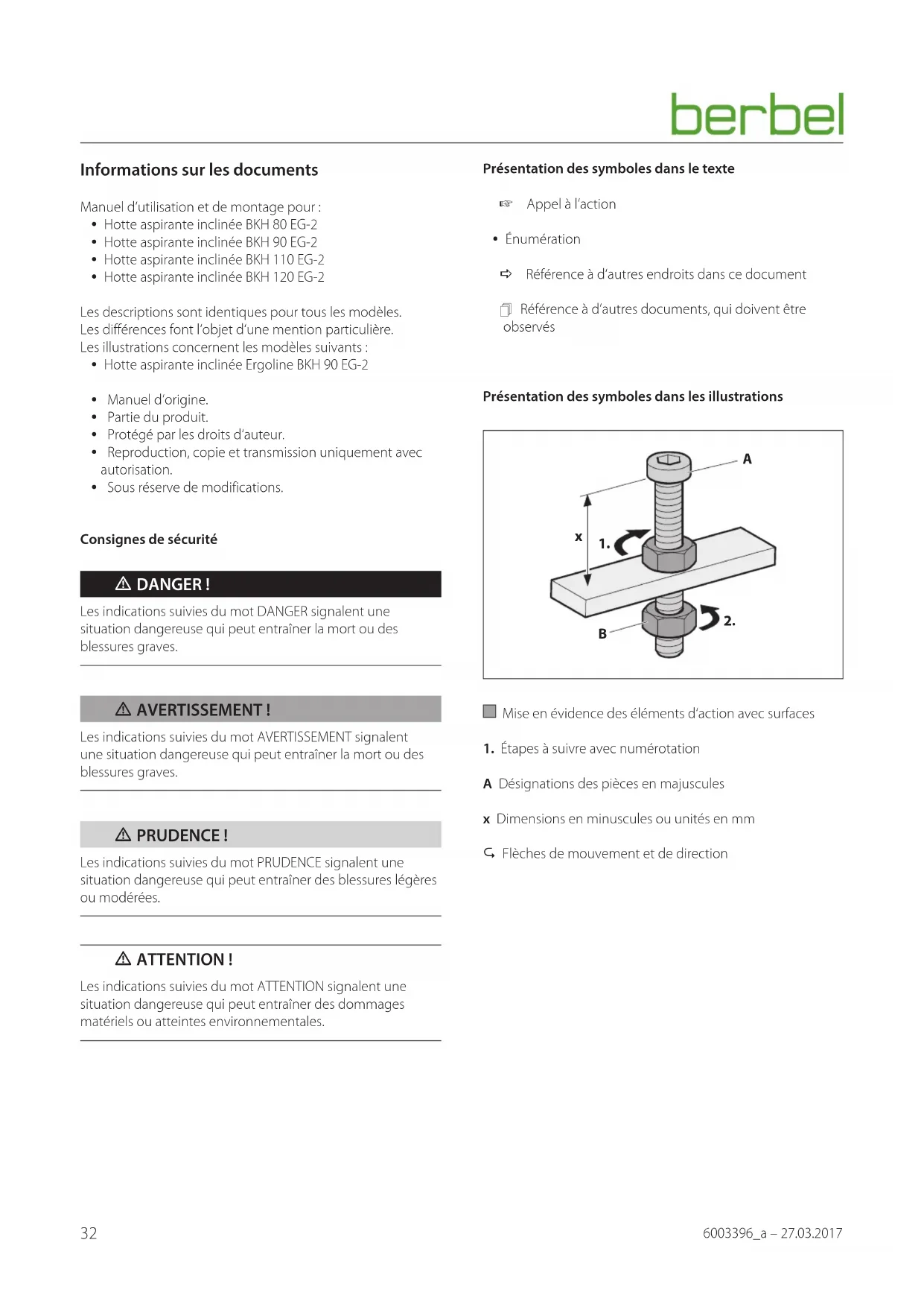 Wenn Sie Anregungen oder Fragen haben, wählen Sie aus folgenden Möglichkeiten: Post: berbel Ablufttechnik GmbH Sandkampstraße 100 D-48432 Rheine Telefon: +49 (0) 5971 / 80 80 9 - 0 Mo bis Do 8:00 – 17:30 Uhr und Fr 8:00 – 16:30 Uhr Telefax: +49 (0) 5971 / 80 80 9 - 10 Internet: www.berbel.de E-Mail: info@berbel.de Kundendienst des Herstellers kontaktieren Sie können unseren Kundendienst auf verschiedene Arten kontaktieren. Wählen Sie aus folgenden Möglichkeiten: Telefon: +49 (0) 5971 / 80 80 9 - 660 Mo bis Do 8:00 – 17:30 Uhr und Fr 8:00 – 16:30 Uhr Telefax: +49 (0) 5971 / 80 80 9 - 10 E-Mail: service@berbel.de32 6003396_a – 27.03.2017 Informations sur les documents Manuel d‘utilisation et de montage pour : y Hotte aspirante inclinée BKH 80 EG-2 y Hotte aspirante inclinée BKH 90 EG-2 y Hotte aspirante inclinée BKH 110 EG-2 y Hotte aspirante inclinée BKH 120 EG-2 Les descriptions sont identiques pour tous les modèles. Les différences font l‘objet d‘une mention particulière. Les illustrations concernent les modèles suivants : y Hotte aspirante inclinée Ergoline BKH 90 EG-2 y Manuel d‘origine. y Partie du produit. y Protégé par les droits d‘auteur. y Reproduction, copie et transmission uniquement avec autorisation. y Sous réserve de modifications. Consignes de sécurité m DANGER! Les indications suivies du mot DANGER signalent une situation dangereuse qui peut entraîner la mort ou des blessures graves. m AVERTISSEMENT! Les indications suivies du mot AVERTISSEMENT signalent une situation dangereuse qui peut entraîner la mort ou des blessures graves. m PRUDENCE! Les indications suivies du mot PRUDENCE signalent une situation dangereuse qui peut entraîner des blessures légères ou modérées. m ATTENTION! Les indications suivies du mot ATTENTION signalent une situation dangereuse qui peut entraîner des dommages matériels ou atteintes environnementales. Présentation des symboles dans le texte Appel à l‘action y Énumération D Référence à d‘autres endroits dans ce document Référence à d‘autres documents, qui doivent être observés Présentation des symboles dans les illustrations