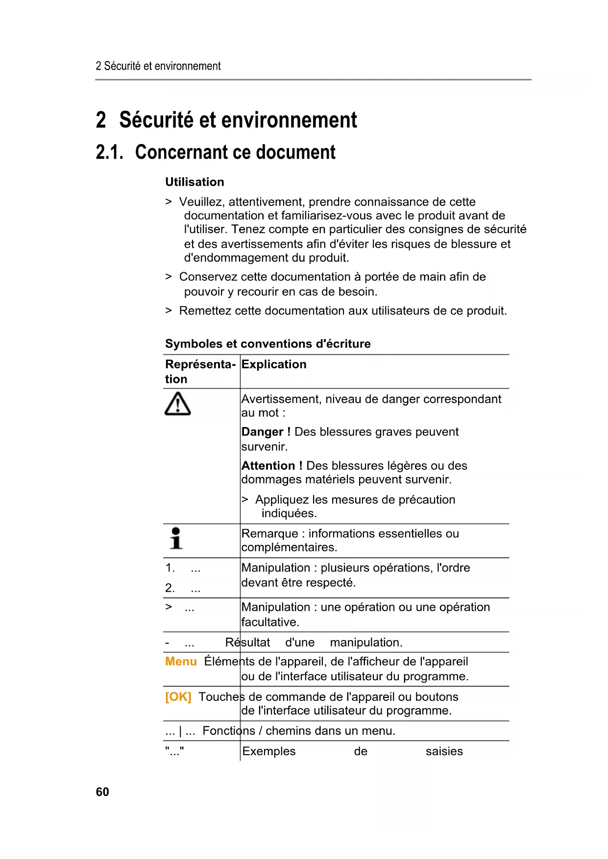 Pos: 2 /TD/Überschr iften/2. Sicher heit und Umwelt @ 0\mod_11737747 19351_201.doc @ 293 @ 1 @ 1 2 Sécurité et environnement Pos: 3 /TD/Überschr iften/2.1 Zu diesem Doku ment @ 0\mod_117377525235 1_201.doc @ 347 @ 2 @ 1 2.1. Concernant ce document Pos: 4 /TD/Sicherhei t und Umwelt/Zu diesem Doku ment/Verwendung/Ver wendung (Standard) @ 0\mod_1173775068554_201. doc @ 338 @ 5 @ 1 Utilisation > Veuillez, attentivement, prendre connaissance de cette documentation et familiarisez-vous avec le produit avant de l'utiliser. Tenez compte en particulier des consignes de sécurité et des avertissements afin d'éviter les risques de blessure et d'endommagement du produit. > Conservez cette documentation à portée de main afin de pouvoir y recourir en cas de besoin. > Remettez cette documentation aux utilisateurs de ce produit. Pos: 5 /TD/Sicherhei t und Umwelt/Zu diesem Doku ment/Symbole und Schr eibkonventionen/Sym bole und Schreibkonv. [S tandard_groß] @ 0\ mod_1174982140622_201. doc @ 516 @ 5 @ 1 Symboles et conventions d'écriture Représenta- tion Explication Avertissement, niveau de danger correspondant au mot : Danger ! Des blessures graves peuvent survenir. Attention ! Des blessures légères ou des dommages matériels peuvent survenir. > Appliquez les mesures de précaution indiquées. Remarque : informations essentielles ou complémentaires.