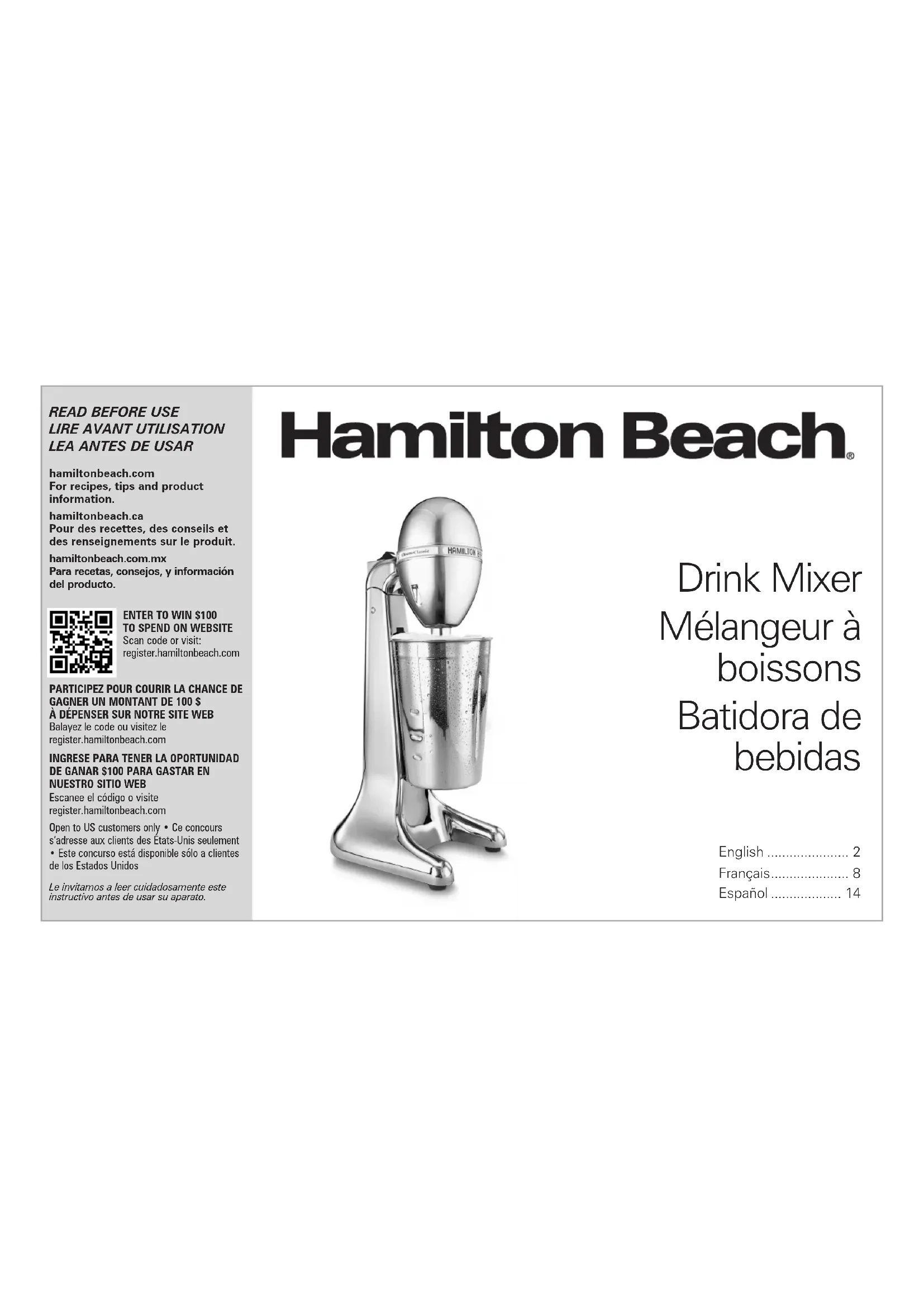 Escanee el código o visite register.hamiltonbeach.com Open to US customers only • Ce concours s’adresse aux clients des États-Unis seulement
