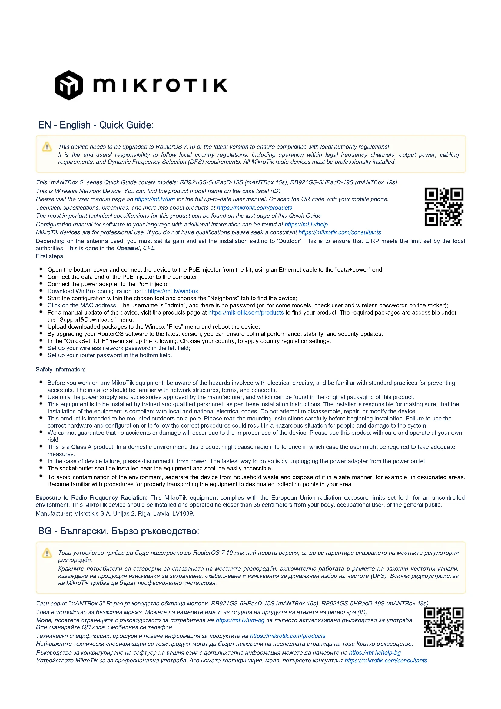 Configurez le mot de passe de votre réseau sans fil dans le champ de gauche; Configurez le mot de passe de votre routeur dans le champ du bas. Information sur la sécurité: Avant de travailler sur un équipement MikroTik, soyez conscient des dangers liés aux circuits électriques et familiarisez-vous avec les pratiques standard de prévention des accidents. Le programme d'installation doit être familiarisé avec les structures, les termes et les concepts du réseau. Utilisez uniquementl'alimentation et accessoires approuvés par le fabricant, etquipeuvent être a trouvé dansl'emballage d'origine de ce produit. Cet équipement doit être installé par du personnel formé et qualifié, conformément à ces instructions d'installation. L'installateur est responsable de s'assurer que l'installation de l'équipement est conforme aux codes électriques locaux et nationaux. N'essayez pas de démonter, réparer ou modifier l'appareil. Ce produit est destiné à être monté à l'extérieur sur un poteau. Veuillez lire attentivement les instructions de montage avant de commencer l'installation. Le fait de ne pas utiliser lematériel et la configuration corrects ou de ne pas suivre les procédures correctes peut entraîner une situation dangereuse pour les .personnes et endommager le système Nous ne pouvons garantir qu'aucun accident ou dommage ne se produira en raison d'une mauvaise utilisation de l'appareil. Veuillez utiliser ce produit avec soin et l'utiliser à vos propres risques! Ceci est un produit de classe A. Dans un environnement domestique, ce produit peut provoquer des interférences radio, auquel cas l'utilisateur peut être amené à prendre des mesures adéquates. En cas de panne de l'appareil, veuillez le déconnecter de l'alimentation. La façon la plus rapide de le faire est de débrancher l'adaptateur secteur de la prise de courant. La prise de courant doit être installée à proximité de l'équipement et doit être facilement accessible. Pour éviter toute contamination de l'environnement, séparez l'appareil des déchets ménagers et jetez-le de manière sûre, par exemple dans des zones désignées. Familiarisez-vous avec les procédures permettant de transporter correctement l'équipement vers les points de collecte désignés dans votre région. cet équipement MikroTik est conforme aux limites d'exposition aux rayonnements Union européenne établies pourExposition aux rayonnements radiofréquences: un environnement non contrôlé. Cet appareil MikroTik doit être installé et utilisé à au moins 35 centimètres de votre corps, de l'utilisateur professionnel ou du grand public. Fabricant: Mikrotikls SIA, Unijas 2, Riga, Lettonie, LV1039. HR - Hrvatski. Brzi vodič: Ovaj kratki vodič serije "mANTBox 5" obuhvaća modele: RB921GS-5HPacD-15S (mANTBox 15s), RB921GS-5HPacD-19S (mANTBox 19s).