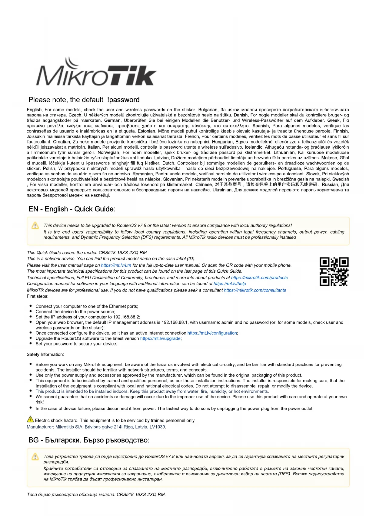 Ceci est un périphérique réseau. Vous pouvez trouver le nom du modèle du produit sur l'étiquette du boîtier (ID). Veuillez visiter la page du manuel d'utilisation sur pour le manuel d'utilisation complet et à jour.https://mt.lv/um-fr Ou scannez le code QR avec votre téléphone portable. Les spécifications techniques les plus importantes de ce produit se trouvent sur la dernière page de ce guide rapide. Spécifications techniques, déclaration de conformité UE complète, brochures et plus d'informations sur les produits sur https://mikrotik.com /products Vous trouverez le manuel de configuration du logiciel dans votre langue avec des informations supplémentaires sur https://mt.lv/help-fr Les appareils MikroTik sont destinés à un usage professionnel. Si vous n'avez pas de qualifications, veuillez consulter un consultant https://mikrotik.com /consultants Premiers pas: Connectez votre ordinateur à l'un des ports Ethernet; Connectez l'appareil à la source d'alimentation; Définissez une adresse IP de votre ordinateur sur 192.168.88.2; Ouvrez votre navigateur Web, l'adresse IP de gestion par défaut est 192.168.88.1, avec le nom d'utilisateur et aucun mot de passe; admin