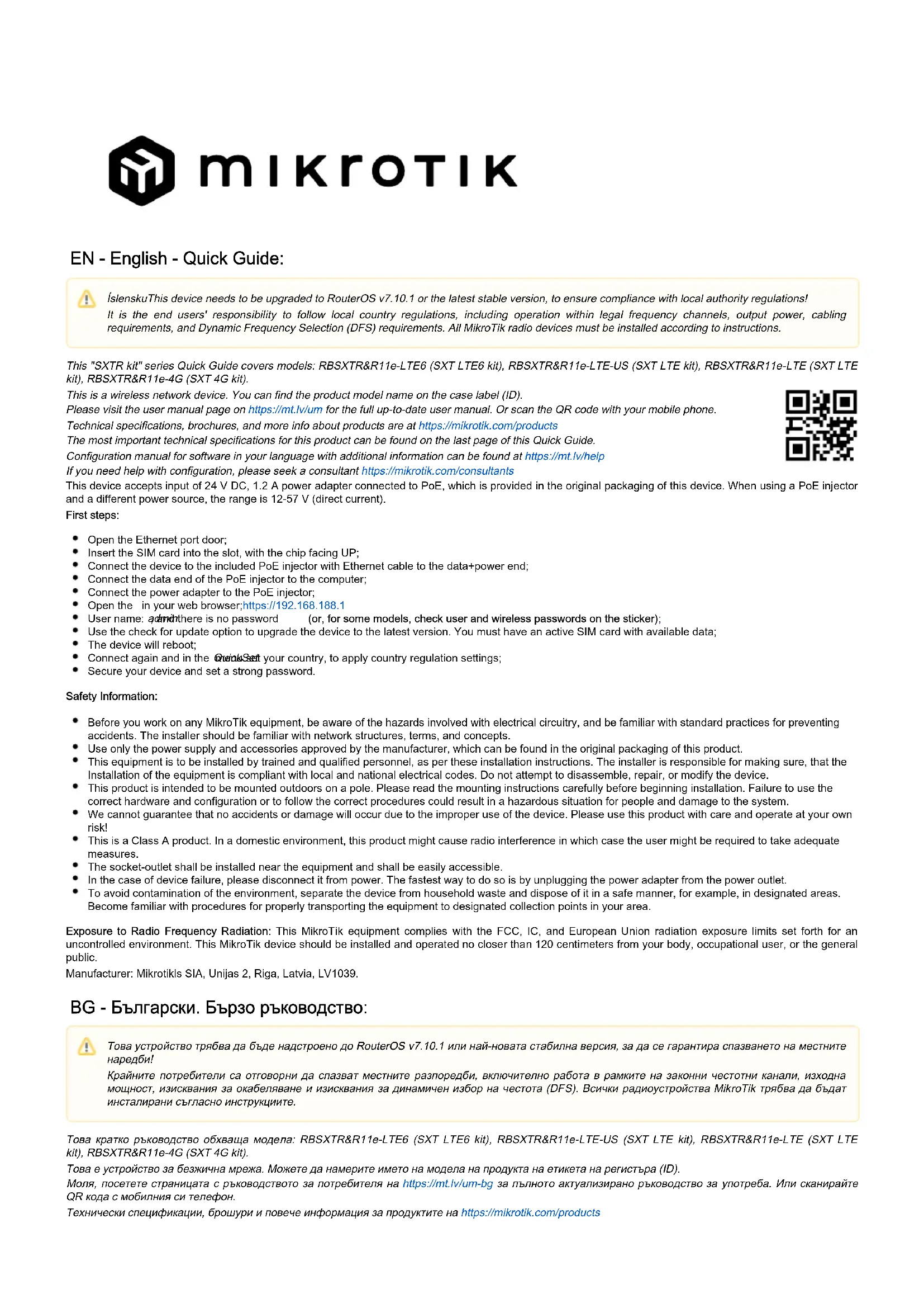 Il s'agit d'un périphérique réseau sans fil. Vous pouvez trouver le nom du modèle du produit sur l'étiquette du boîtier (ID). Veuillez visiter la page du manuel d'utilisation sur pour le manuel d'utilisation complet et à jour.https://mt.lv/um-fr Ou scannez le code QR avec votre téléphone portable. Spécifications techniques, brochures et plus d'informations sur les produits surhttps://mikrotik.com/products Les spécifications techniques les plus importantes de ce produit se trouvent sur la dernière page de ce guide rapide. Vous trouverez le manuel de configuration du logiciel dans votre langue avec des informations supplémentaires sur https://mt.lv/help-fr Si vous avez besoin d'aide pour la configuration, veuillez consulter un consultant https://mikrotik.com/consultants Cet appareil accepte une entrée d'alimentation 24 V CC, 1.2 A connectée à PoE, qui est fournie dans l'emballage d'origine de cet appareil. Lorsque vous utilisez un injecteur PoE et une source d'alimentation différente, la plage est de 12 à 57 V (courant continu). Premiers pas: Ouvrez la porte du port Ethernet; Insérez la carte SIM dans la fente, la puce orientée vers le HAUT; Connectez l'appareil à l'injecteur PoE fourni avec un câble Ethernet à l'extrémité data + power; Connectez l'extrémité de données de l'injecteur PoE à l'ordinateur; Connectez l'adaptateur d'alimentation à l'injecteur PoE; Ouvrez le dans votre navigateur Web;https://192.168.188.1 Nom d'utilisateur: , et il n'y a pas de mot de passe admin (ou, pour certains modèles, vérifiez les mots de passe utilisateur et sans fil sur l'autocollant); Utilisez l'option Vérifier la mise à jour pour mettre à niveau l'appareil vers la dernière version. Vous devez avoir une carte SIM active avec les données disponibles; L'appareil va redémarrer; Connectez-vous à nouveau et définissez votre pays dans le menu pour appliquer les paramètres de réglementation du pays; QuickSet Sécurisez votre appareil et définissez un mot de passe fort. Information sur la sécurité: Avant de travailler sur un équipement MikroTik, soyez conscient des dangers liés aux circuits électriques et familiarisez-vous avec les pratiques standard de prévention des accidents. Le programme d'installation doit être familiarisé avec les structures, les termes et les concepts du réseau. Utilisez uniquementl'alimentation et accessoires approuvés par le fabricant,etquipeuvent être a trouvé dansl'emballage d'origine de ce produit. Cet équipement doit être installé par du personnel formé et qualifié, conformément à ces instructions d'installation. L'installateur est responsable de s'assurer que l'installation de l'équipement est conforme aux codes électriques locaux et nationaux. N'essayez pas de démonter, réparer ou modifier l'appareil. Ce produit est destiné à être monté à l'extérieur sur un poteau. Veuillez lire attentivement les instructions de montage avant de commencer l'installation. Le fait de ne pas utiliser lematériel et la configuration corrects ou de ne pas suivre les procédures correctes peut entraîner une situation dangereuse pour les .personnes et endommager le système Nous ne pouvons garantir qu'aucun accident ou dommage ne se produira en raison d'une mauvaise utilisation de l'appareil. Veuillez utiliser ce produit avec soin et l'utiliser à vos propres risques! Ceci est un produit de classe A. Dans un environnement domestique, ce produit peut provoquer des interférences radio, auquel cas l'utilisateur peut être amené à prendre des mesures adéquates. La prise de courant doit être installée à proximité de l'équipement et doit être facilement accessible. En cas de panne de l'appareil, veuillez le déconnecter de l'alimentation.La façon la plus rapide de le faire est de débrancher l'adaptateur secteur de la prise de courant. Pour éviter la contamination de l'environnement, séparez l'appareil des déchets ménagers et éliminez-le de manière sûre, par exemple dans des zones désignées. Familiarisez-vous avec les procédures pour transporter correctement l'équipement vers les points de collecte désignés dans votre région. cet équipement MikroTik est conforme aux limites d'exposition aux rayonnements FCC, IC et Union européenneExposition aux rayonnements radiofréquences: établies pour un environnement non contrôlé. Cet appareil MikroTik doit être installé et utilisé à au moins 120 centimètres de votre corps, de l'utilisateur professionnel ou du grand public. Fabricant: Mikrotikls SIA, Unijas 2, Riga, Lettonie, LV1039. HR - Hrvatski. Brzi vodič: Ovaj kratki vodič pokriva model: RBSXTR&R11e-LTE6 (SXT LTE6 kit), RBSXTR&R11e-LTE-US (SXT LTE kit), RBSXTR&R11e-LTE (SXT LTE kit),RBSXTR&R11e-4G (SXT 4G kit).