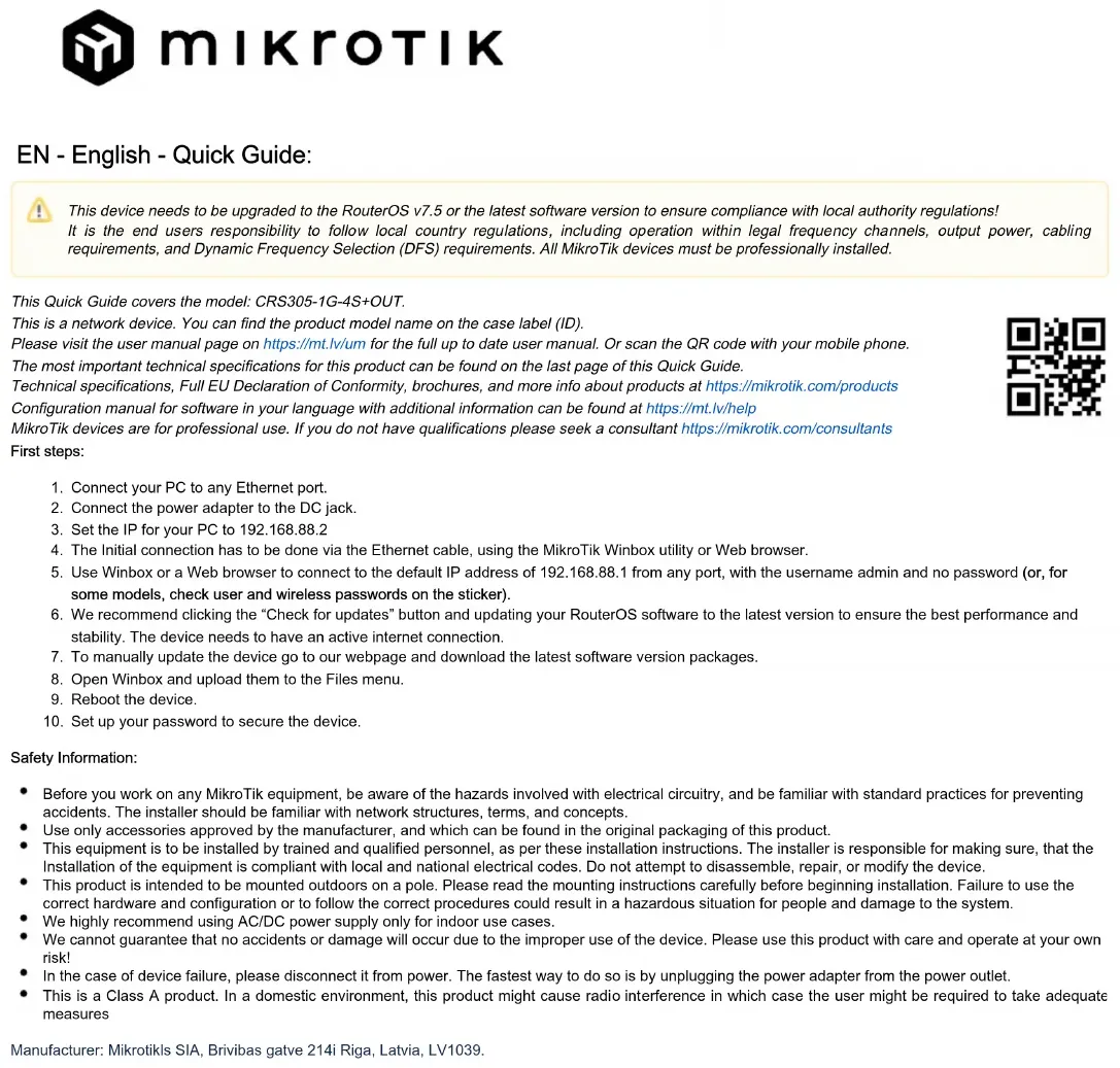 Ceci est un périphérique réseau. Vous pouvez trouver le nom du modèle du produit sur l'étiquette du boîtier (ID). Veuillez visiter la page du manuel d'utilisation sur pour le manuel d'utilisation complet et à jour.https://mt.lv/um-fr Ou scannez le code QR avec votre téléphone portable. Les spécifications techniques les plus importantes de ce produit se trouvent sur la dernière page de ce guide rapide. Spécifications techniques, déclaration de conformité UE complète, brochures et plus d'informations sur les produits sur https://mikrotik.com /products Vous trouverez le manuel de configuration du logiciel dans votre langue avec des informations supplémentaires sur https://mt.lv/help-fr Les appareils MikroTik sont destinés à un usage professionnel. Si vous n'avez pas de qualifications, veuillez consulter un consultant https://mikrotik.com /consultants Premiers pas: Tämä laite on päivitettävä RouterOS v7.5:een tai uusimpaan ohjelmistoversioon paikallisten viranomaisten säädösten noudattamisen varmistamiseksi! Loppukäyttäjien vastuulla on noudattaa paikallisia maalakeja, mukaan lukien toiminta laillisilla taajuuskanavilla, lähtöteho, kaapelointivaatimukset ja dynaamisen taajuuden valinnan (DFS) vaatimukset. Kaikki MikroTik-laitteet on asennettava ammattimaisesti. Cet appareil doit être mis à niveau vers RouterOS v7.5 ou la dernière version du logiciel pour garantir la conformité aux réglementations des autorités locales ! Il est de la responsabilité des utilisateurs finaux de suivre les réglementations locales du pays, y compris le fonctionnement dans les canaux de fréquence légaux, la sortie les exigences d'alimentation, de câblage et de sélection dynamique de fréquence (DFS). Tous les appareils MikroTik doivent être installés par des professionnels.1.