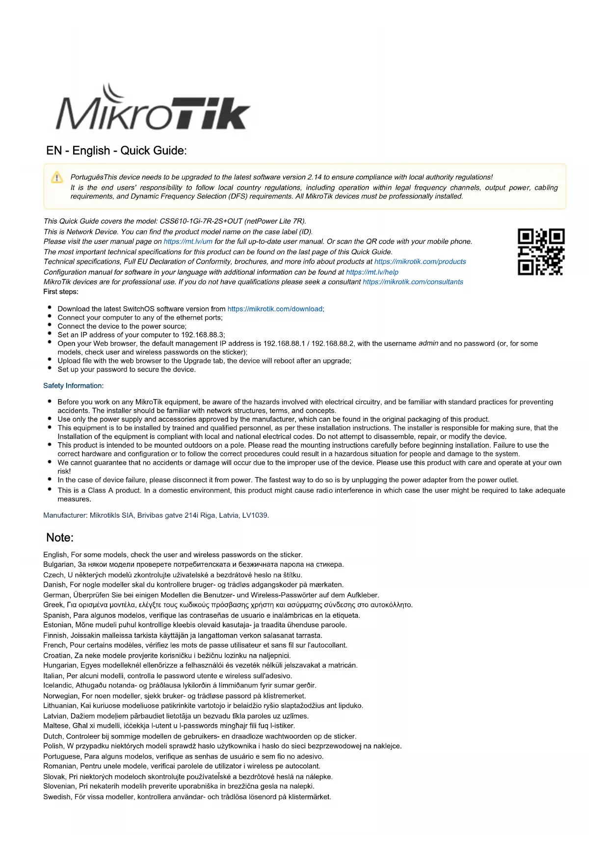 Ceci est un périphérique réseau. Vous pouvez trouver le nom du modèle du produit sur l'étiquette du boîtier (ID). Veuillez visiter la page du manuel d'utilisation sur pour le manuel d'utilisation complet et à jour.https://mt.lv/um-fr Ou scannez le code QR avec votre téléphone portable. Les spécifications techniques les plus importantes de ce produit se trouvent sur la dernière page de ce guide rapide. Spécifications techniques, déclaration de conformité UE complète, brochures et plus d'informations sur les produits sur https://mikrotik.com /products Tämä laite on päivitettävä uusimpaan ohjelmistoversioon 2.14, jotta voidaan varmistaa paikallisten viranomaisten määräysten noudattaminen! Loppukäyttäjien vastuulla on noudattaa paikallisia maalakeja, mukaan lukien toiminta laillisilla taajuuskanavilla, lähtöteho, kaapelointivaatimukset ja dynaamisen taajuuden valinnan (DFS) vaatimukset. Kaikki MikroTik-laitteet on asennettava ammattimaisesti. Cet appareil doit être mis à niveau vers la dernière version 2.14 du logiciel pour garantir la conformité aux réglementations des autorités locales! Il est de la responsabilité des utilisateurs finaux de suivre les réglementations locales du pays, y compris le fonctionnement dans les canaux de fréquence légaux, la sortie les exigences d'alimentation, de câblage et de sélection dynamique de fréquence (DFS). Tous les appareils MikroTik doivent être installés par des professionnels.Vous trouverez le manuel de configuration du logiciel dans votre langue avec des informations supplémentaires sur https://mt.lv/help-fr Les appareils MikroTik sont destinés à un usage professionnel. Si vous n'avez pas de qualifications, veuillez consulter un consultant https://mikrotik.com /consultants Premiers pas: Téléchargez la dernière version du logiciel SwitchOS sur https://mikrotik.com/download; Connectez votre ordinateur à l'un des ports Ethernet; Connectez l'appareil à la source d'alimentation; Définissez une adresse IP de votre ordinateur sur 192.168.88.3; Ouvrez votre navigateur Web, l'adresse IP de gestion par défaut est 192.168.88.1 / 192.168.88.2, avec le nom d'utilisateur et aucun mot de passe; admin Téléchargez le fichier avec le navigateur Web dans l' onglet Mise à Update, l'appareil redémarrera après une mise à niveau; Configurez votre mot de passe pour sécuriser l'appareil. Information sur la sécurité: Avant de travailler sur un équipement MikroTik, soyez conscient des dangers liés aux circuits électriques et familiarisez-vous avec les pratiques standard de prévention des accidents.Le programme d'installation doit être familiarisé avec les structures, les termes et les concepts du réseau. Utilisez uniquement l'alimentation et les accessoires approuvés par le fabricant et qui se trouvent dans l'emballage d'origine de ce produit. Cet équipement doit être installé par du personnel formé et qualifié, conformément à ces instructions d'installation.L'installateur est responsable de s'assurer que l'installation de l'équipement est conforme aux codes électriques locaux et nationaux. N'essayez pas de démonter, réparer ou modifier l'appareil. Ce produit est destiné à être monté à l'extérieur sur un poteau. Veuillez lire attentivement les instructions de montage avant de commencer l'installation. Le fait de ne pas utiliser le matériel et la configuration appropriés ou de ne pas suivre les procédures correctes peut entraîner une situation dangereuse pour les personnes et endommager le système. Nous ne pouvons garantir qu'aucun accident ou dommage ne se produira en raison d'une mauvaise utilisation de l'appareil.Veuillez utiliser ce produit avec soin et l'utiliser à vos propres risques! En cas de panne de l'appareil, veuillez le déconnecter de l'alimentation.La façon la plus rapide de le faire est de débrancher l'adaptateur secteur de la prise de courant. Ceci est un produit de classe A.Dans un environnement domestique, ce produit peut provoquer des interférences radio, auquel cas l'utilisateur peut être amené à prendre des mesures adéquates. Fabricant: Mikrotikls SIA, Brivibas gatve 214i Riga, Lettonie, LV1039. HR - Hrvatski. Brzi vodič: Ovaj brzi vodič pokriva model: CSS610-1Gi-7R-2S+OUT (netPower Lite 7R).