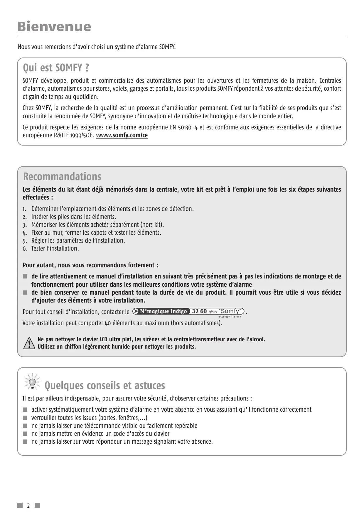 Manuel d’installation et d’utilisation Bienvenue Nous vous remercions d’avoir choisi un système d’alarme SOMFY. Qui est SOMFY ? SOMFY développe, produit et commercialise des automatismes pour les ouvertures et les fermetures de la maison. Centrales d’alarme, automatismes pour stores, volets, garages et portails, tous les produits SOMFY répondent à vos attentes de sécurité, confort et gain de temps au quotidien. Chez SOMFY, la recherche de la qualité est un processus d’amélioration permanent. C’est sur la fiabilité de ses produits que s’est construite la renommée de SOMFY, synonyme d’innovation et de maîtrise technologique dans le monde entier. Ce produit respecte les exigences de la norme européenne EN 50130-4 et est conforme aux exigences essentielles de la directive européenne R&TTE 1999/5/CE. www.somfy.com/ce Recommandations Les éléments du kit étant déjà mémorisés dans la centrale, votre kit est prêt à l’emploi une fois les six étapes suivantes effectuées :