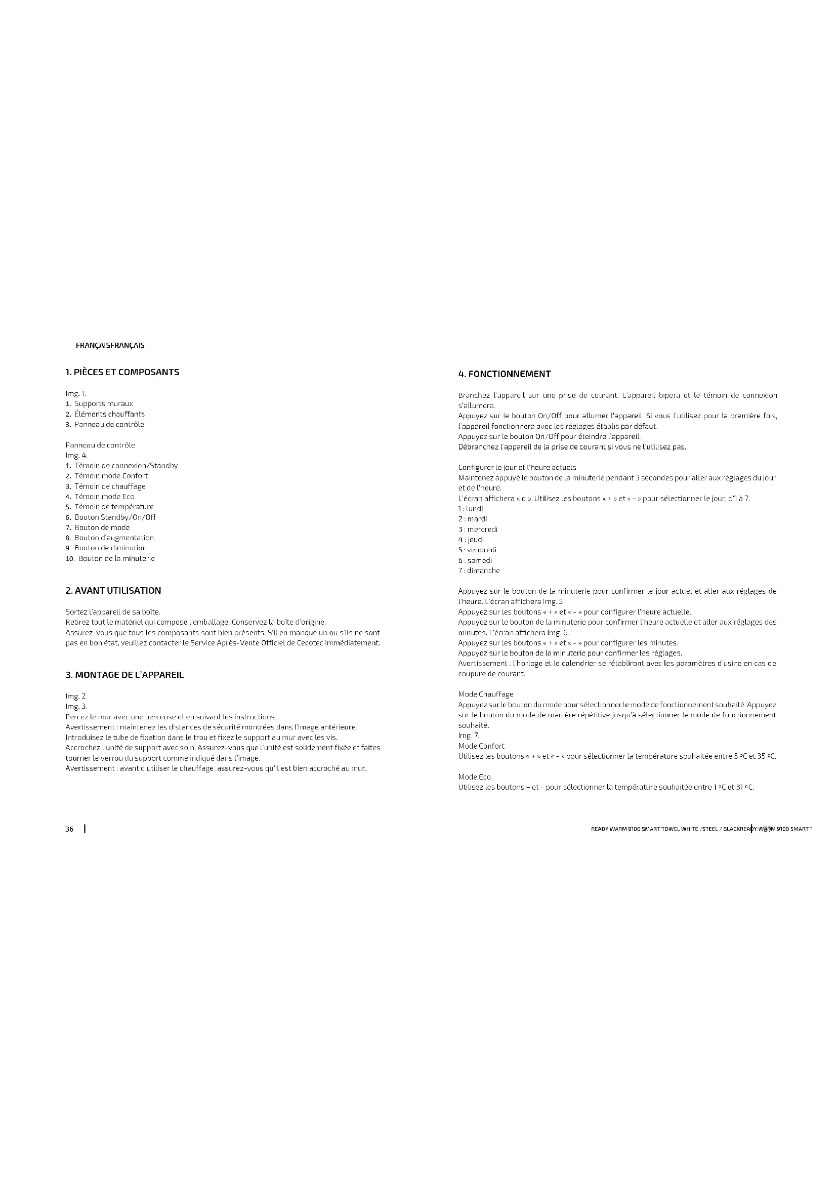 coupure de courant. Mode Chauffage Appuyez sur le bouton du mode pour sélectionner le mode de fonctionnement souhaité. Appuyez sur le bouton du mode de manière répétitive jusqu’à sélectionner le mode de fonctionnement souhaité. Img. 7. Mode Confort Utilisez les boutons «+» et «-» pour sélectionner la température souhaitée entre 5 ºC et 35 ºC. Mode Eco Utilisez les boutons + et - pour sélectionner la température souhaitée entre 1 ºC et 31 ºC.READY WARM 9100 SMART TOWEL WHITE /STEEL / BLACKREADY WARM 9100 SMART TOWEL WHITE /STEEL / BLACK