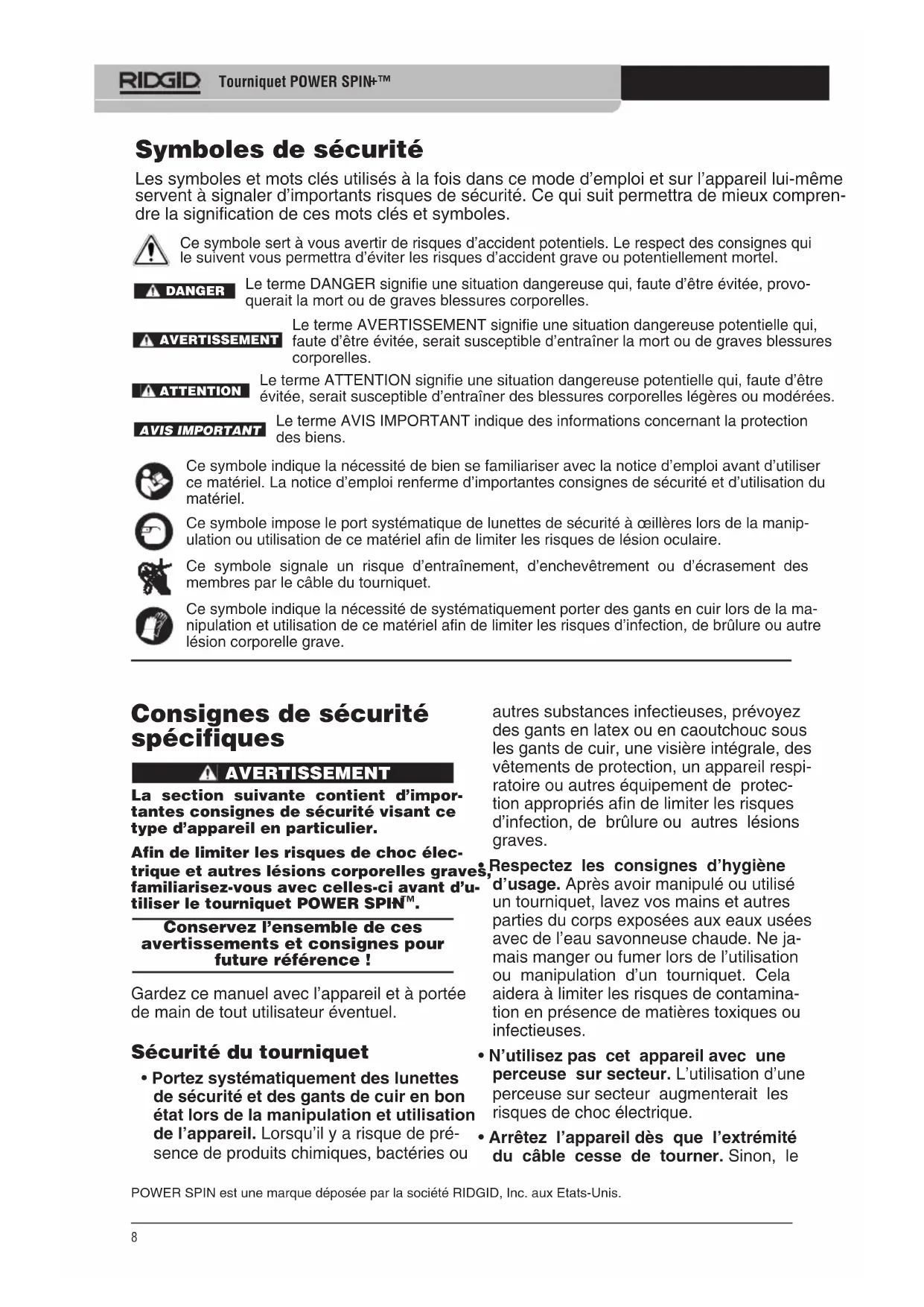 - Portez systématiquement des lunettes de sécurité et des gants de cuir en bon état lors de la manipulation et utilisation de l’appareil. Lorsqu’il y a risque de pré- sence de produits chimiques, bactéries ou POWER SPIN est une marque déposée par la société RIDGID, Inc. aux Etats-Unis. Tourniquet POWER SPIN