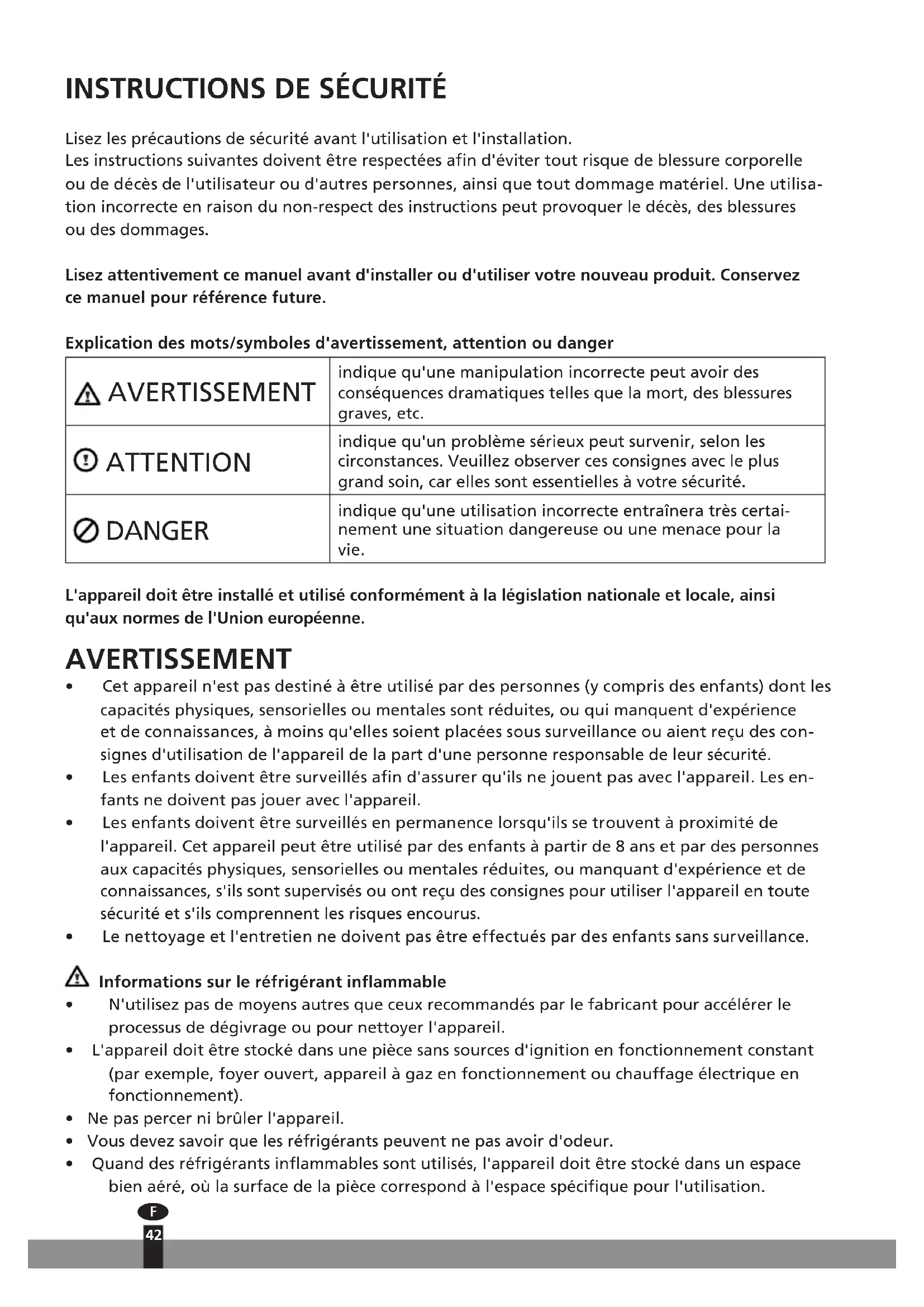 Lisez les précautions de sécurité avant l'utilisation et l'installation. Les instructions suivantes doivent être respectées an d'éviter tout risque de blessure corporelle ou de décès de l'utilisateur ou d'autres personnes, ainsi que tout dommage matériel. Une utilisa- tion incorrecte en raison du non-respect des instructions peut provoquer le décès, des blessures ou des dommages. Lisez attentivement ce manuel avant d'installer ou d'utiliser votre nouveau produit. Conservez ce manuel pour référence future. Explication des mots/symboles d'avertissement, attention ou danger AVERTISSEMENT indique qu'une manipulation incorrecte peut avoir des conséquences dramatiques telles que la mort, des blessures graves, etc. ATTENTION indique qu'un problème sérieux peut survenir, selon les circonstances. Veuillez observer ces consignes avec le plus grand soin, car elles sont essentielles à votre sécurité. DANGER indique qu'une utilisation incorrecte entraînera très certai- nement une situation dangereuse ou une menace pour la vie. L'appareil doit être installé et utilisé conformément à la législation nationale et locale, ainsi qu'aux normes de l'Union européenne. AVERTISSEMENT