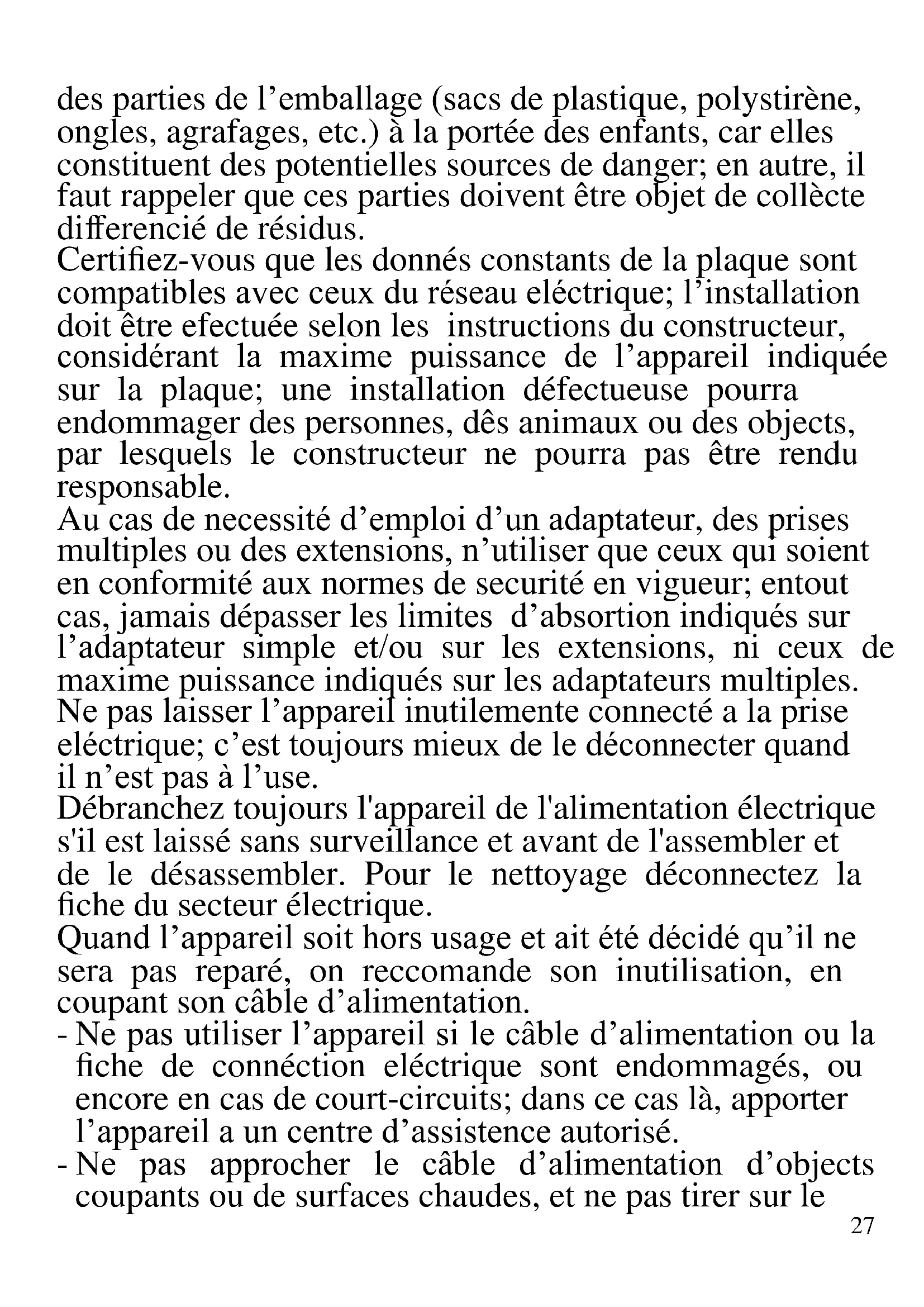 FRANCAIS: AVERTISSEMENT Les indications suivantes sont très importantes en ce qui concerne l’installation, usage et manutention de cet appareil; gardez soigneusement ce manuel pour des futures consultations; n’utilisez pas l’appareil que selon les indications de ce manuel d’instructions; n’importe quel autre type d’ utilisation devra être consideré inaproprié et potentiellement dangereux; pour cette raison le constructeur ne pourra pas être rendu responsable si des dommages résultants de l’utilisation inapropriée ou irresponsable de l’appareil se produisent. Avant de l’utilisation, certifiez-vous de l’integrité de l’appareil; en cas de doute ne l’utilisez pas et addressez- vous a l’assistence téchnique autoriséa; ne laissez pas27 des parties de l’emballage (sacs de plastique, polystirène, ongles, agrafages, etc.) à la portée des enfants, car elles constituent des potentielles sources de danger; en autre, il faut rappeler que ces parties doivent être objet de collècte differencié de résidus. Certifiez-vous que les donnés constants de la plaque sont compatibles avec ceux du réseau eléctrique; l’installation doit être efectuée selon les instructions du constructeur, considérant la maxime puissance de l’appareil indiquée sur la plaque; une installation défectueuse pourra endommager des personnes, dês animaux ou des objects, par lesquels le constructeur ne pourra pas être rendu responsable. Au cas de necessité d’emploi d’un adaptateur, des prises multiples ou des extensions, n’utiliser que ceux qui soient en conformité aux normes de securité en vigueur; entout cas, jamais dépasser les limites d’absortion indiqués sur l’adaptateur simple et/ou sur les extensions, ni ceux de maxime puissance indiqués sur les adaptateurs multiples. Ne pas laisser l’appareil inutilemente connecté a la prise eléctrique; c’est toujours mieux de le déconnecter quand il n’est pas à l’use. Débranchez toujours l'appareil de l'alimentation électrique s'il est laissé sans surveillance et avant de l'assembler et de le désassembler. Pour le nettoyage déconnectez la fiche du secteur électrique. Quand l’appareil soit hors usage et ait été décidé qu’il ne sera pas reparé, on reccomande son inutilisation, en coupant son câble d’alimentation. - Ne pas utiliser l’appareil si le câble d’alimentation ou la fiche de connéction eléctrique sont endommagés, ou encore en cas de court-circuits; dans ce cas là, apporter l’appareil a un centre d’assistence autorisé. - Ne pas approcher le câble d’alimentation d’objects coupants ou de surfaces chaudes, et ne pas tirer sur le28 cordon d’alimentation pour le débrancher de la prise. Ne le laissez pas pendre du plan de travail où un enfant pourrait le tenir. - L’appareil n’est pas indiqué pour être exposé à des conditions météorologiques défavorables (pluie, vent, humidité, la glace, etc.); Gardez-le dans un endroit sec. Jamais opérer ou même toucher l’appareil avec les mains mouillées ou les pieds nus. - Cet appareil peut être utilisé par des enfants agés de plus de 8 ans et par des personnes avec une réduite capacité phisique, sensorial ou mental, ou encore avec peu d’expérience à son usage, pourvu qu’une supervision adéquate leur en soit assuré, ou s’ils auraient été instruits à l’usage de l’appareil en complete securité. Les opérations de nettoyage e de manutention ne oivent pás être efectués par des enfants, sauf pour ceux qui sont agés de plus de 8 ans et sont supervisionés. - Les enfants ne doivent pas jouer avec cet appareil. - Gardez l’appareil et le câble d’alimentation hors la portée des enfants agés de moins de 8 ans. - L’appareil est pour l’usage domestique et intérieur. - Cet appareil peut être utilisé par des personnes ayant des capacités physiques, sensorielles ou mentales réduites, ou qui manquent d'expérience ou de connaissances, si elles ont été correctement supervisées ou ont reçu des instructions pour utiliser cet appareil en toute sécurité. Au cas de panne et/ou de mauvais fonctionnement, ne pas intervenir sur l’ appareil. Pour une éventuel réparation s’addresser uniquement a un centre autorisé par le constructeur, en demandant dês pièces de remplacement originaux. Le non respect de ces indications peut compromettre la securité de l’appareil e rendre invalides les termes de la garantie. - Cet appareil est destiné à être utilisé dans les ménages et des applications similaires: les cuisines du personnel29 dans les magasins, bureaux et autres environnements de travail, pour les clients dans les hôtels, motels et autres environnements de type résidentiel, de type lit et petit- déjeuner, hébergement. - L’appareil n’est pas conçu pour être utilisé avec une minuterie extérieure ou une commande à distance. - N’utiliser que des accéssoires e pièces d’origine. - Avant chaque utilisation, effectuez le cordon d'alimentation. Ne soumettez pas le produit à des chocs susceptibles de l'endommager. - Ne pas utiliser sous ou près des matériaux inflammables comme des rideaux, sources de chaleur, endroits froids et vapeur. -Placer toujours les aliments à cuir dans le récipient afin d’éviter qu’ils touchent la partie chauffante. -Ne pas couvrir les ouvertures de ventilation quand l’appareil est en fonction. -Ne pas remplir le récipient avec de l’huile : risque d’incendie. Ne pas toucher la partie intérieure de l’appareil quand il est en fonction.