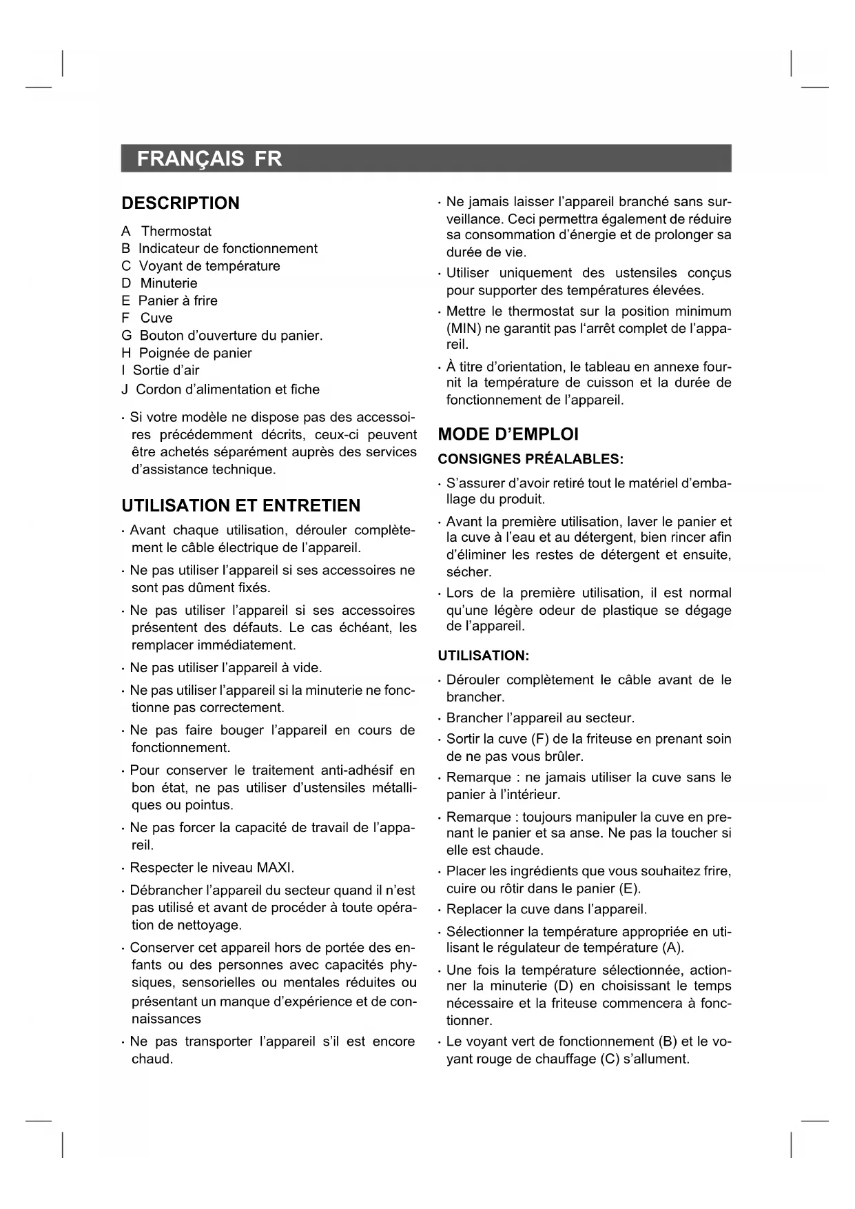 - NOTE : Noter que ces paramètres sont pu- rement indicatifs. Les aliments peuvent être d’origine, de taille, de forme et de marques différentes, par conséquent, nous ne pouvons donc pas garantir les meilleurs paramètres pour chaque aliment spécique.FR Quantité (g) Temps (min) Température (°C) Mélanger Autres informations Pommes de terre Frites fines surgelées 300-700 9-16 200 Mezclar Frites épaisses surgelées 300-700 11-20 200 Mezclar Frites maison (8x8 mm) 300-800 16-20 200 Mezclar Ajouter une demie cuillère d’huile Quartiers de pommes de terre maison 300-800 18-22 180 Mezclar Ajouter une demie cuillère d’huile Cubes de pommes de terre maison 300-750 12-18 180 Mezclar Ajouter une demie cuillère d’huile Rôti 250 15-18 180 Mezclar Pommes de terre gratinées 500 15-18 200 Mezclar Viande et volailles Bifteck 100-500 8-12 180 Côtes de porc 100-500 10-14 180 Hamburgers 100-500 7-14 180 Rouleaux de saucisse 100-500 13-15 180 Cuisses de poulet 100-500 18-22 180 Blanc de poulet 100-500 10-15 180 Collations Rouleaux de printemps 100-400 8-10 200 Mezclar Utiliser des préparations pour four Nuggets de poulet surgelés 100-500 6-10 200 Mezclar Utiliser des préparations pour four Bâtonnets de poisson surgelés 100-400 6-10 200 Utiliser des préparations pour four Bâtonnets de fromage panés surgelés 100-400 8-10 180 Utiliser des préparations pour four Légumes farcis 100-400 10 160 Réchauffage Utiliser un moule à pâtisserie Gâteau 300 20-25 160 Utiliser un moule à pâtisserie/plat de cuisson Quiche 400 20-22 180 Utiliser un moule à pâtisserie Muffins 300 15-18 200 Utiliser un moule à pâtisserie/plat de cuissonFR Problème Cause possible Solution La FRITEUSE À AIR ne fonctionne pas. L’appareil n’est pas branché. Brancher l'appareil à une prise de terre. La minuterie n'est pas réglée. Pour allumer l'appareil, régler la minuterie sur le temps de préparation requis. Les aliments frits dans la FRITEUSE À AIR ne sont pas complètement cuits. La quantité de nourriture placée dans le panier est excessive. Mettre moins d'ingrédients dans le panier. Les petites quantités sont plus faciles à secouer et permettent une friture uniforme. La température sélectionnée est trop basse. Tourner le bouton de réglage de la température sur la position adaptée. Réglage de la température: voir le guide de cuisson. La friture n’est pas uniforme. Certains ingrédients doivent être agités à la moitié du temps de préparation. Lorsque les aliments sont superposés (par exemple, des frites), ils doivent être remués à la moitié du temps de préparation. Les frites ne sont pas croustillantes. Mauvais type d'aliment utilisé. Consulter la méthode de préparation des aliments du fabricant. La casserole/panier ne peut pas être inséré(e) dans l'appareil. Panier surchargé. Ne pas remplir le panier au-dessus de l'indication MAX. Le panier n'est pas placé correctement dans la casserole. Appuyer sur le panier dans la casserole jusqu'à entendrez un déclic. De la fumée blanche sort de l'appareil. Des ingrédients riches en huile sont en cours de préparation. De l'huile a été ajoutée à la préparation. Ne pas utiliser d'aliments riches en huile ou ne pas ajouter d'huile plus que strictement nécessaire. Cette friteuse utilise une technologie qui nécessite peu ou pas d'huile. La casserole contient encore des traces de graisse de l'utilisation précédente. La fumée blanche est causée par la graisse qui chauffe dans la casserole.DEUTSCH DE BEZEICHNUNG A Thermostat B Betriebsleuchtanzeige C Kontrollleuchte Erhitzer D Timer E Frittierkorb F Wanne G Öffnungstaste des Korbes H Frittierkorbgriff I Luftaustritt J Stromkabel und Stecker