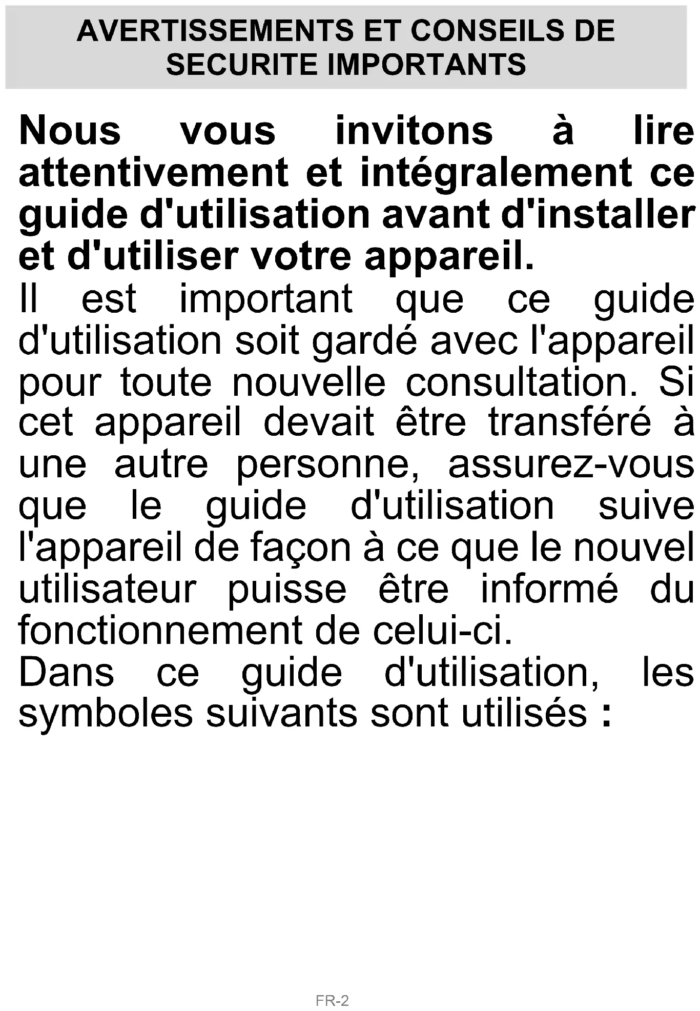 GUIDE D'UTILISATION / User manualFR-2 Nous vous invitons à lire attentivement et intégralement ce guide d'utilisation avant d'installer et d'utiliser votre appareil. Il est important que ce guide d'utilisation soit gardé avec l'appareil pour toute nouvelle consultation. Si cet appareil devait être transféré à une autre personne, assurez-vous que le guide d'utilisation suive l'appareil de façon à ce que le nouvel utilisateur puisse être informé du fonctionnement de celui-ci. Dans ce guide d'utilisation, les symboles suivants sont utilisés :