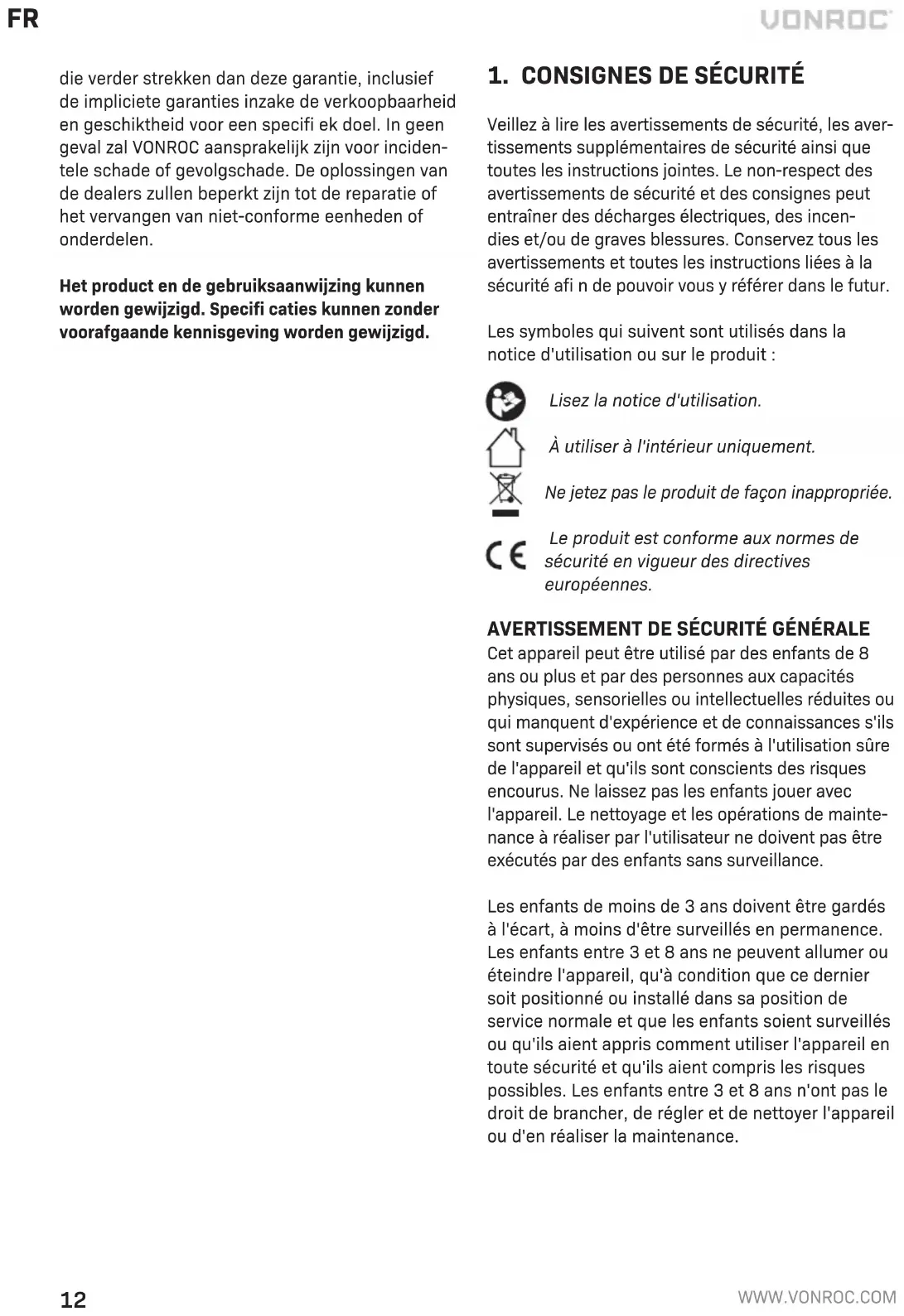 - N'utilisez pas d'aérosols, de solvants, d'alcool ou de produits abrasifs. ENVIRONNEMENT Les appareils électriques et électroniques défectueux ou en fi n de vie doivent être rapportés dans des sites de recyclage appropriés. Pour les pays de la Communauté Européenne uniquement Ne pas jeter les outils électriques avec les déchets ménagers. Conformément àla Directive Européenne 2012/19/UE relative àl'élimination des déchets élec- triques et électroniques et àsa transposition dans la législation nationale, les outils électriques usagés doivent être collectés séparément et être jetés de façon écologique. GARANTIE Les produits VONROC sont développés avec les normes de qualité les plus hautes et ils sont garantis pour être exempts de défaut de pièces et de main d'œuvre pour la durée stipulée par la loi et àcompter de la date d'achat initiale. Si, au cours de cette période, le produit devait rencontrer une quelconque panne due àun défaut de pièce ou de main d'œuvre, contactez VONROC directement.FR